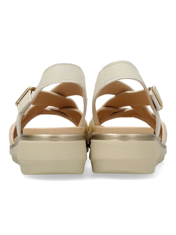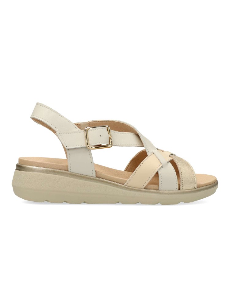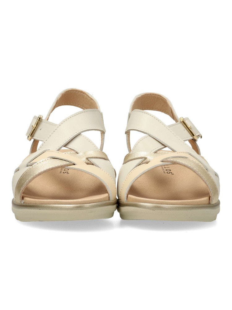 Sandalia cómoda de mujer, con cierre de hebilla. Fabricado en piel de primera calidad, con suela de goma. Cuña de 4 cm. Planta acolchada. Color hielo-oro. Proporcionan calidad, comfort y bienestar, para disfrutar de un calzado hecho a medida.