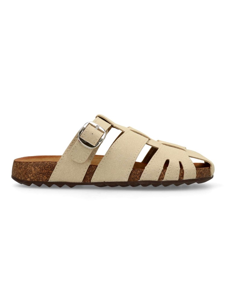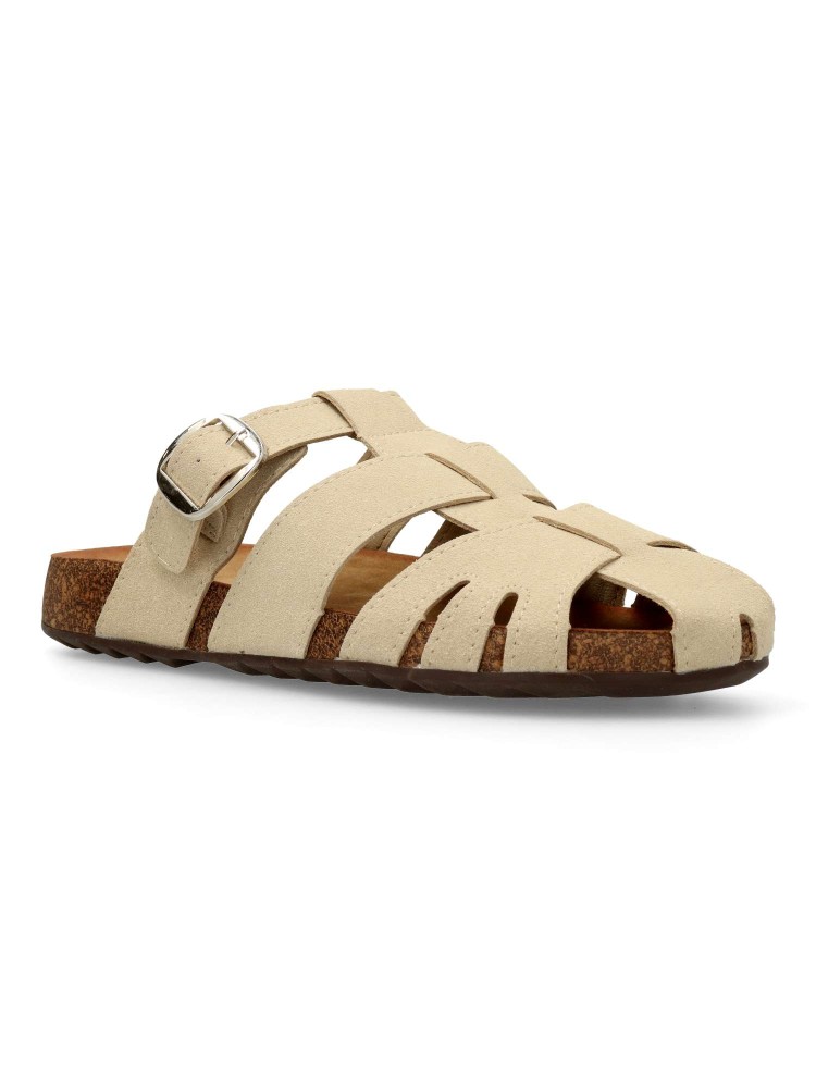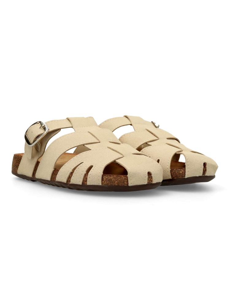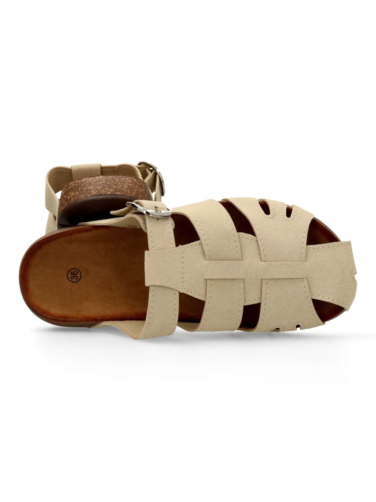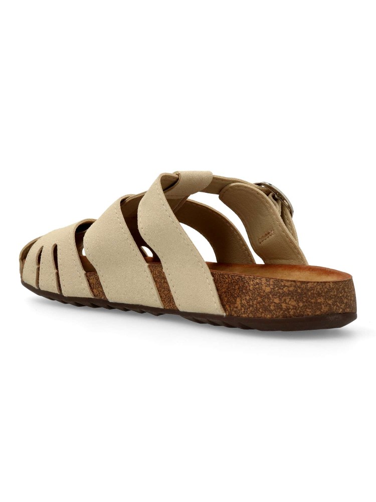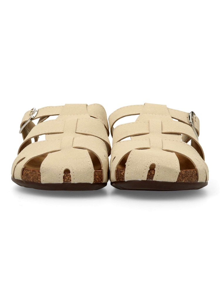 Sandalia zueco de mujer, tipo romana. Modelo de tiras, fabricado en piel sintética, con suela de goma flexible efecto corcho. Planta acolchada. Color beige. Diseño versátil y cómodo, ideal para combinarlo con todos tus looks de verano.