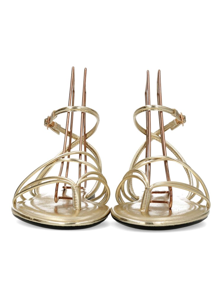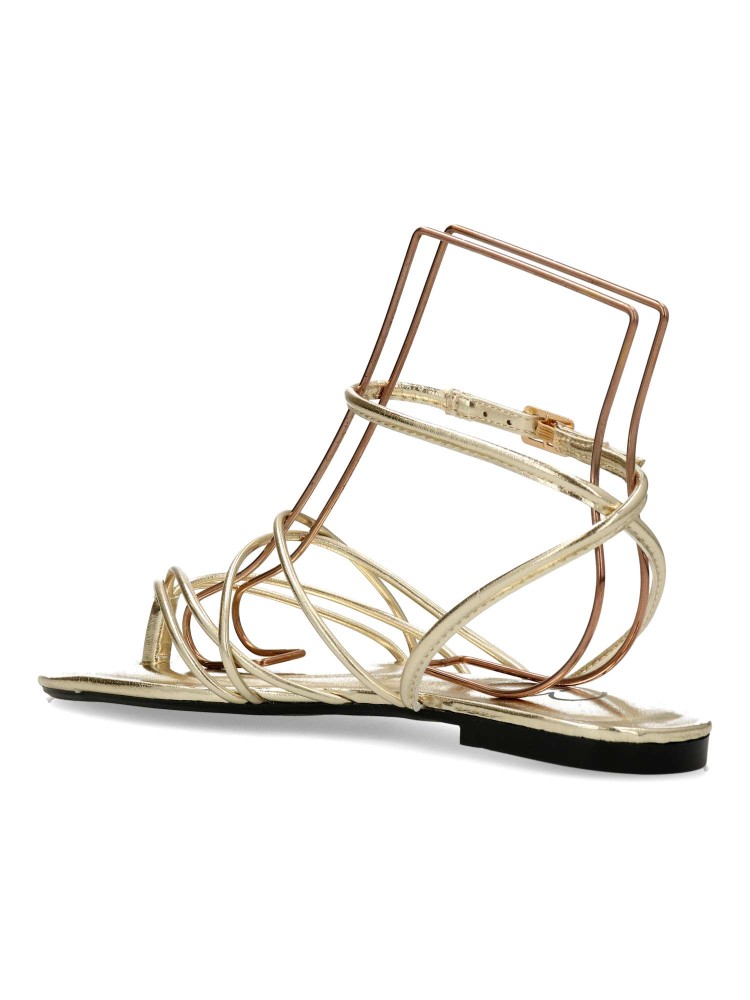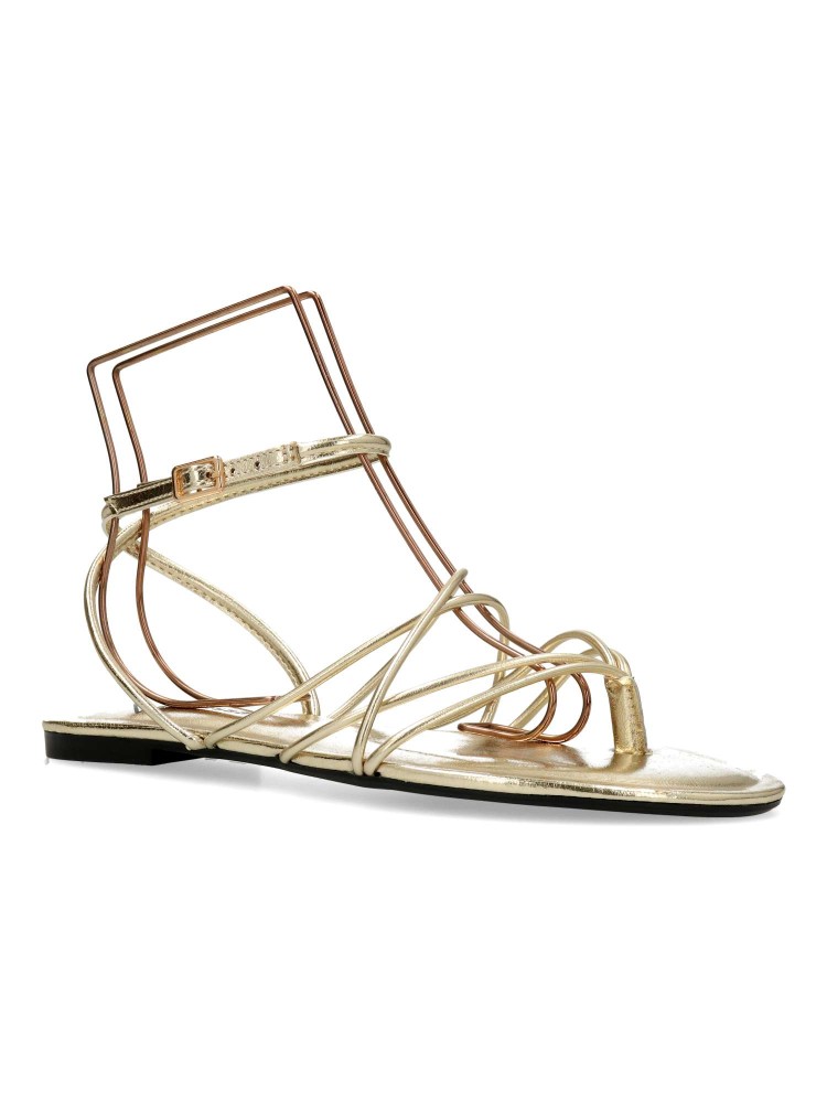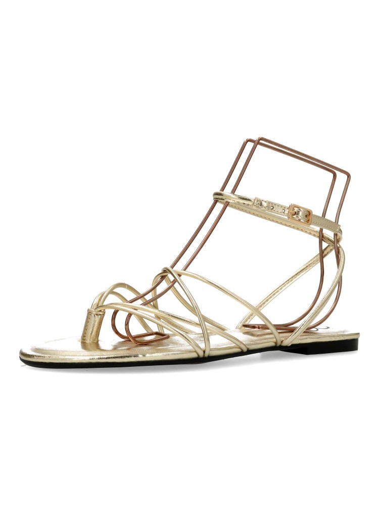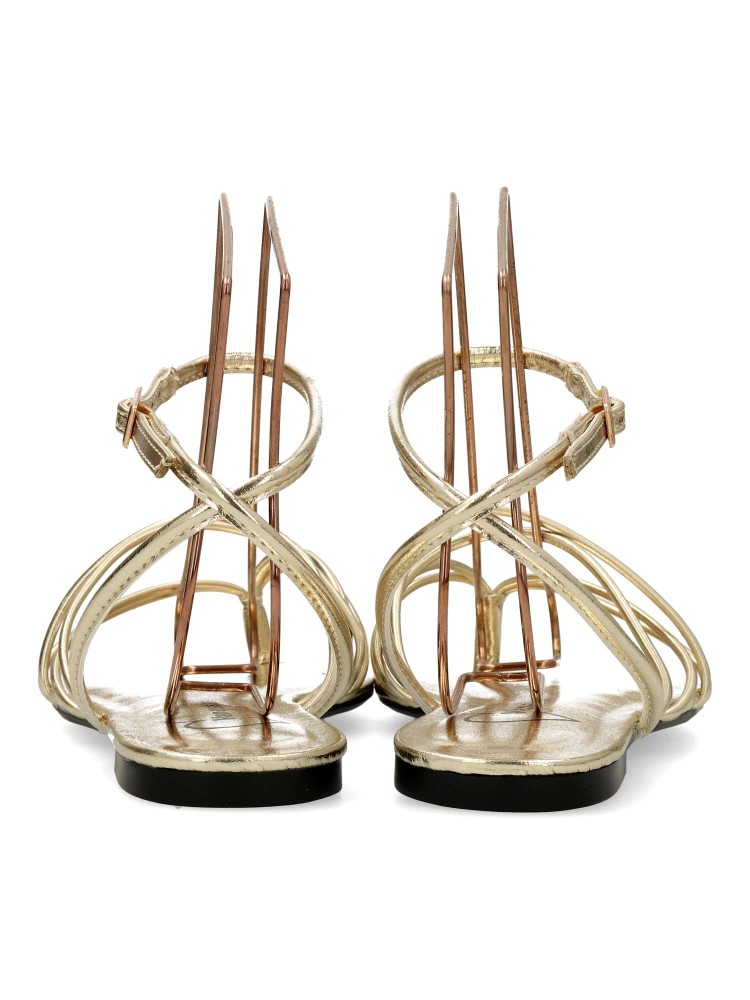 Sandalia plana de mujer, estilo romana. Modelo de tiras cruzadas, fabricada en material sintético con suela de goma. Cierre de hebilla al tobillo. Disponible en color oro. Diseño y confort para añadir personalidad a cualquier outfit de verano.