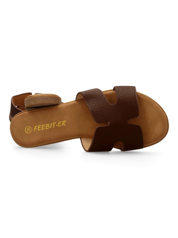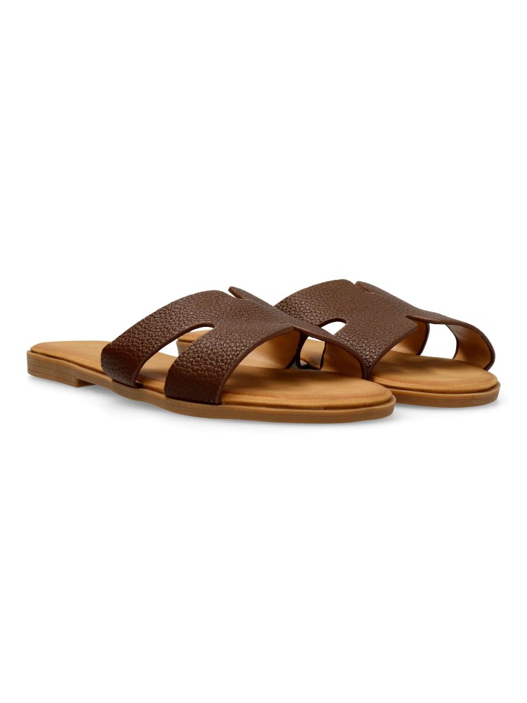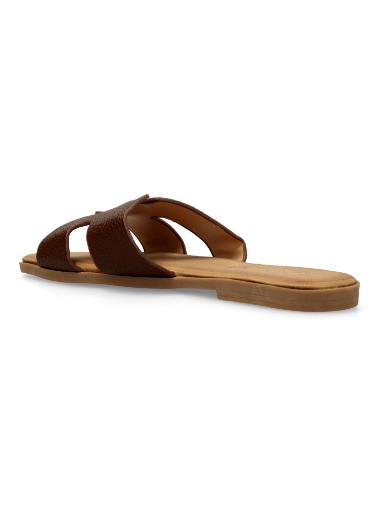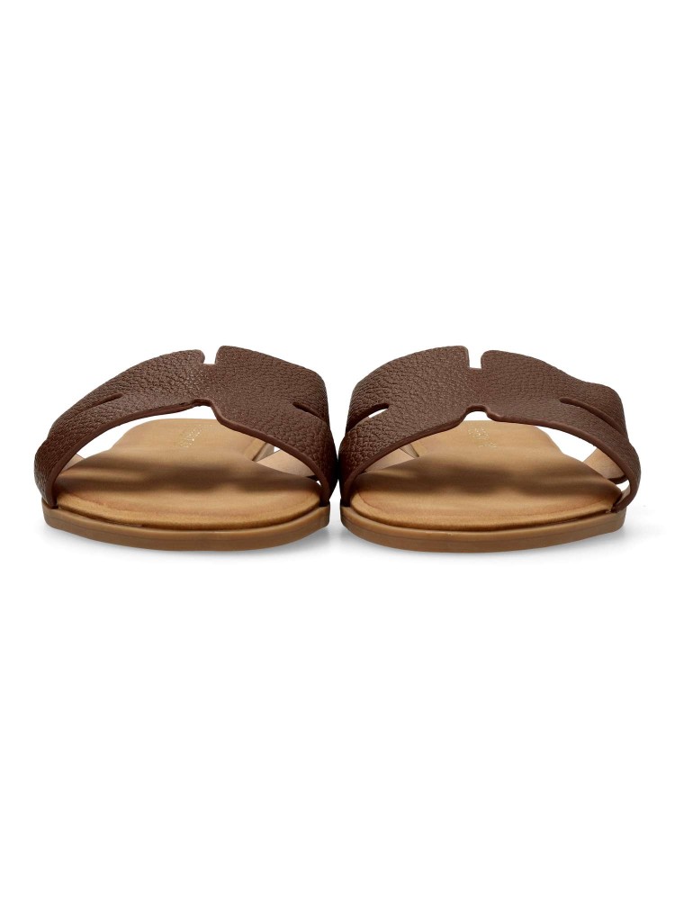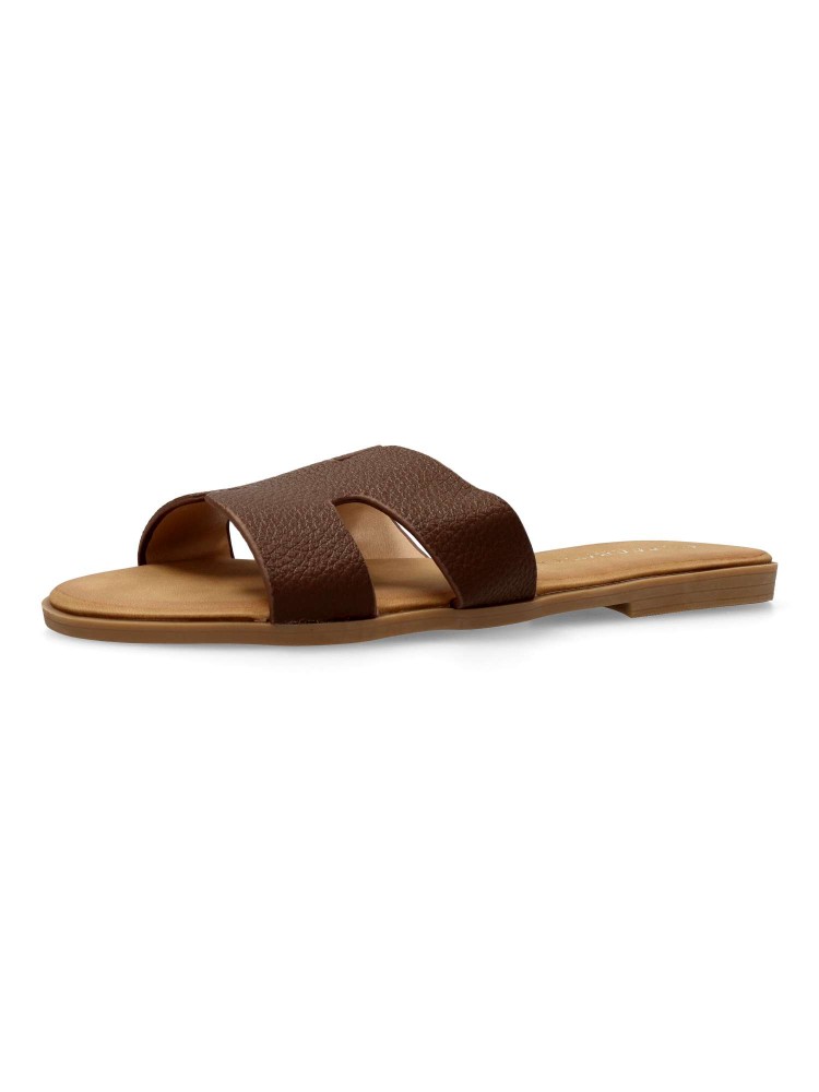 Sandalia plana de mujer. Modelo de pala, fabricada en piel sintética, con suela de goma flexible. Planta acolchada. Color café. Diseño cómodo, elegante y fresco, fácil de combinar con todos tus looks de verano.
