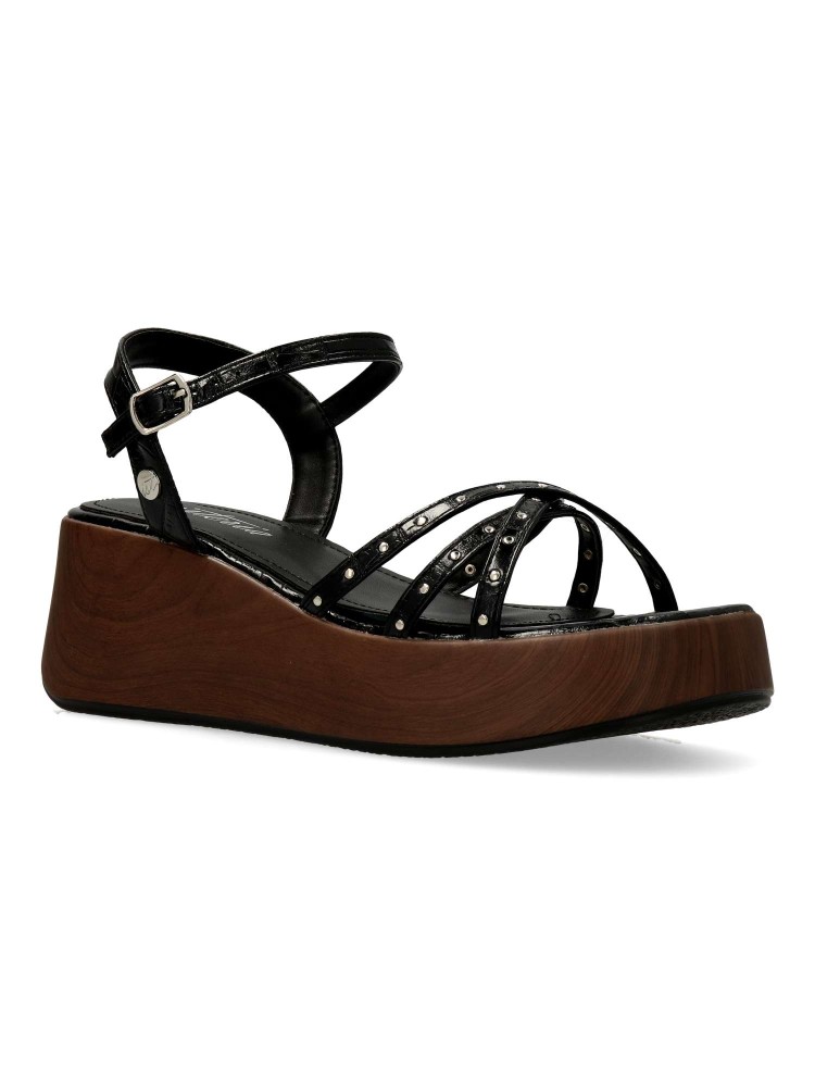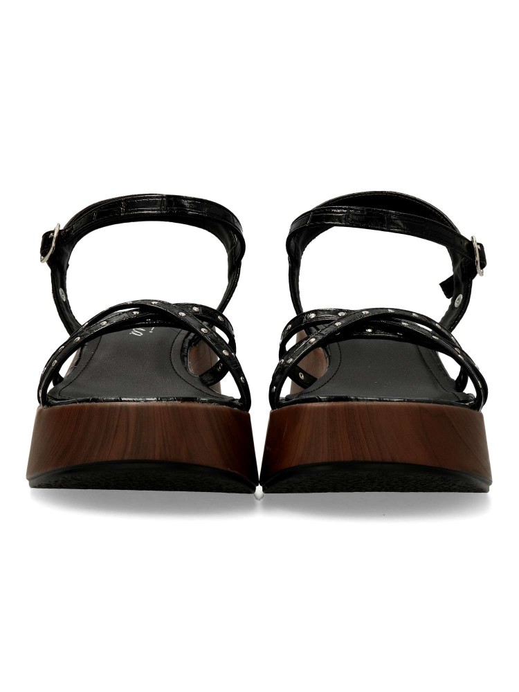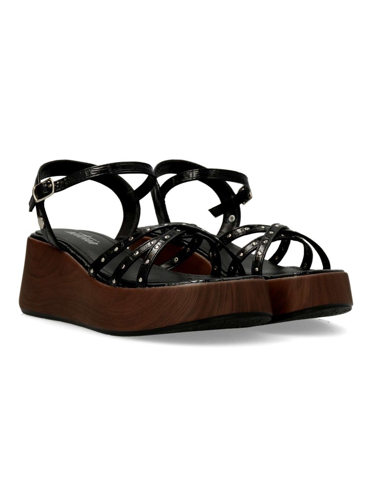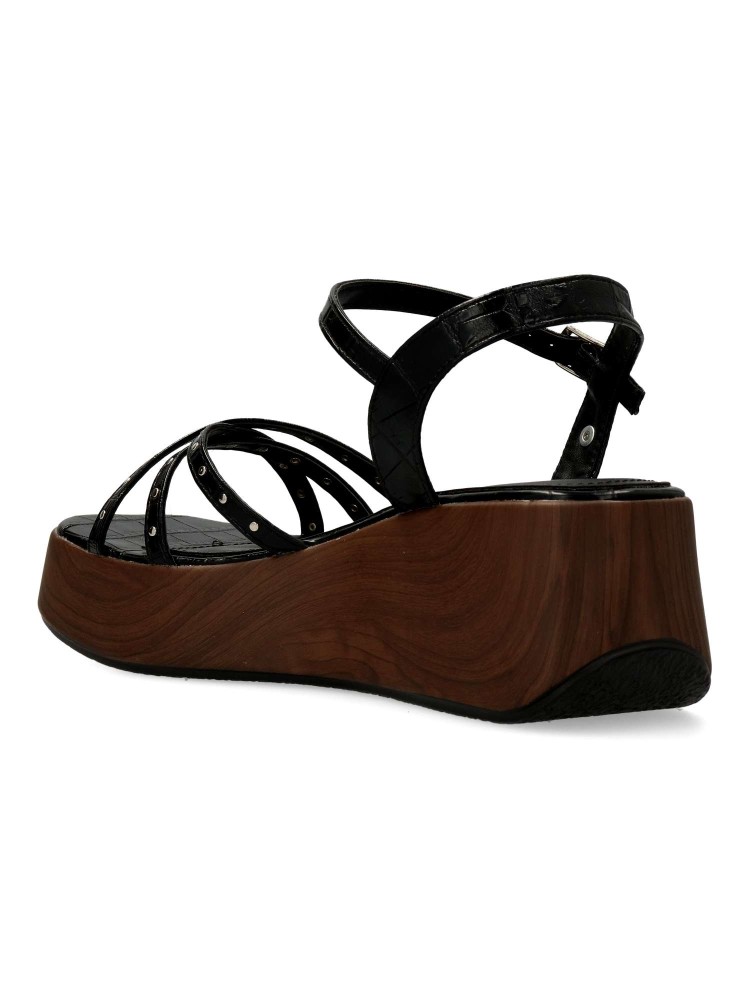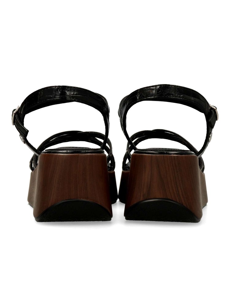 Sandalia cómoda para mujer. Fabricada en piel sintética negra con plataforma efecto madera. Versátiles y actuales, se adaptan a diferentes momentos del día con naturalidad y sofisticación, convirtiéndose en un imprescindible de la temporada. 100% veganas.