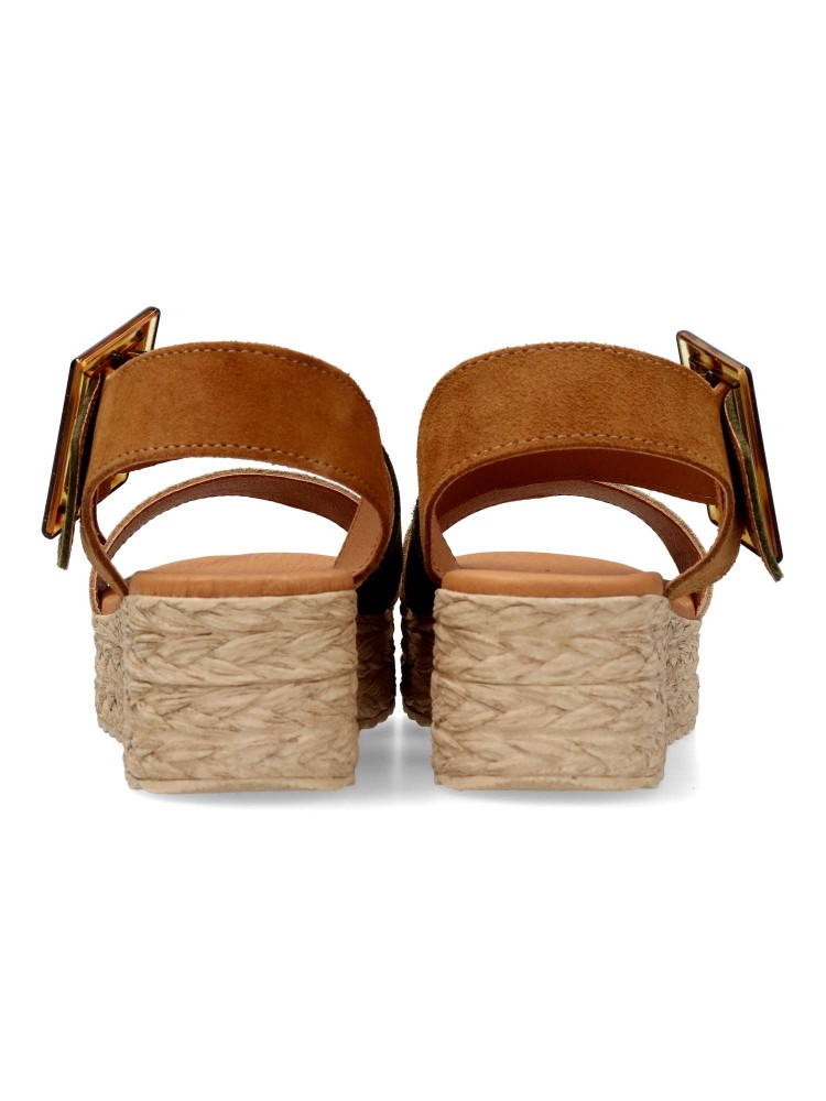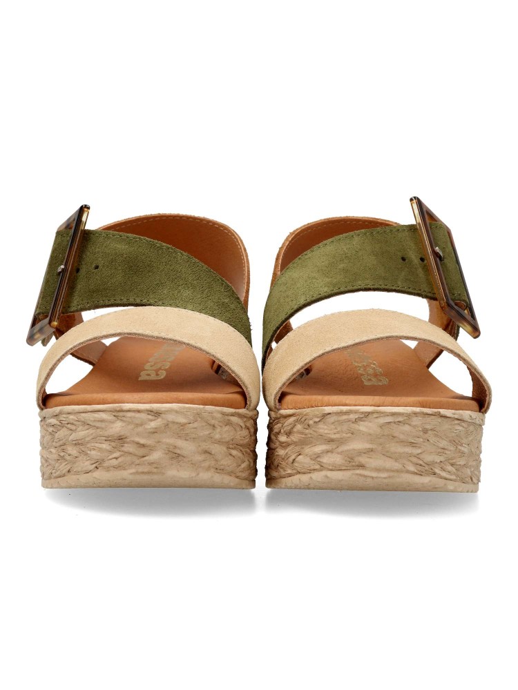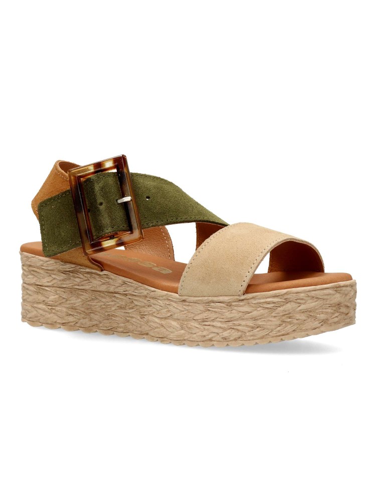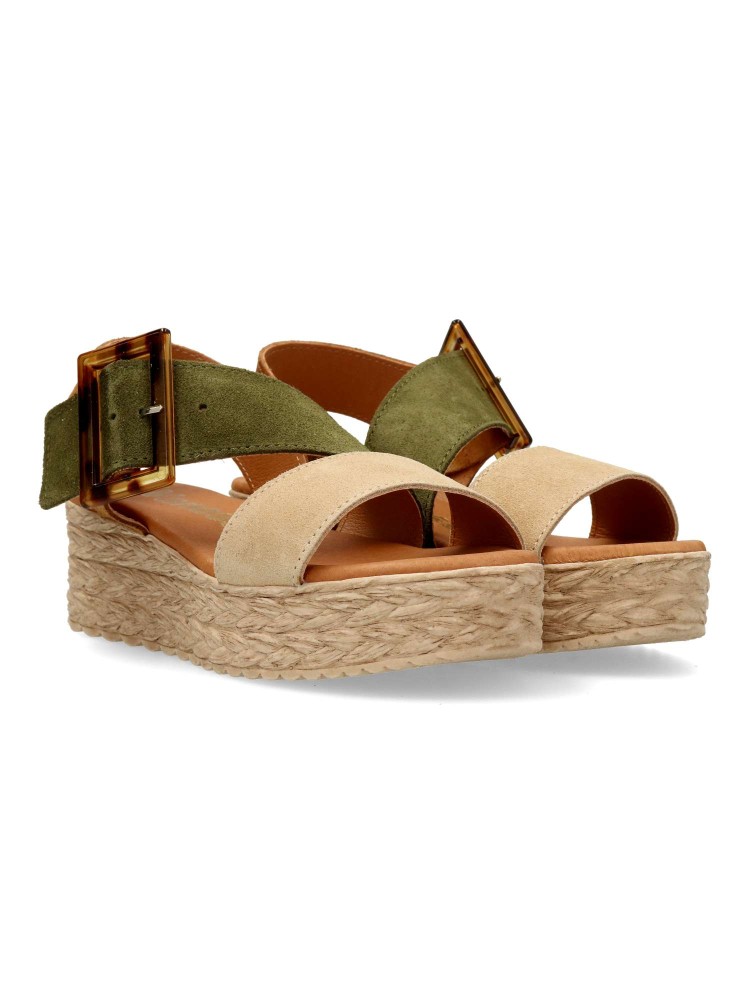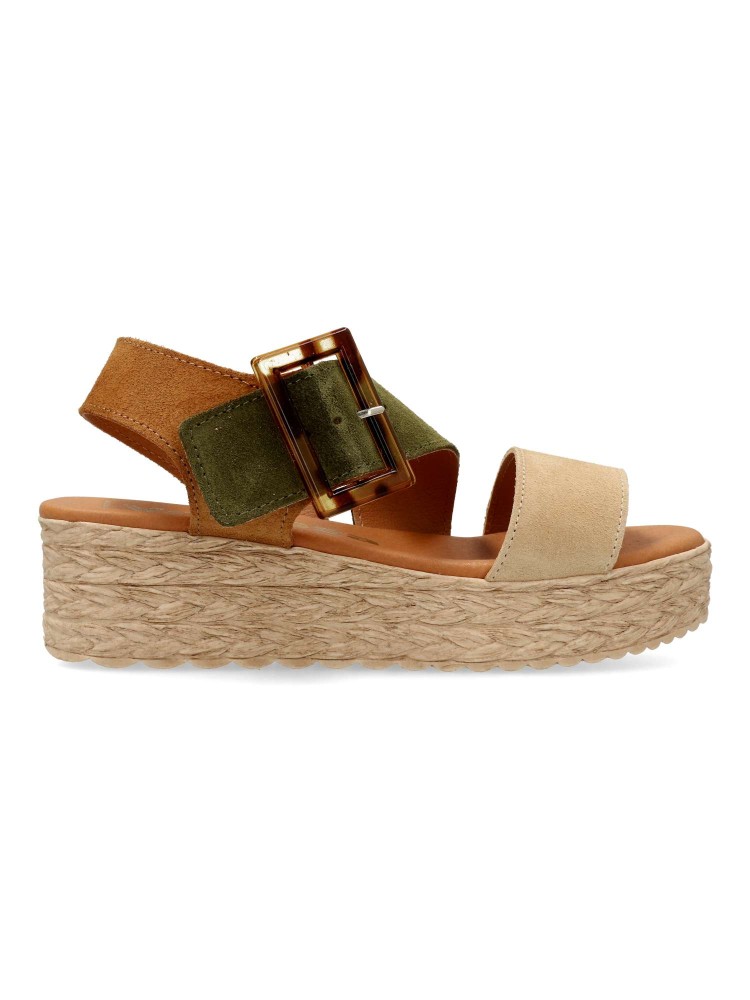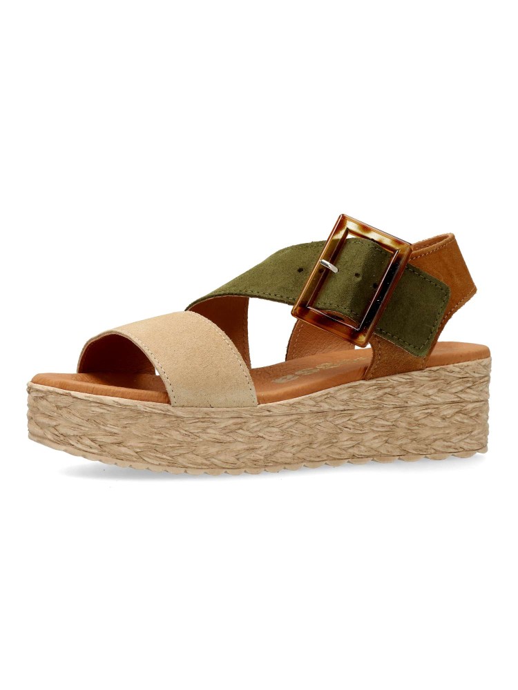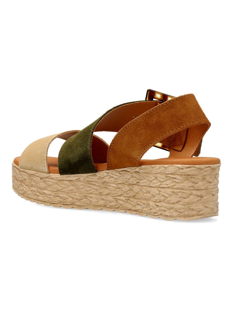 Sandalia de mujer con cierre de hebilla. Modelo cómodo fabricado en piel serraje con suela de goma. Planta de piel con acolchado gel, confort total. Transpirables 100%. Color cuero-kaki-beige. Plataforma efecto yute de 4,5 cm. Hecho a mano en España.