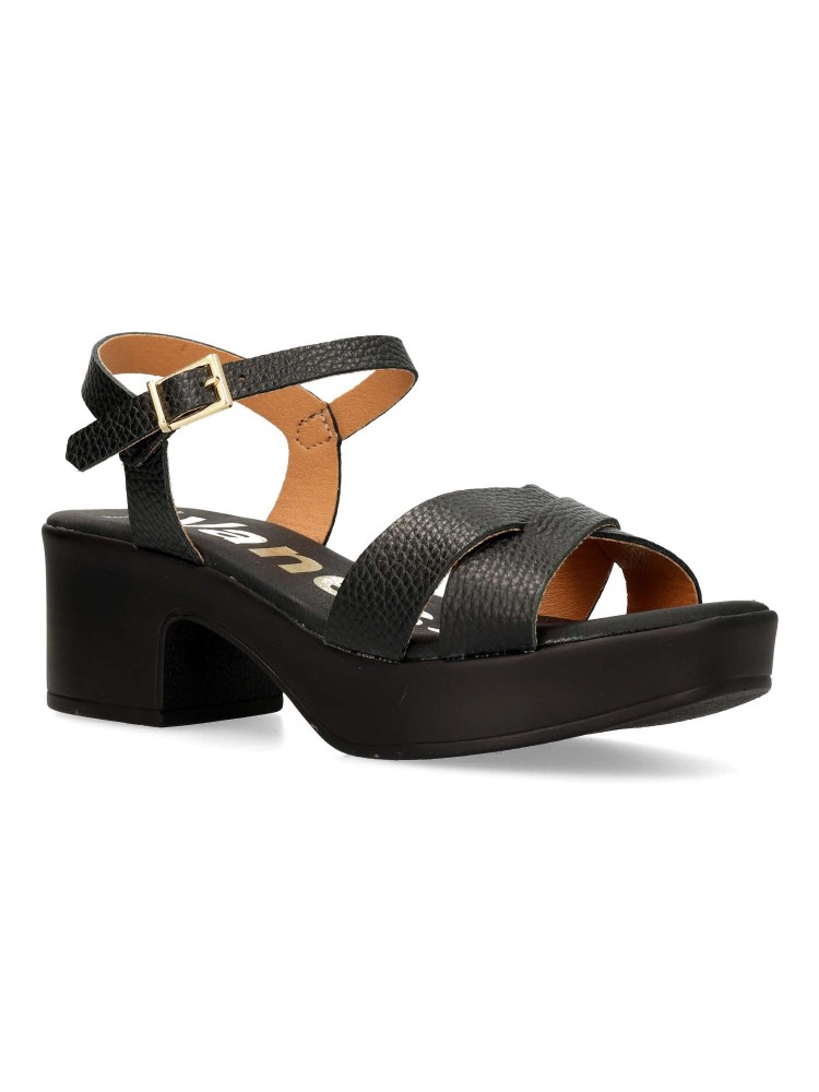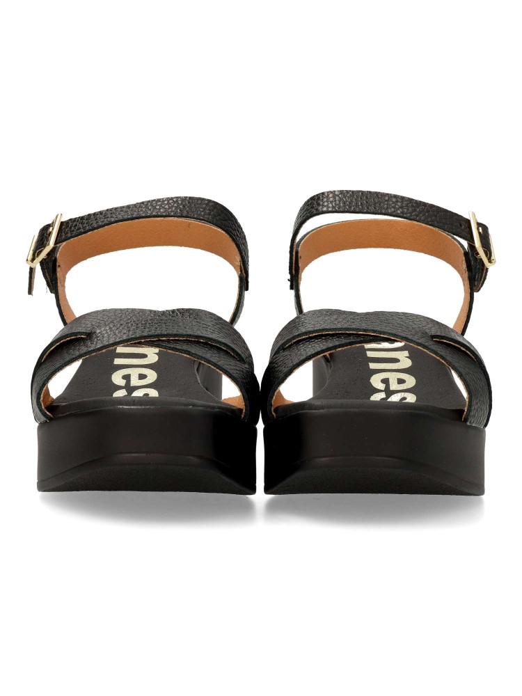 Sandalia cómoda de mujer. Fabricada en piel de calidad. Tacón y plataforma. Altura 5,5 cm. Forros y plantillas 100% transpirables. Planta acolchada. Diseño y confort, ideal con tus looks arreglados de verano. Hecho en España.
