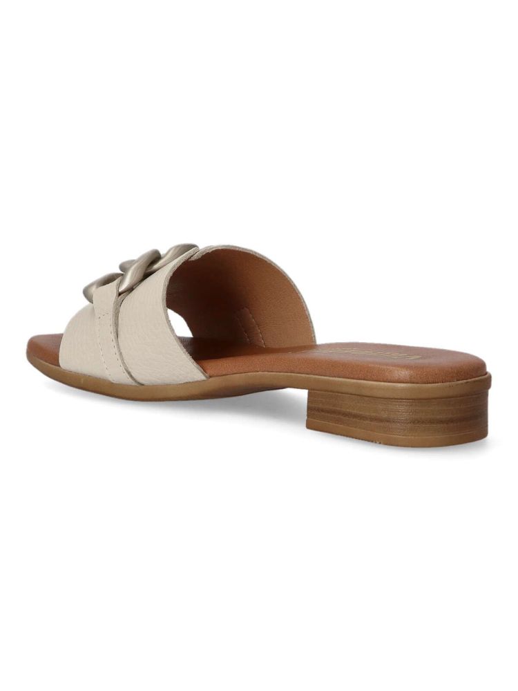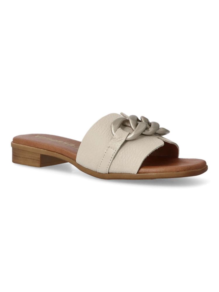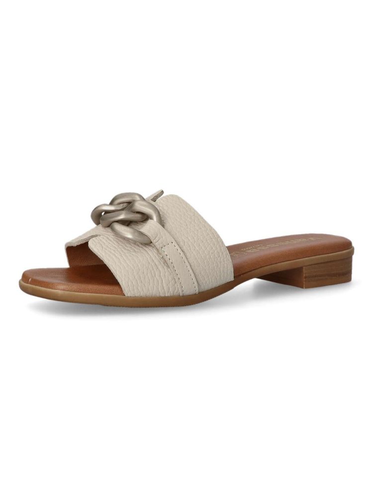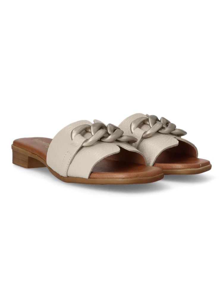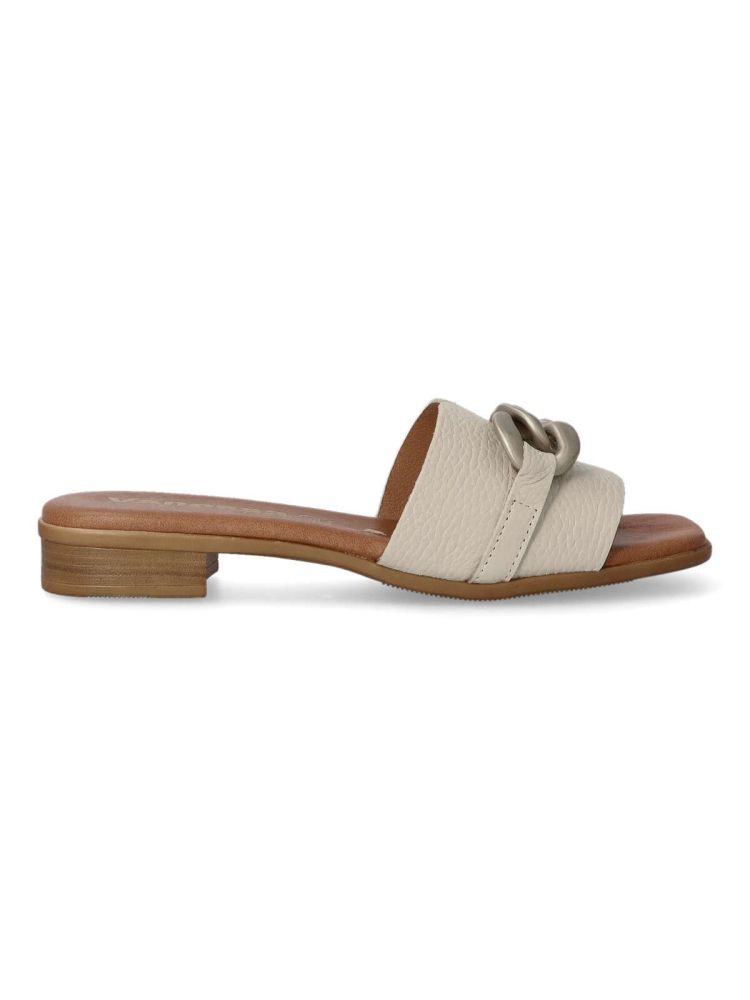 Sandalia cómoda para mujer. Fabricado en piel con cadena decorativa en la pala. Forros y plantillas 100% transpirables. Planta acolchada. Agradable sensación de confort y bienestar. Color hielo. Diseño y confort hecho en España.