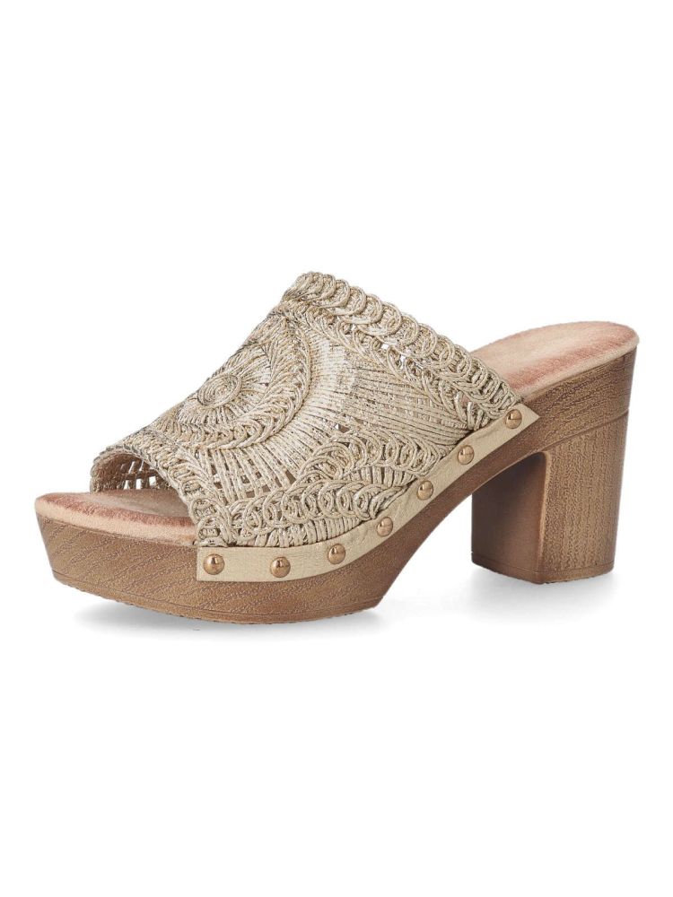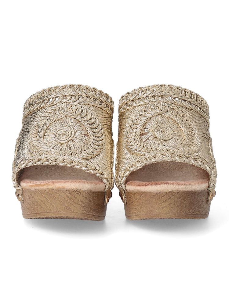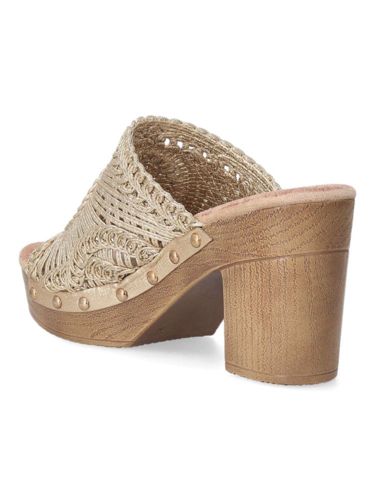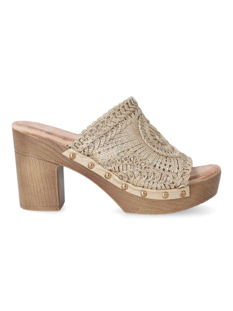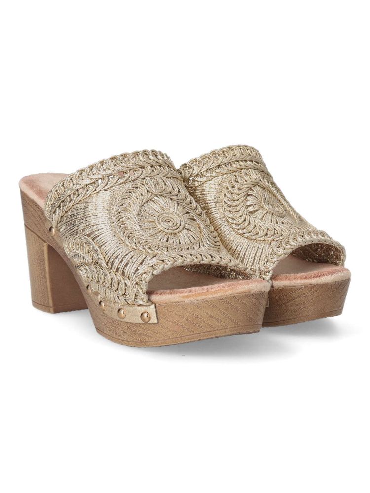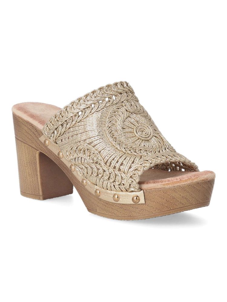 Zuecos de madera con diseño tejido. Tacón ancho de goma, simil madera. Parte superior adornada con un patrón tejido. Disponible en color oro. Tacón de 8,5 cm. Plataforma de 3 cm. Zapatos cómodos, originales y elegantes, fáciles de combinar.