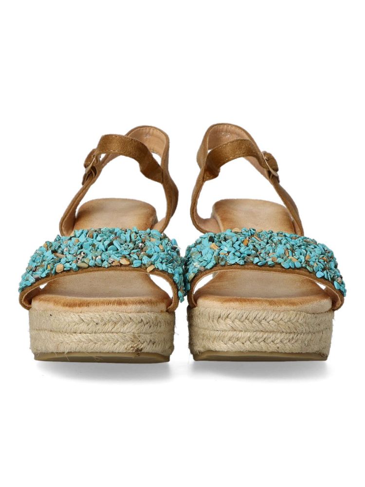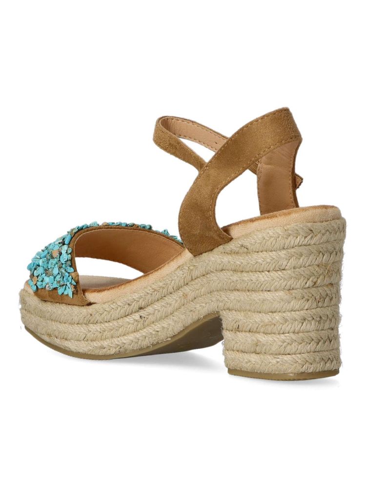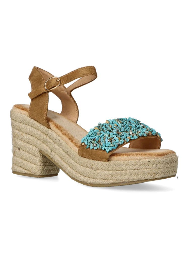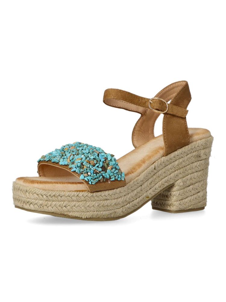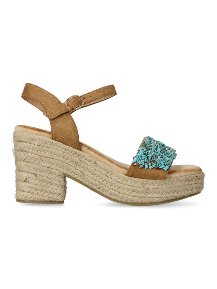 Sandalia esparteña de mujer. Cierre de hebilla. Alpargata fabricada en piel sintética, con suela de yute sobre goma. Color camel. Piedras decorativas en la pala. Tacón de 8 cm. de altura. Una sandalia veraniega, fácil de combinar con todos tus outfits.