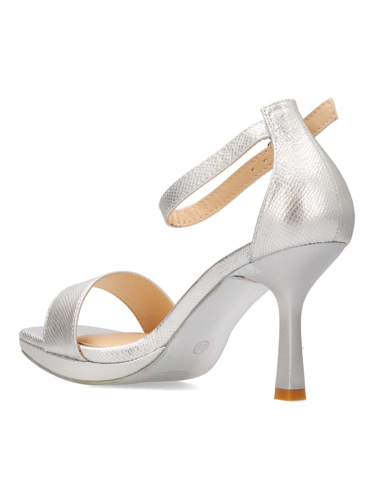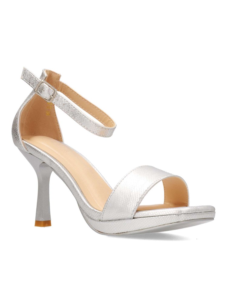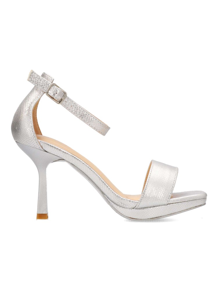 Sandalia de fiesta para mujer. Modelo tira al empeine, pulsera al tobillo y cierre de hebilla. Fabricado en piel sintética, con suela de goma. Tacón fino de 7,5 cm. Color plata. Ideal para fiestas, eventos y celebraciones.