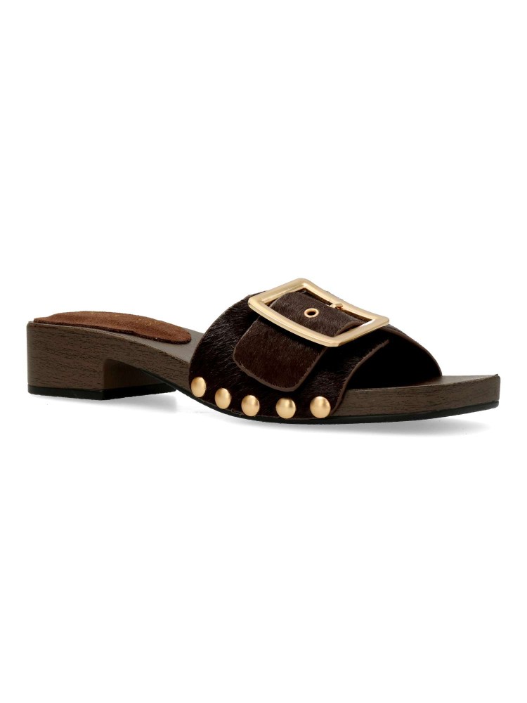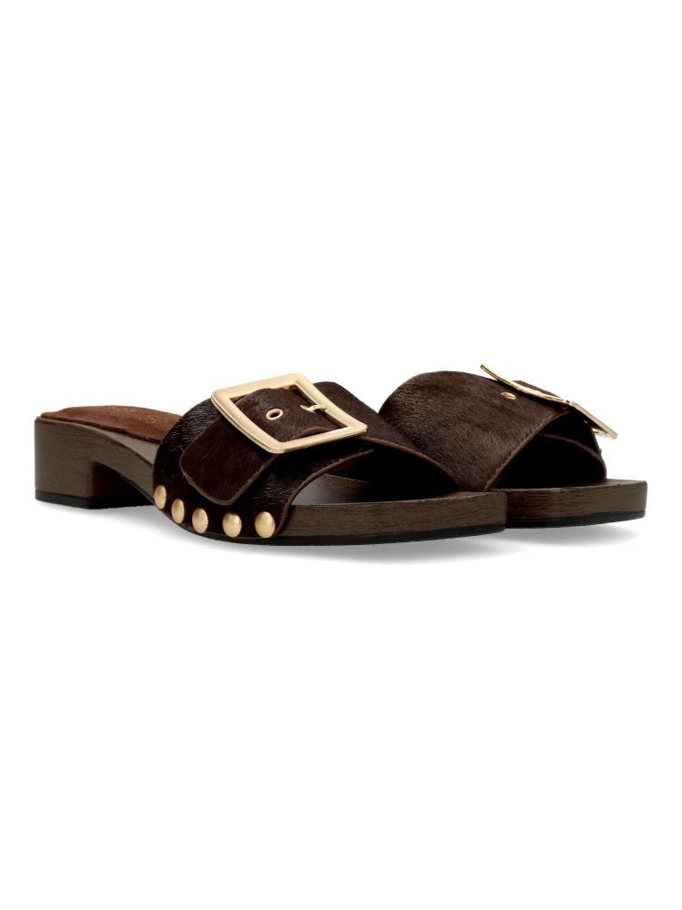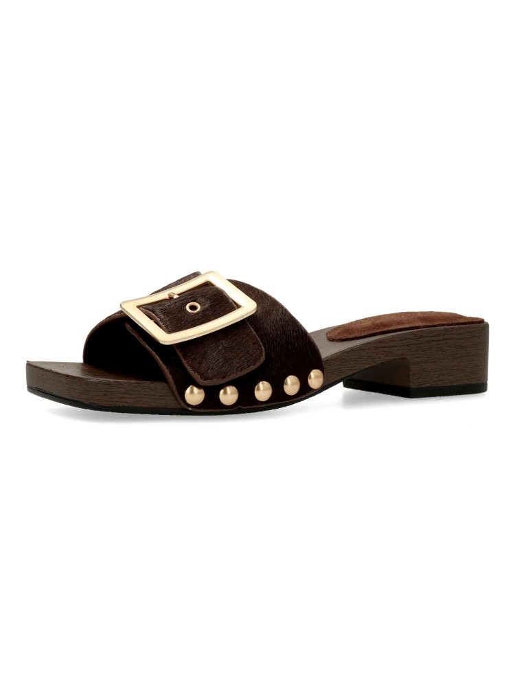 Sandalia de mujer tipo zueco. Fabricada en piel con detalle de tachas metalizadas. Pala con ajuste de hebilla. Planta de piel. Tacón efecto madera. Diseño versátil, cómodo, original y elegante, que podrás combinar con todos tus outfits de verano.
