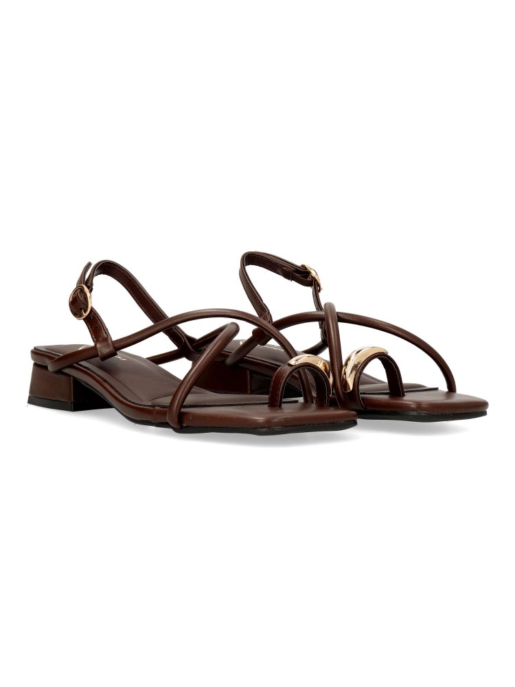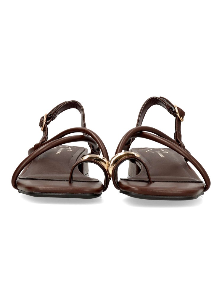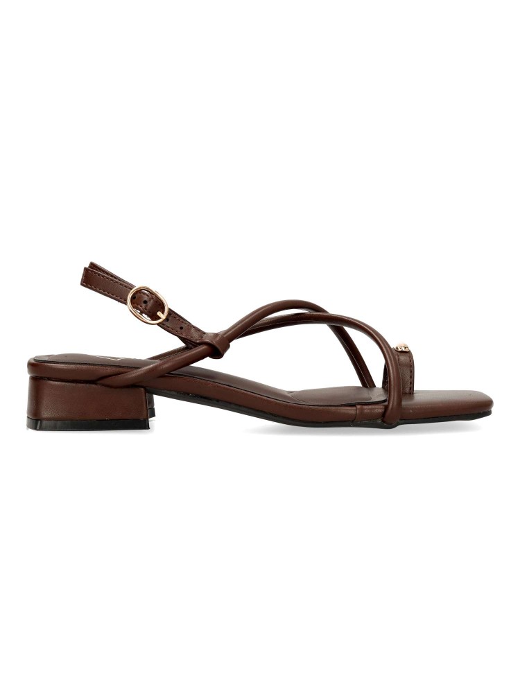 Sandalia cómoda para mujer. Modelo de tiras cruzadas, fabricada en material sintético con suela de goma. Cierre de hebilla al tobillo. Disponible en color cafe. Diseño y confort para añadir personalidad a cualquier outfit de verano.