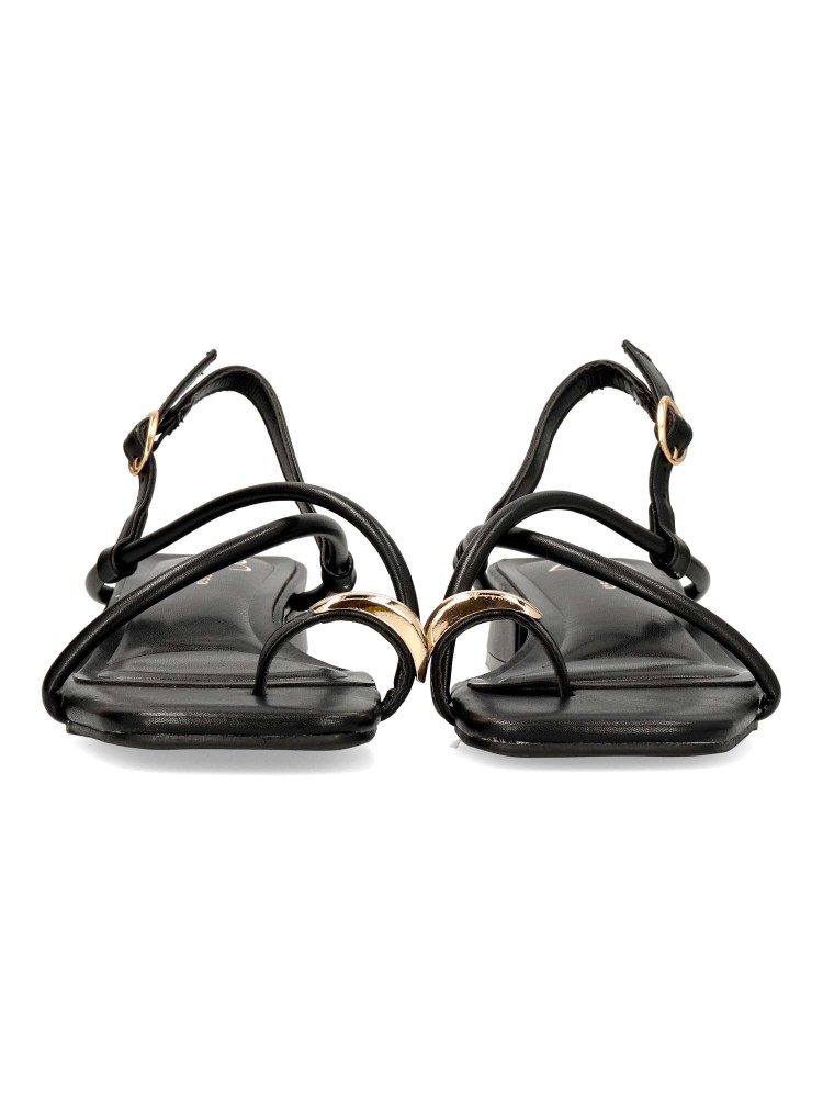 Sandalia cómoda para mujer. Modelo de tiras cruzadas, fabricada en material sintético con suela de goma. Cierre de hebilla al tobillo. Disponible en color negro. Diseño y confort para añadir personalidad a cualquier outfit de verano.