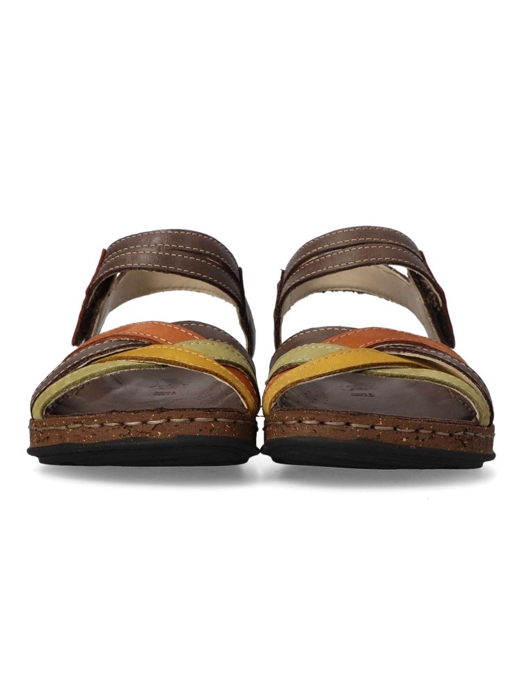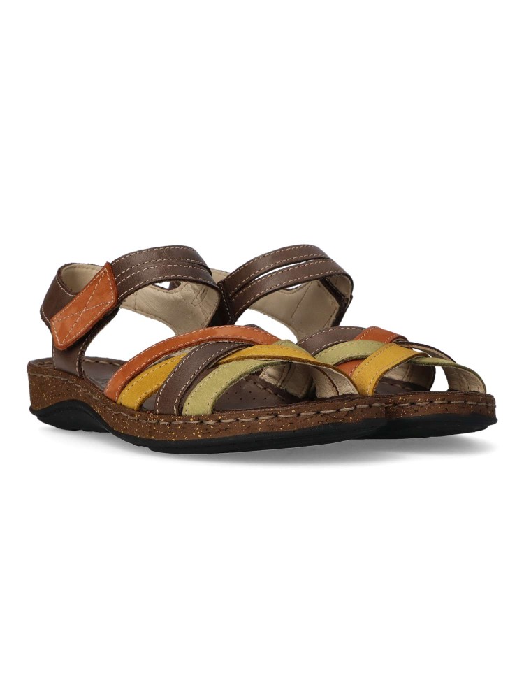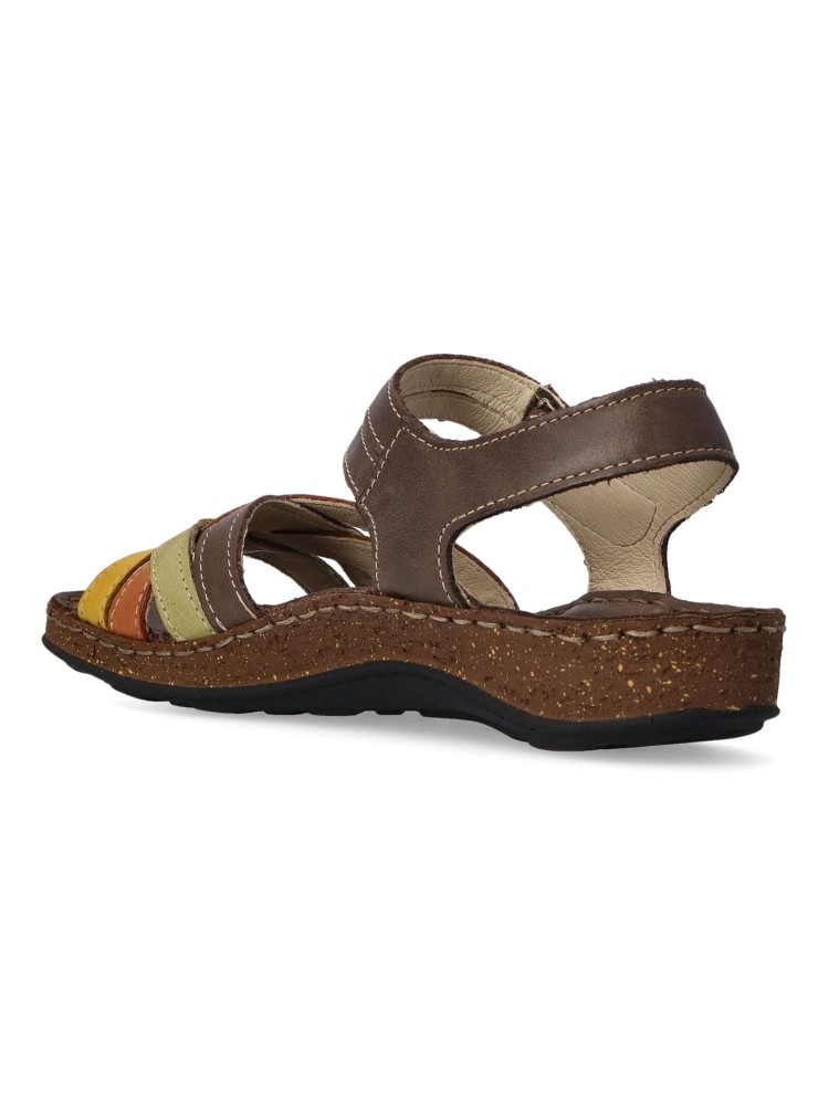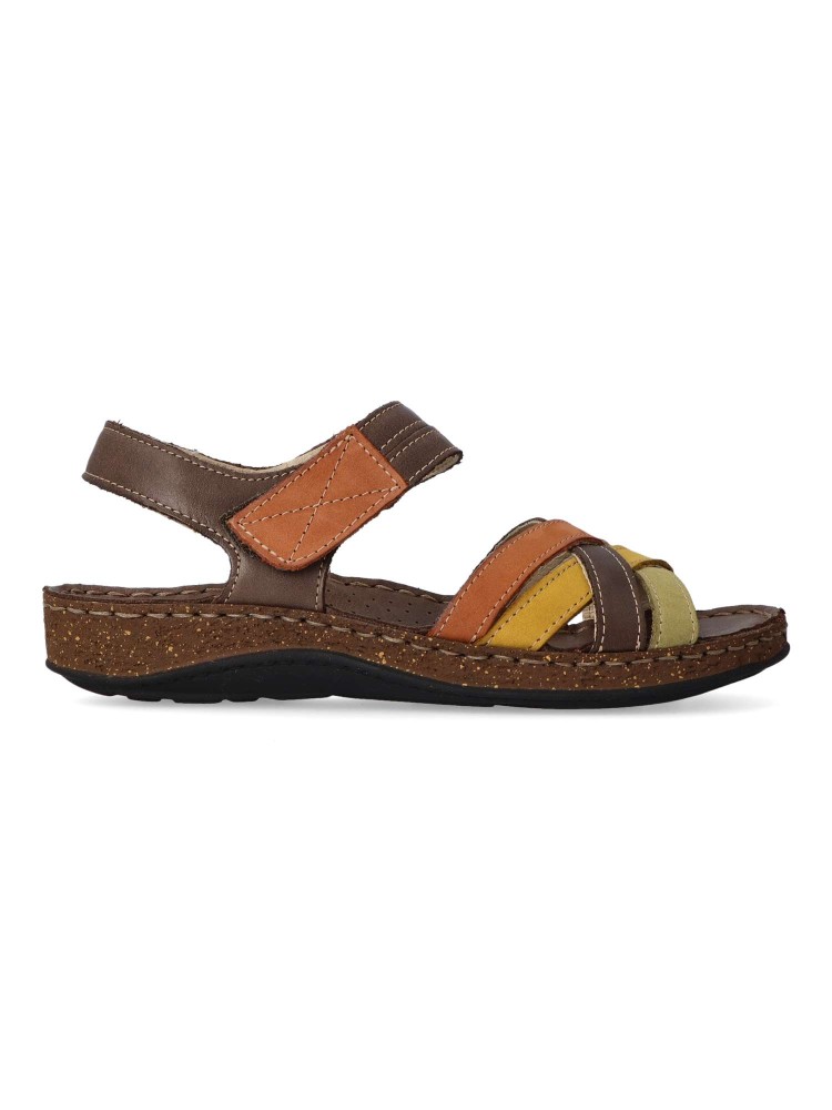 Sandalia cómoda de mujer fabricada en piel de primera calidad, con suela de goma termoplástica. Modelo de tiras con cierre de velcro. Planta acolchada. Disponible en color taupe-oliva-beige. Diseño y confort hechos para ti. Walk & Fly.