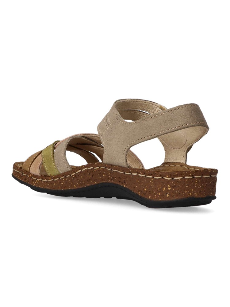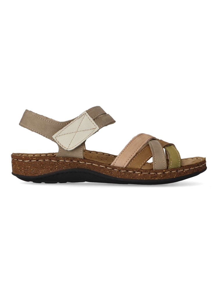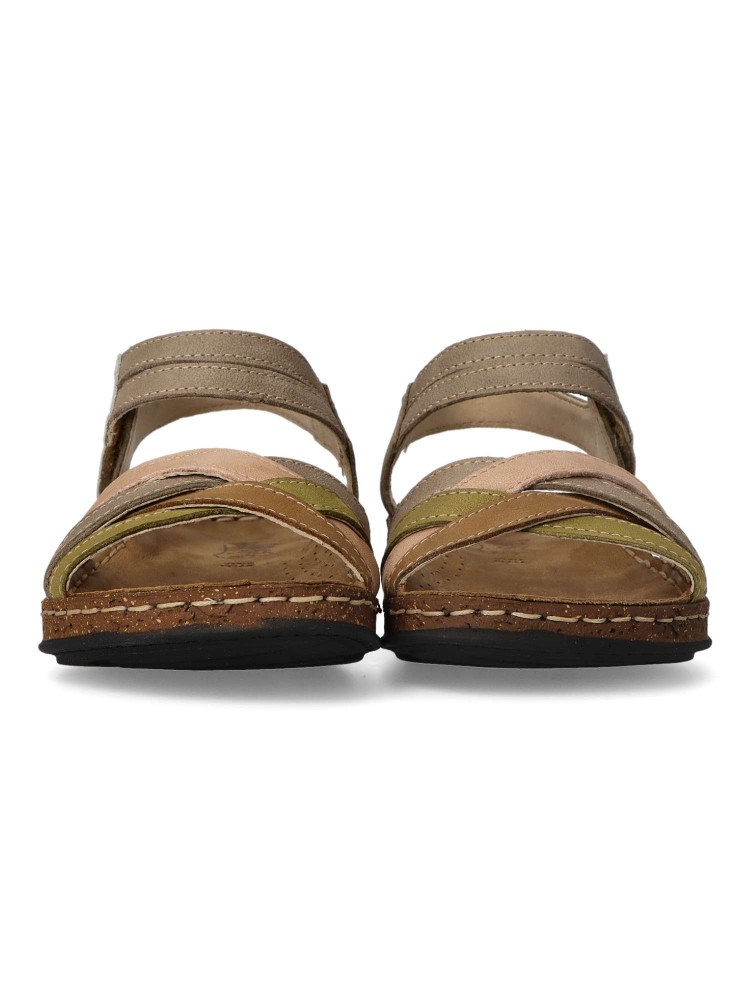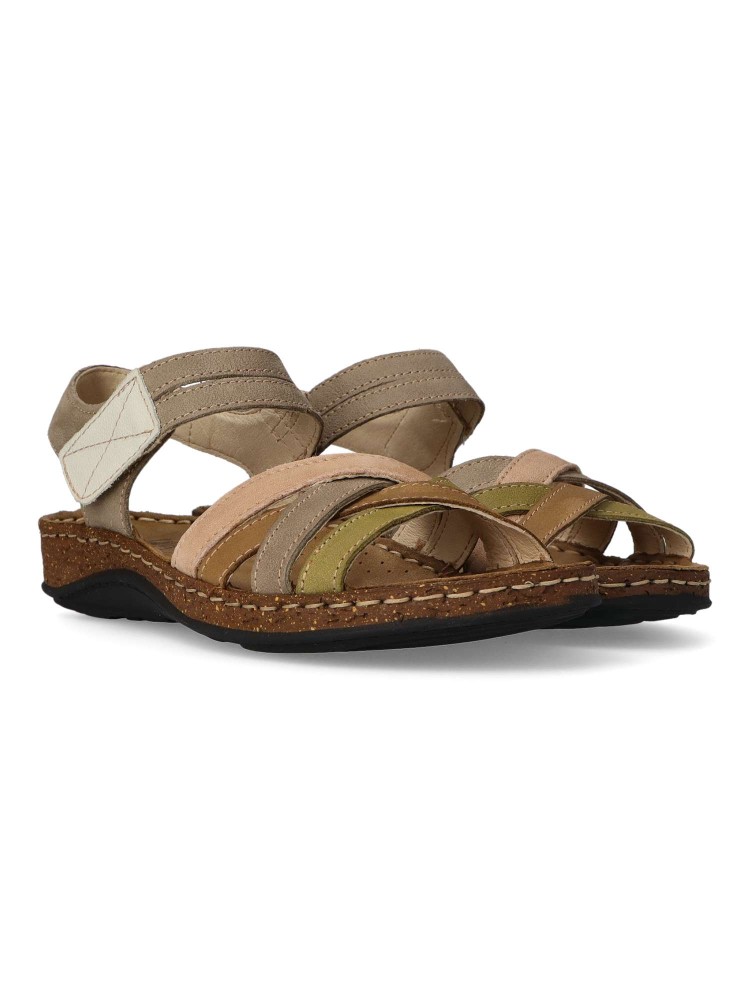 Sandalia cómoda de mujer fabricada en piel de primera calidad, con suela de goma termoplástica. Modelo de tiras con cierre de velcro. Planta acolchada. Disponible en color gris-taupe-kaki. Diseño y confort hechos para ti. Walk & Fly.
