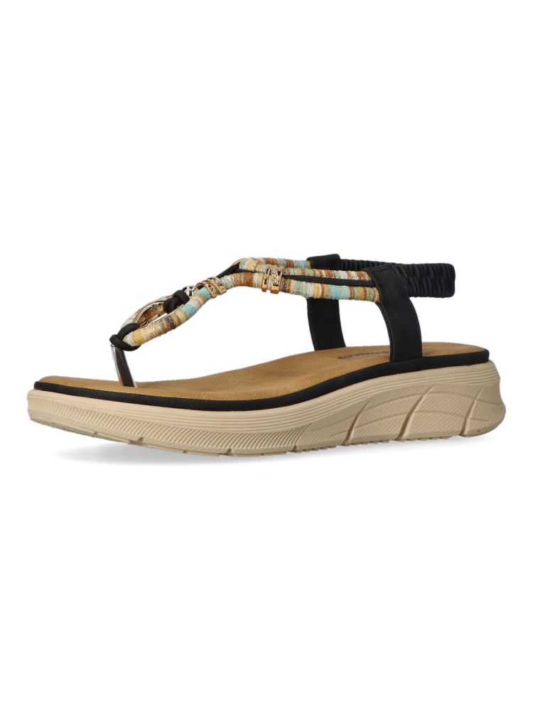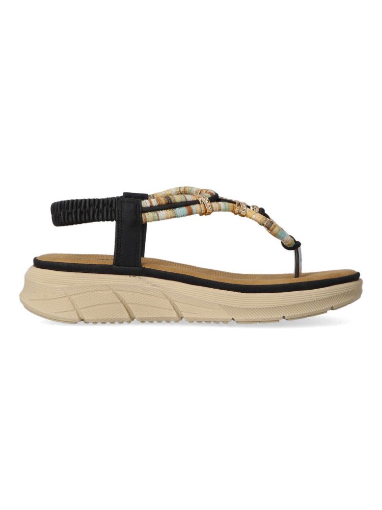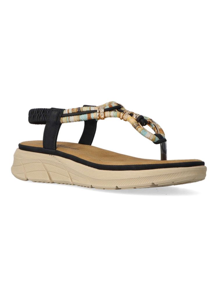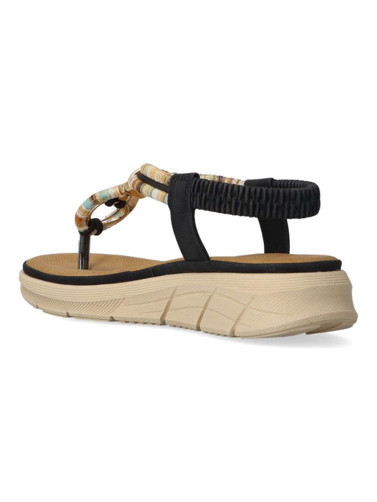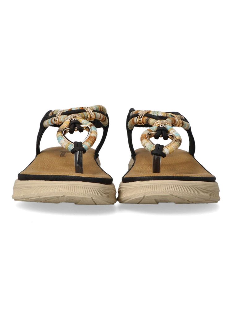 Sandalia cómoda de mujer, estilo étnico. Sujeta al tobillo por un elástico en la talonera. Color negro. Fabricado en material sintético con suela de goma. Tiras multicolor con detalles decorativos metalizados. Planta acolchada, confort diario para verano.