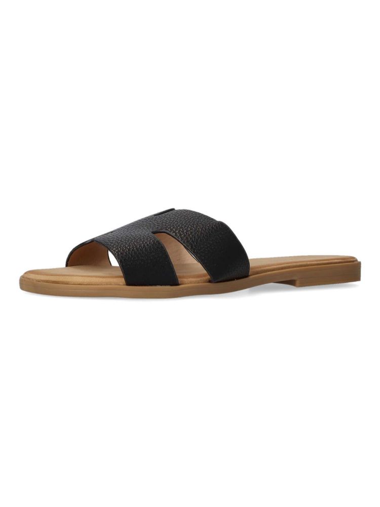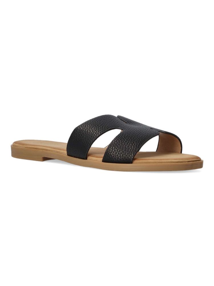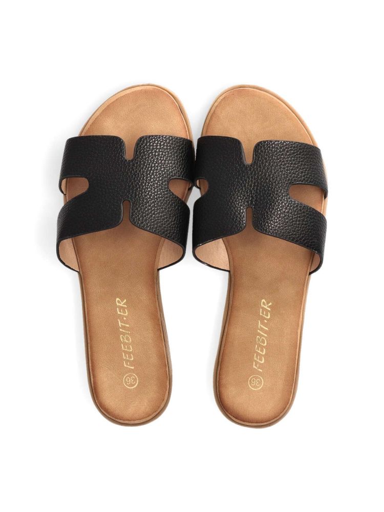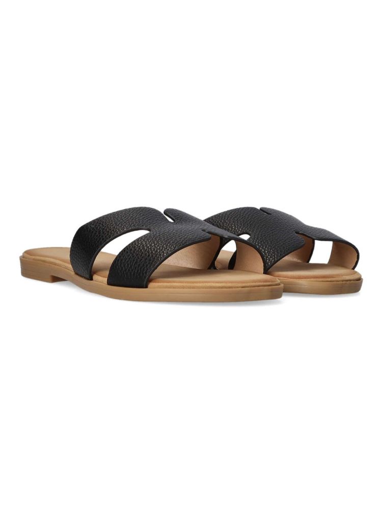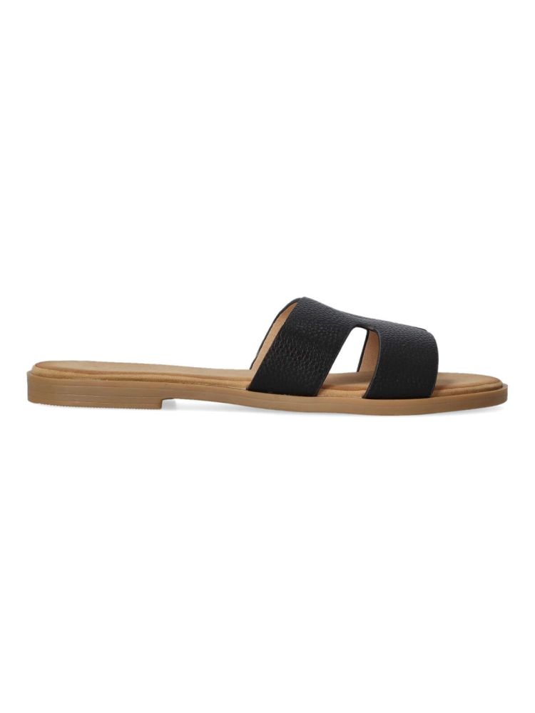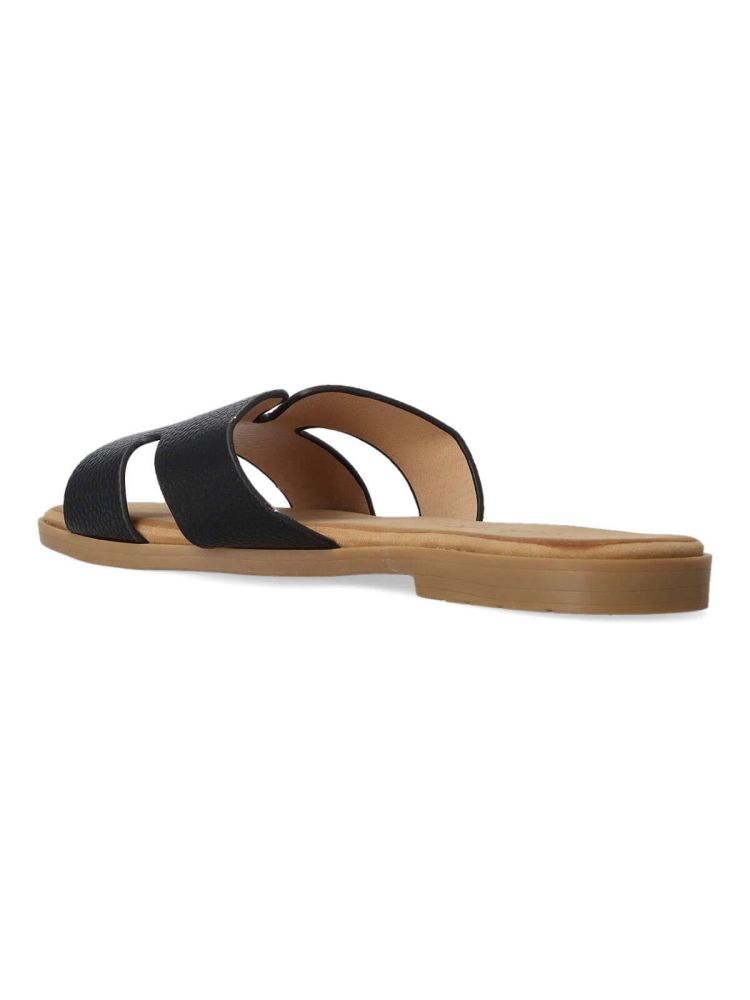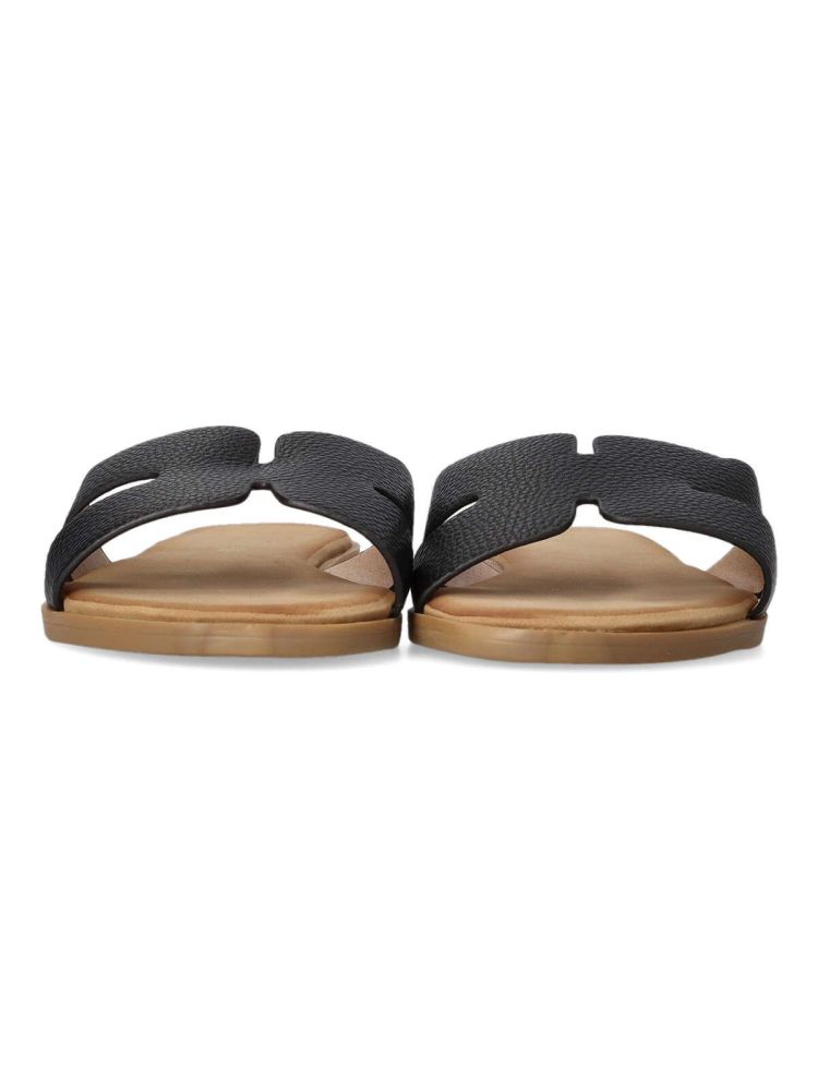 Sandalia plana de mujer. Modelo de pala, fabricada en piel sintética, con suela de goma flexible. Planta acolchada. Color negro. Diseño cómodo, elegante y fresco, fácil de combinar con todos tus looks de verano.