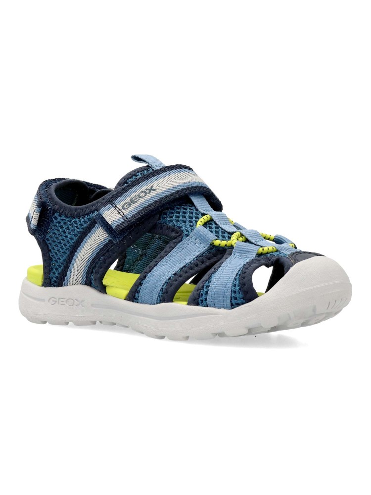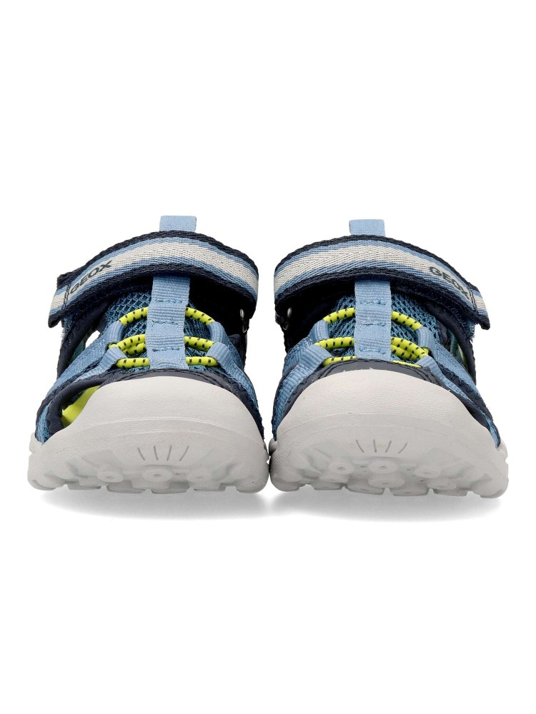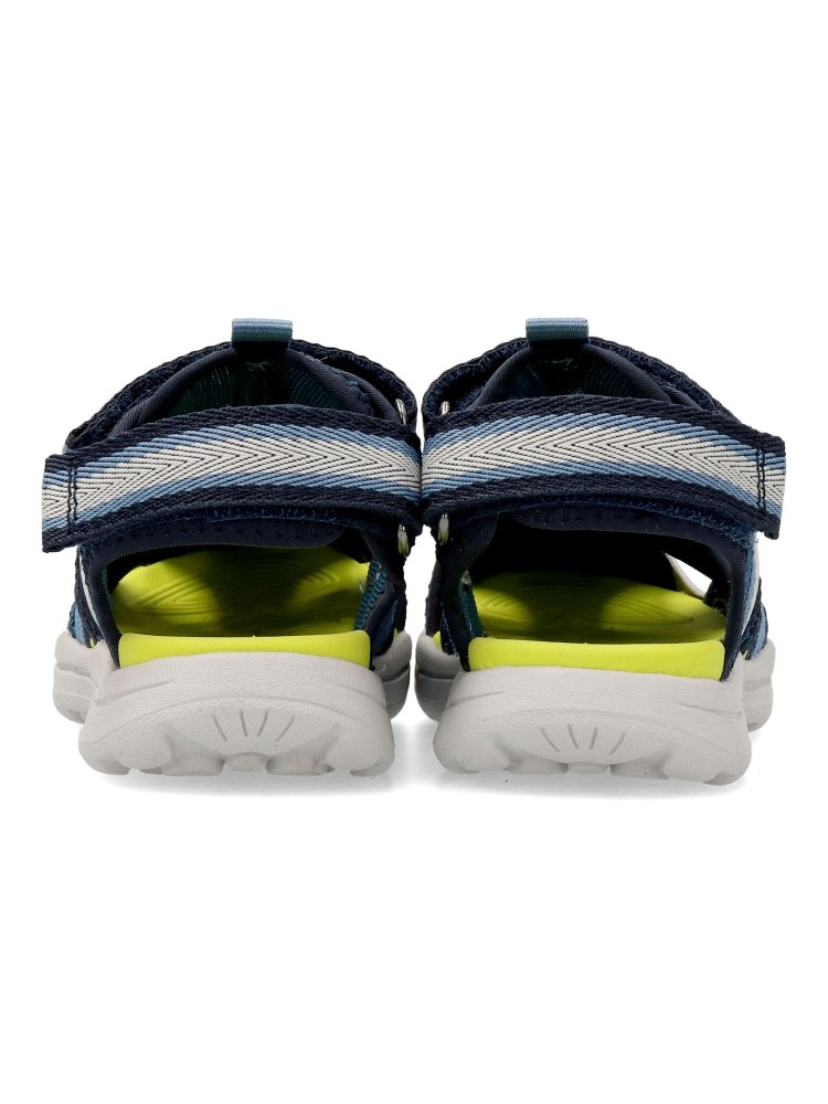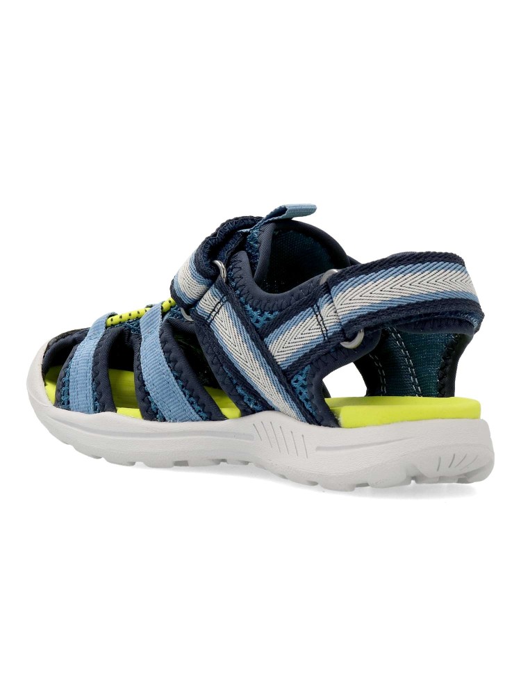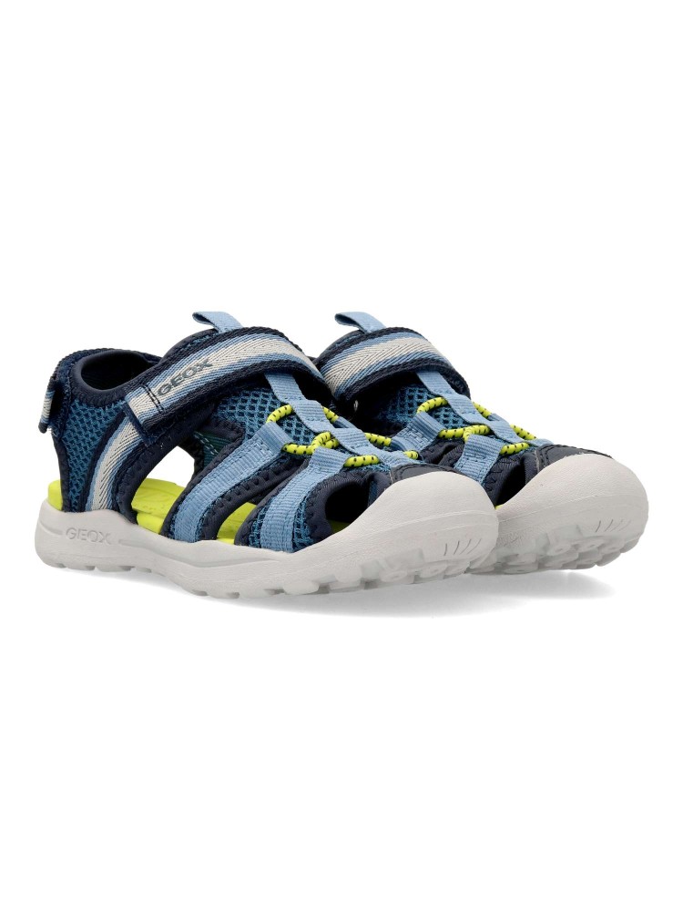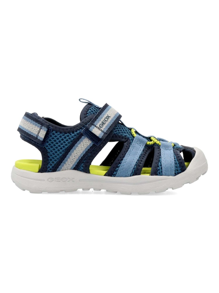 Sandalia deportiva cómoda y ajustable con tira adherente. Fabricada en textil, con suela de goma ligera y transpirable. Puentera reforzada. Color marino-celeste. Ligera, transpirable y resistente al agua. Informal-elegante para looks de verano.