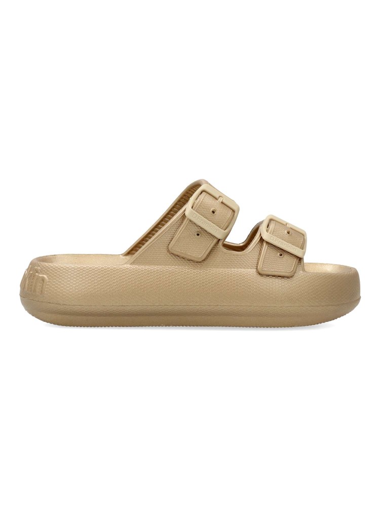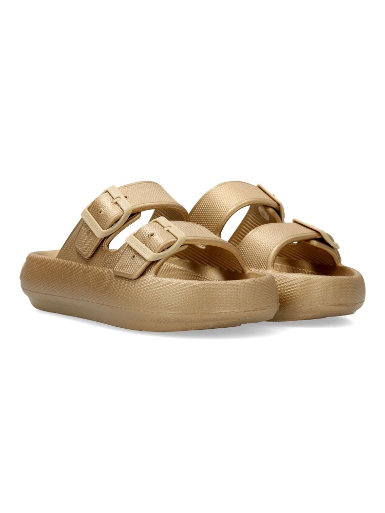 Sandalia Bloomer confeccionada en EVA. Cuenta con un acabado de doble tira. Cierre de hebilla regulable. Color oro. Confeccionadas con materiales ligeros para una pisada de otro nivel. Diseño creado para recorrer los destinos que nos inspiran.