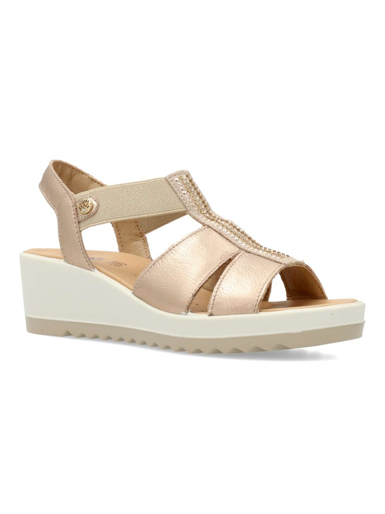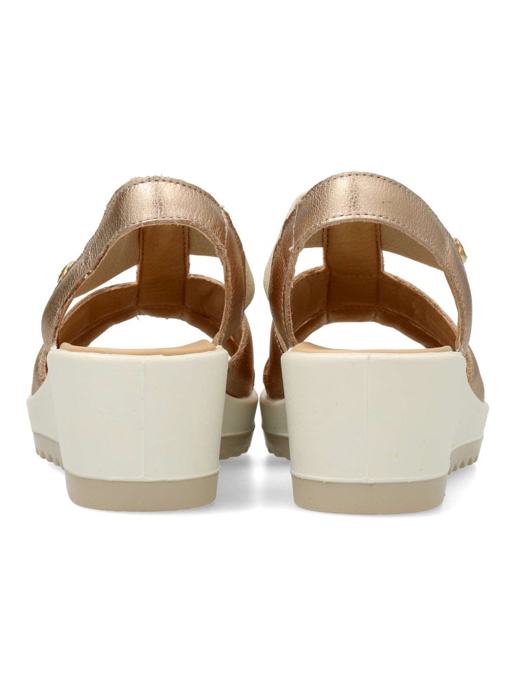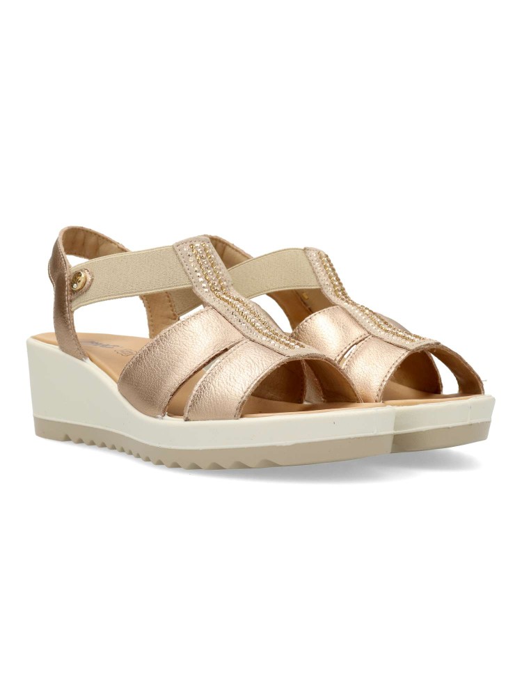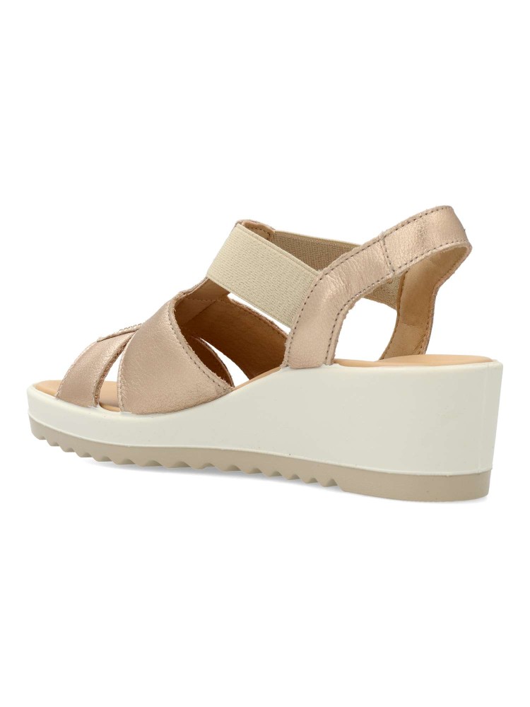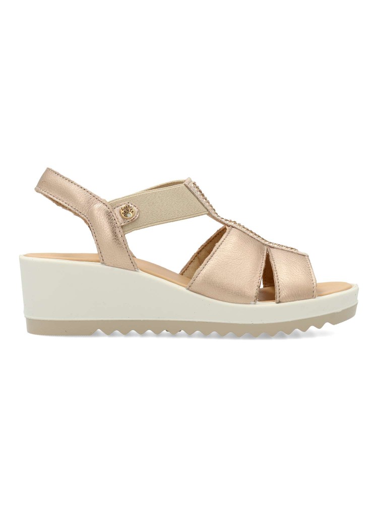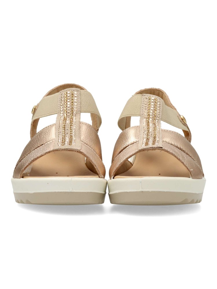 Sandalia con elásticos laterales. Suela de goma termoplástica, exterior y planta de piel. Plantilla acolchada, forro transpirable, planta anatómica, suela ligera y flexible. Altura 5 cm. Garantiza el máximo confort. Color beige. Hecho en Italia.