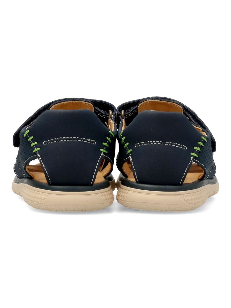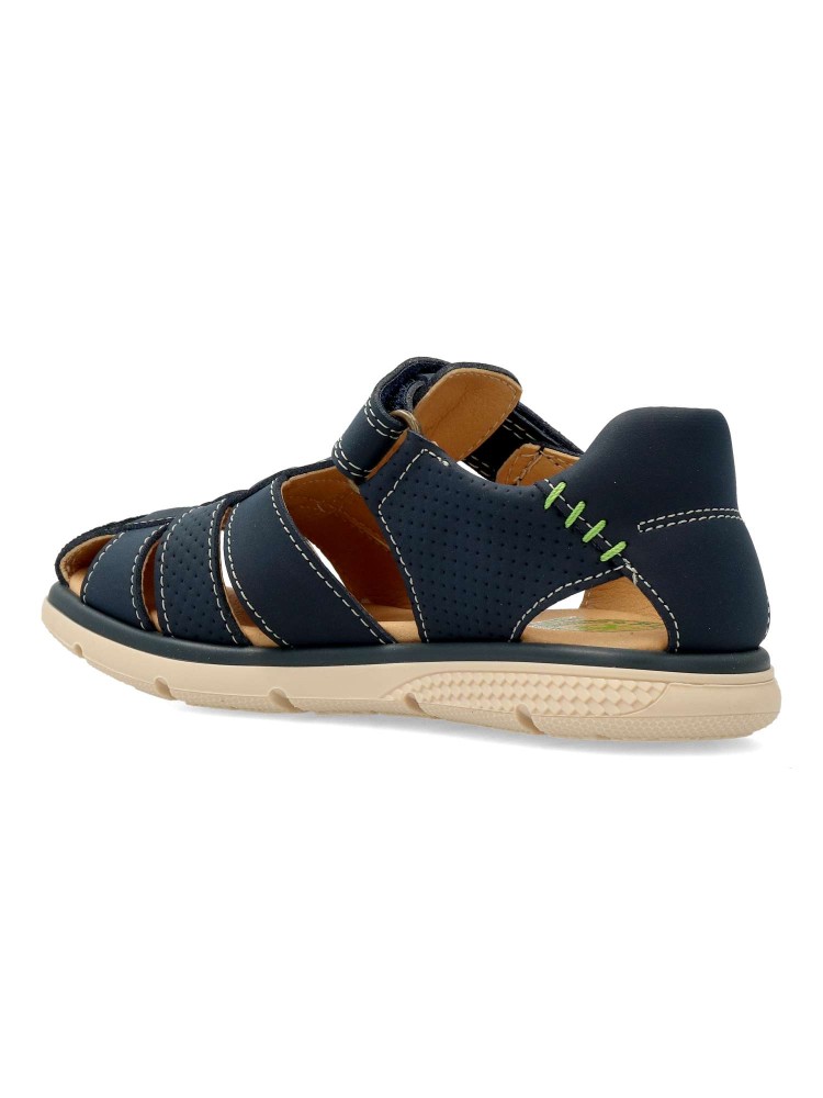 Sandalias de niño frescas y cómodoas. Cierre adherente. Color marino. Fabricado en Microfibra textil transpirable y de alta resistencia. Plantilla amortiguadora superabsorbente y antibacterias. Piso de goma antideslizante. Hecho en España.