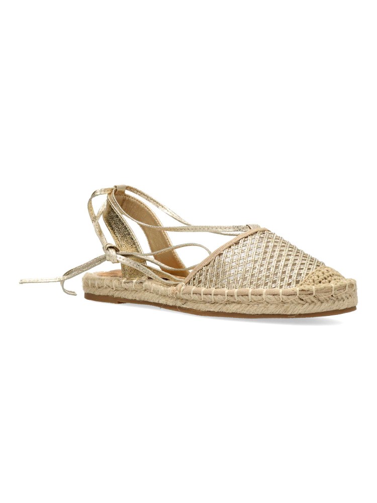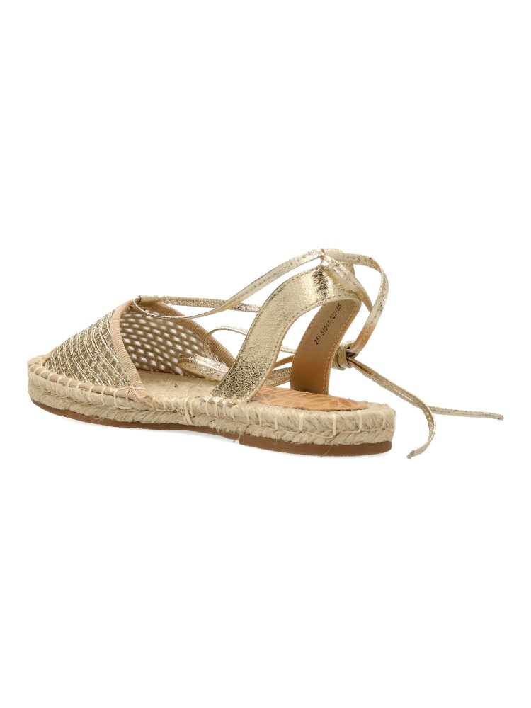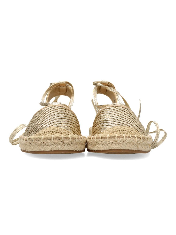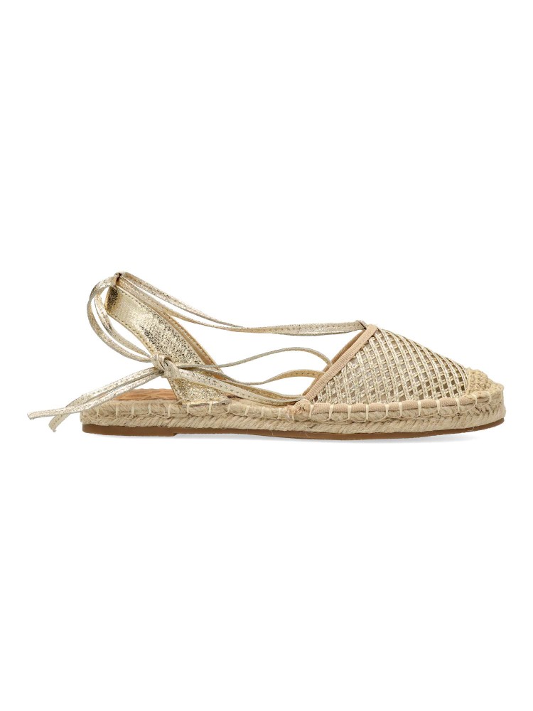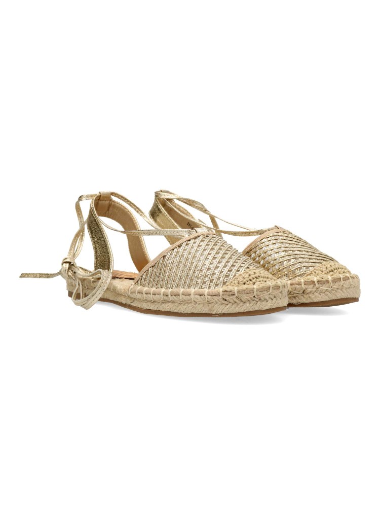 Sandalias alpargatas planas de color dorado para mujer de Mustang. Combinan una suela de esparto con un diseño trenzado en la parte delantera. Las tiras cruzadas se atan alrededor del tobillo para mayor sujeción. Diseño original y versátil para verano.
