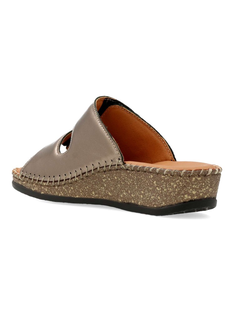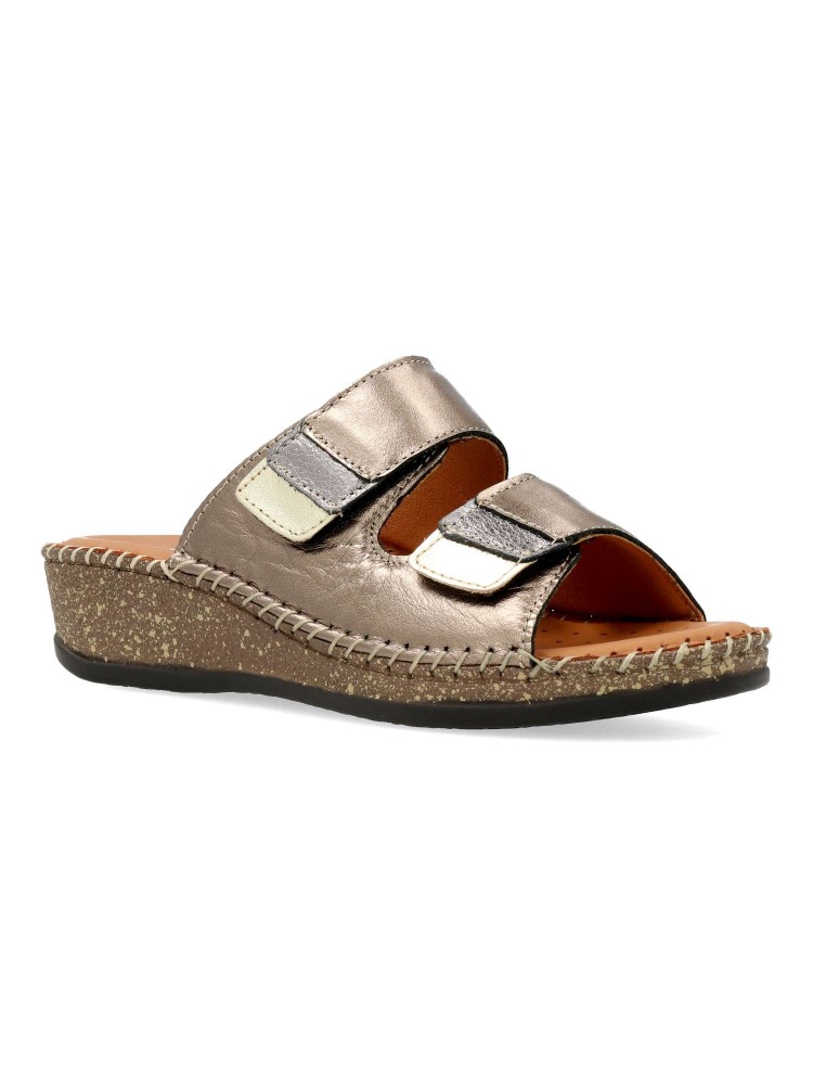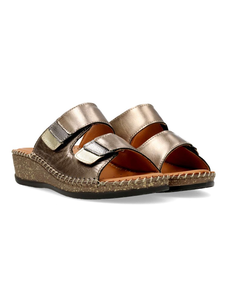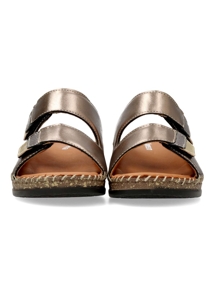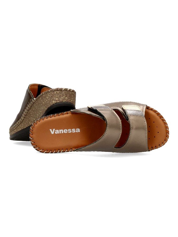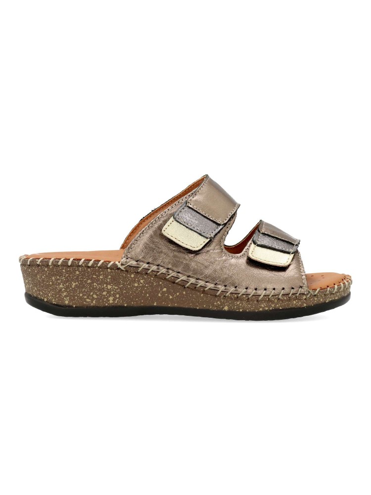 Sandalia cómoda de mujer, fabricada en piel natural. Pala de tiras adherentes. Planta de piel acolchada. Suela de goma ligera y flexible. Cuña de 4 cm. Disponible en color bronce. Diseño y máximo confort para tus looks de verano.