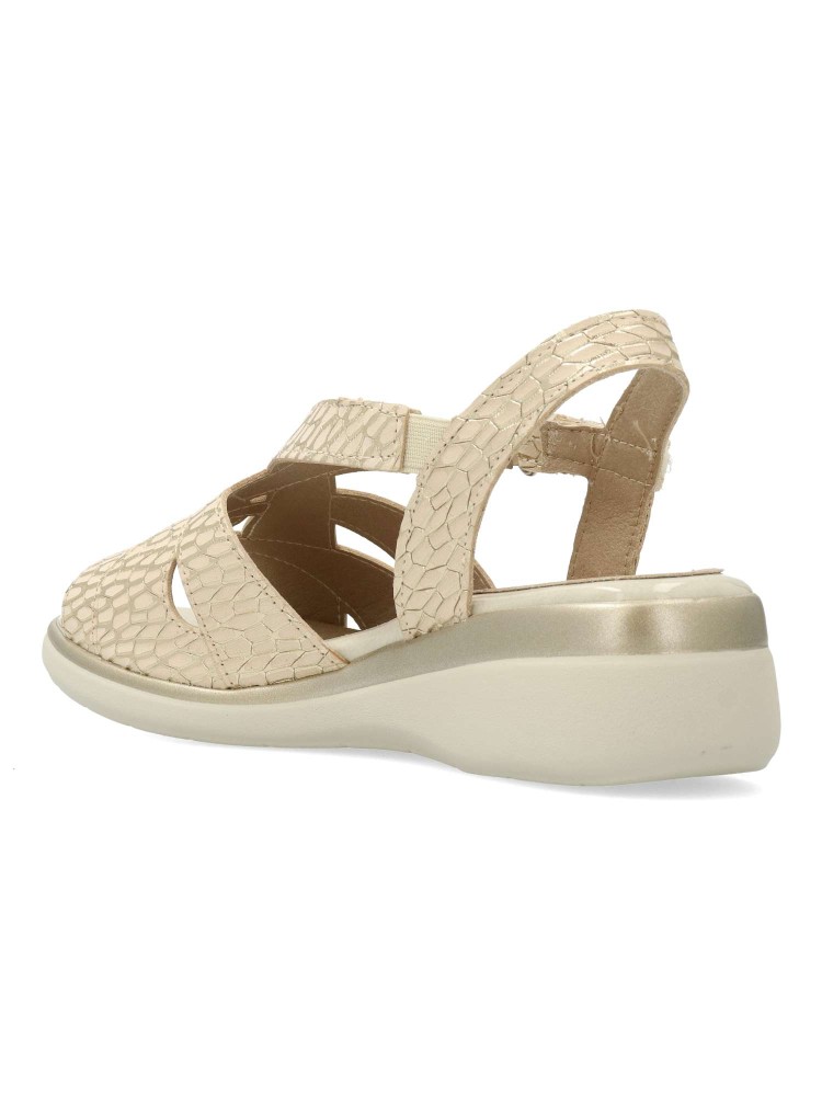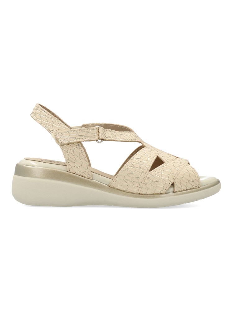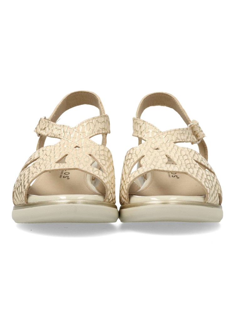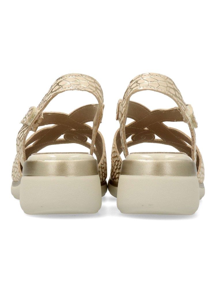 Sandalia cómoda de mujer, con cierre adherente. Fabricado en piel de primera calidad grabada, con suela de goma. Altura cuña 4,5 cm. Planta acolchada. Color oro. Proporcionan calidad, comfort y bienestar, para disfrutar de un calzado hecho a medida.