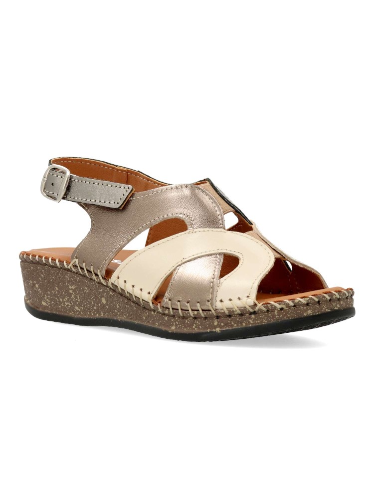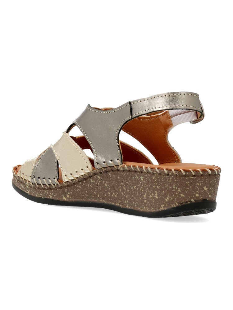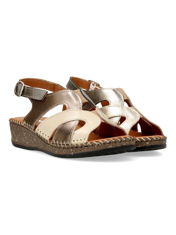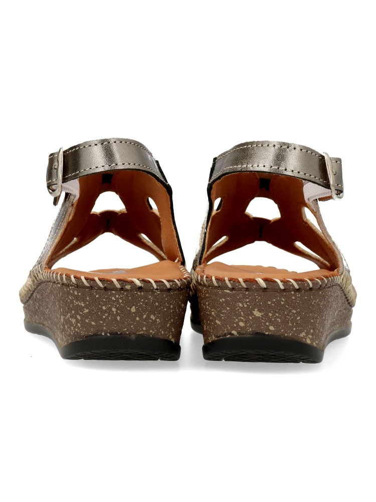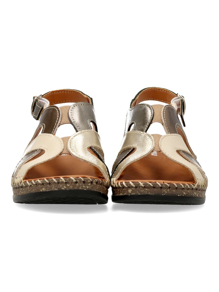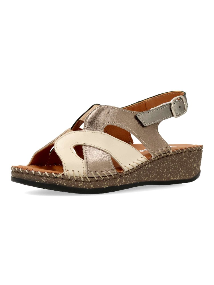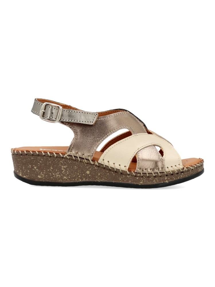 Sandalia cómoda de mujer, fabricada en piel natural. Pala de tiras cruzadas con elástico al empeine. Planta de piel acolchada. Suela de goma ligera y flexible. Cuña de 4 cm. Color bronce-hielo. Diseño y máximo confort para tus looks de verano.