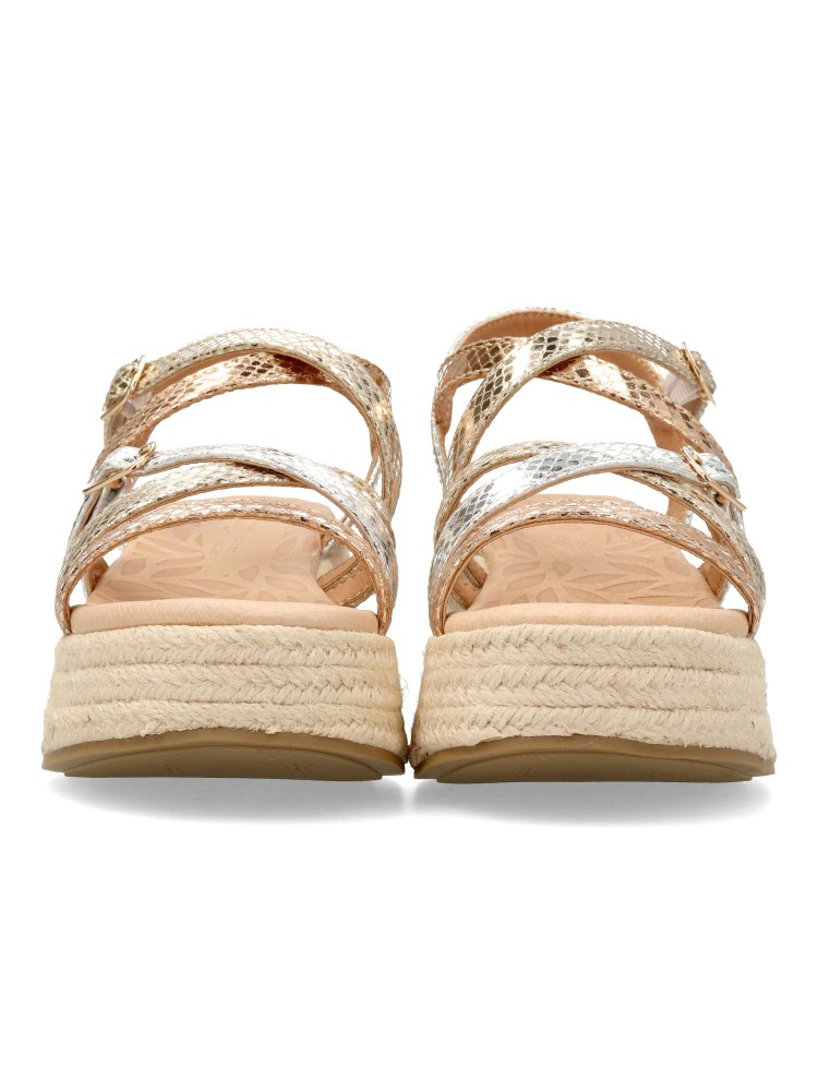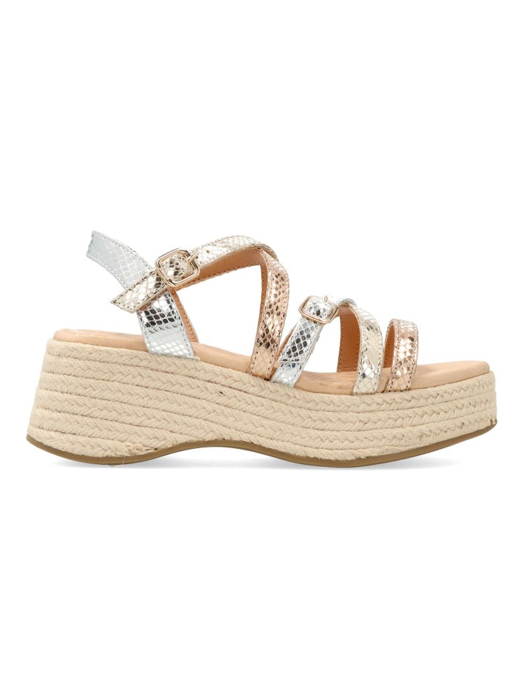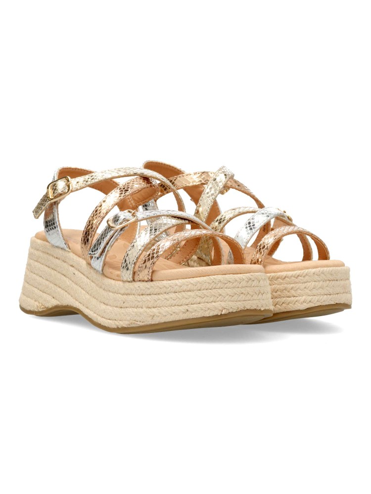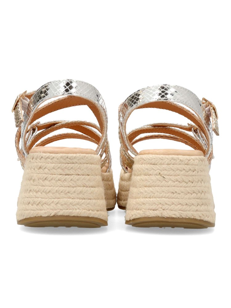 Sandalia dorada y plateada Giorgia para mujer de Mustang. Diseño con tiras cruzadas y cierre de hebilla al tobillo. Planta acolchada. Plataforma de yute de 6 cm. que proporciona altura y estilo. Ideal para agregar un toque brillante a cualquier conjunto.
