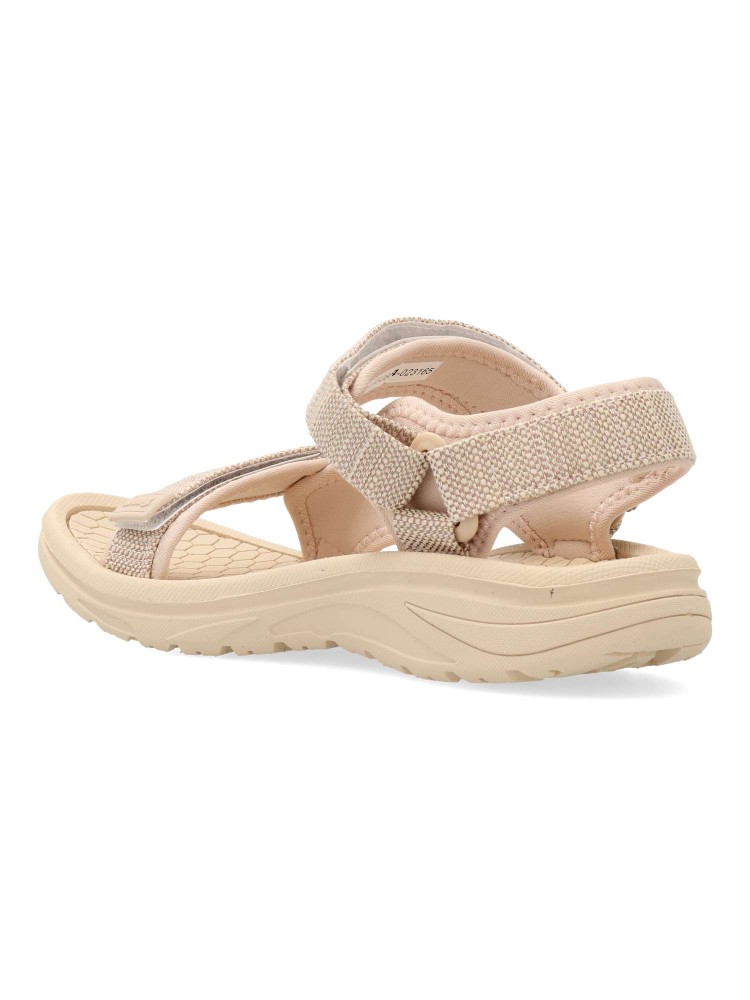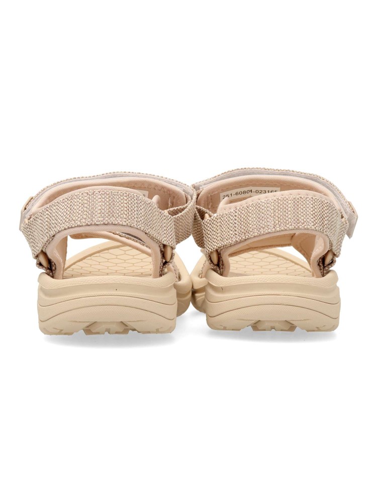 Sandalia beige modelo Tornado para mujer, de la marca Mustang. Correas ajustables con cierre adhesivo. Fabricado en textil, con suela de goma sport, ideal para los días de piscina o playa. ¡Tornado se adaptará a todas tus aventuras!