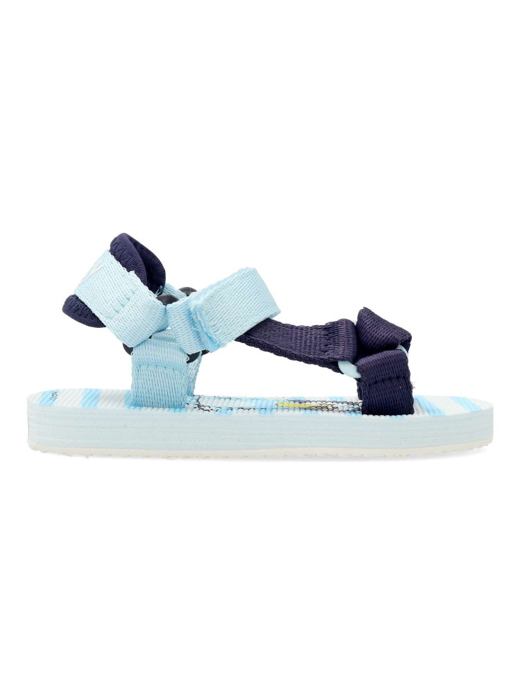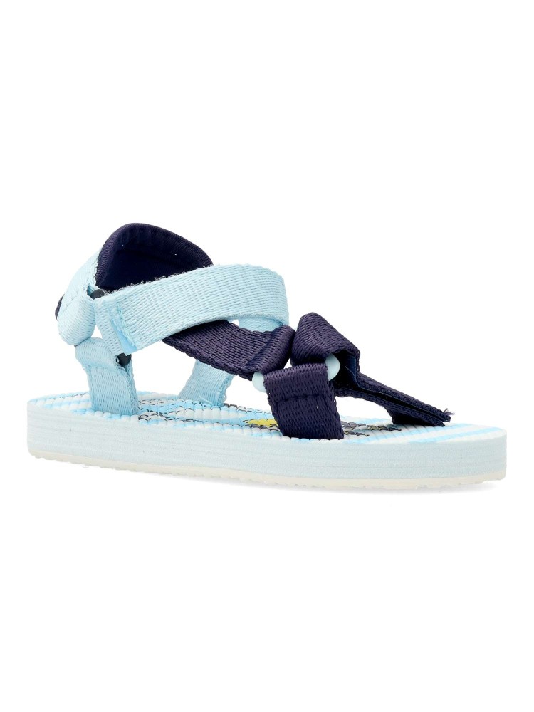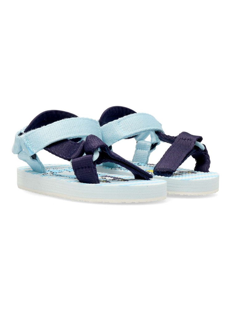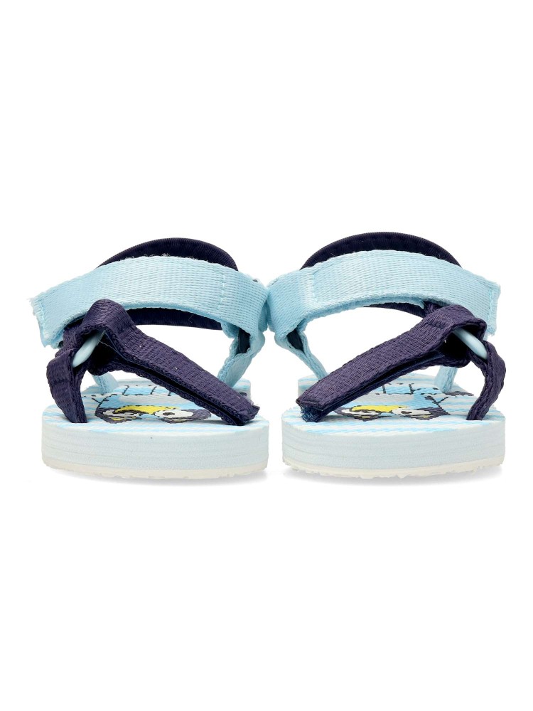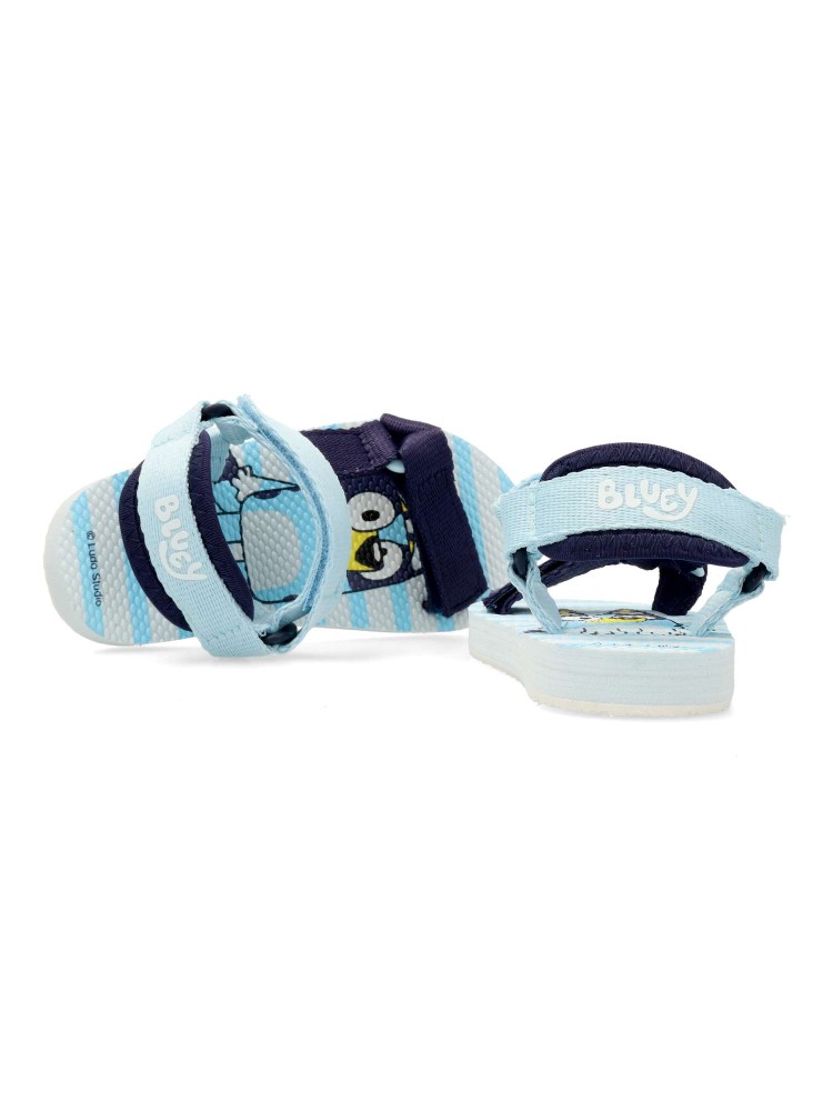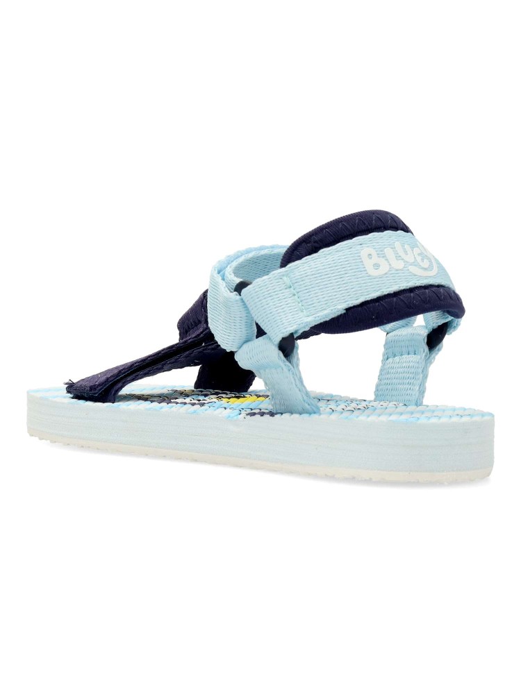 Chancla de playa para niño. Cierre adherente. Modelo tipo sandalia californiana, ideal para la playa y la piscina. Fabricado en textil con suela de goma eva. Color azul. Diseñado para el disfrute y confort de los niños. Dibujo estampado Bluey.