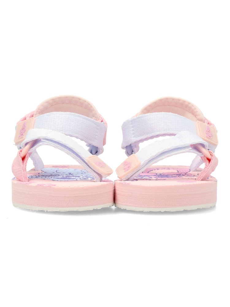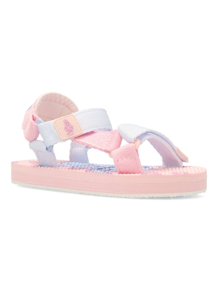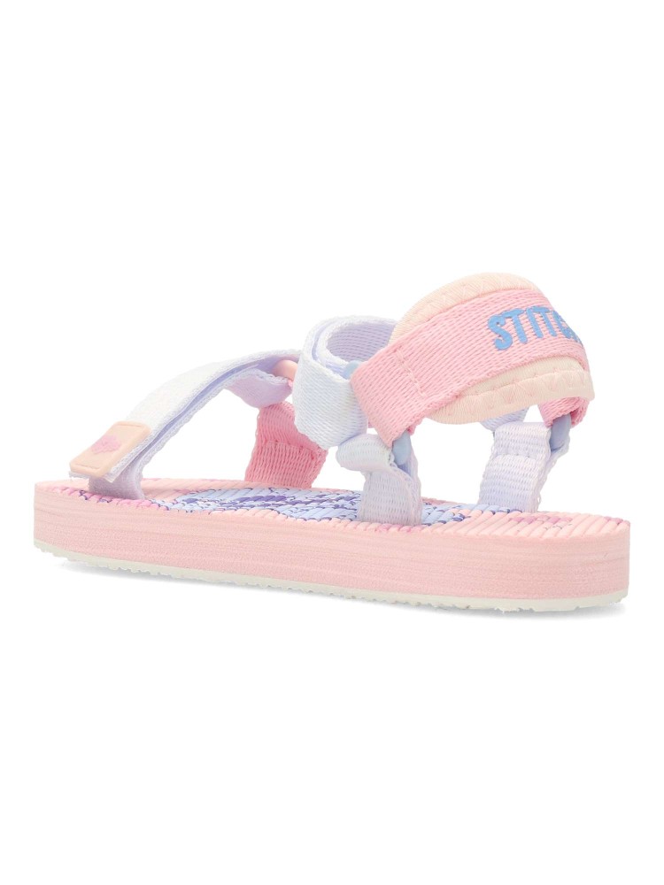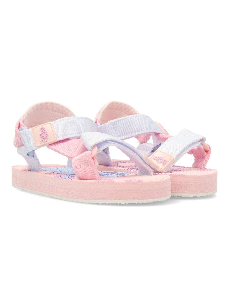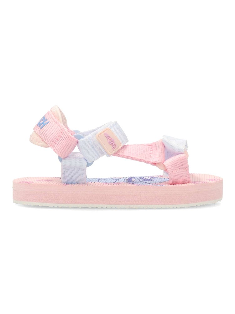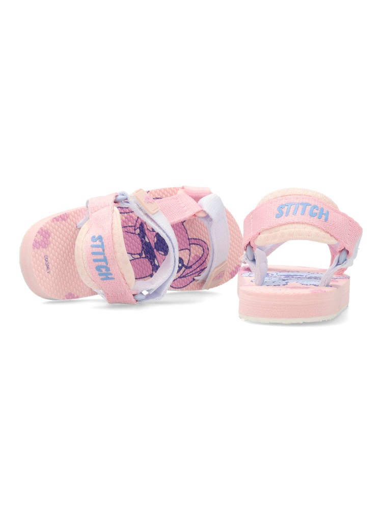 Chancla de playa para niña. Cierre de velcros. Modelo tipo sandalia californiana, ideal para la playa y la piscina. Fabricado en textil con suela de goma eva. Color rosa-lila. Diseñado para el disfrute y confort de las niñas. Dibujo estampado Stitch.