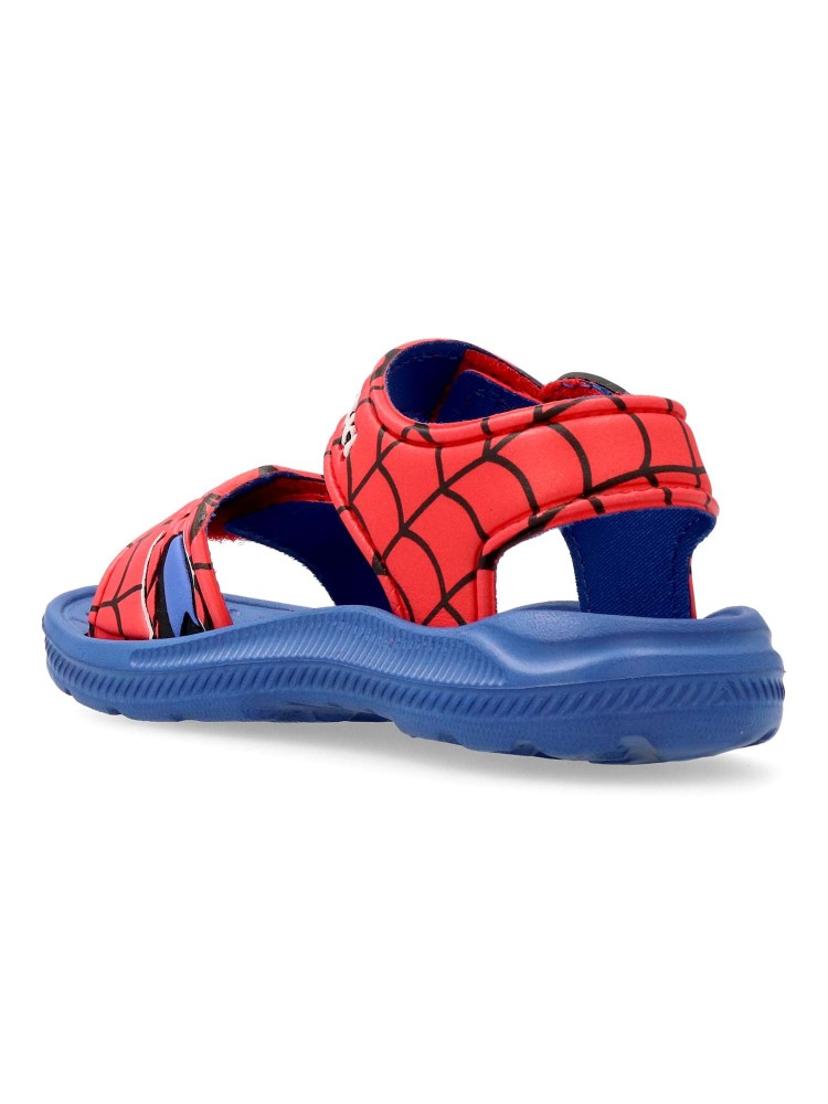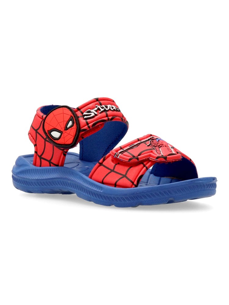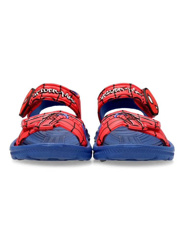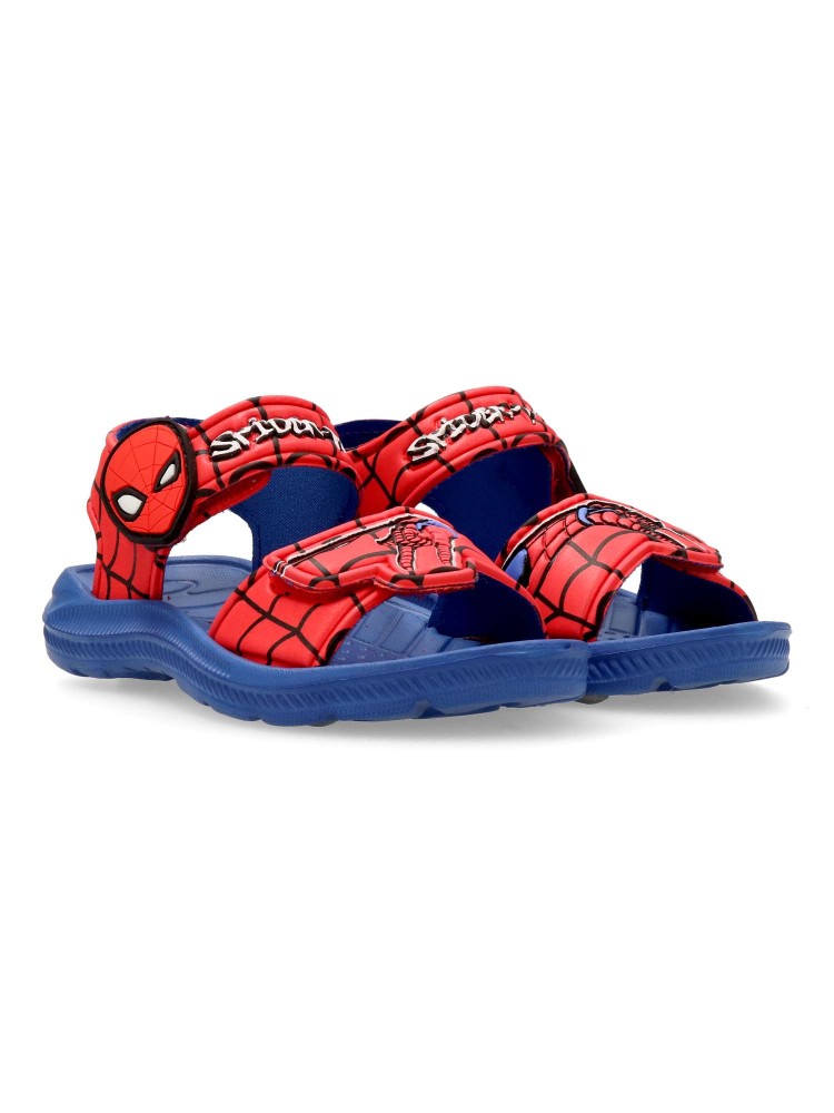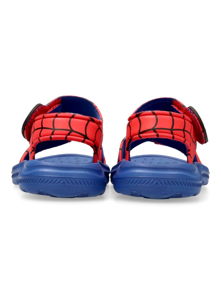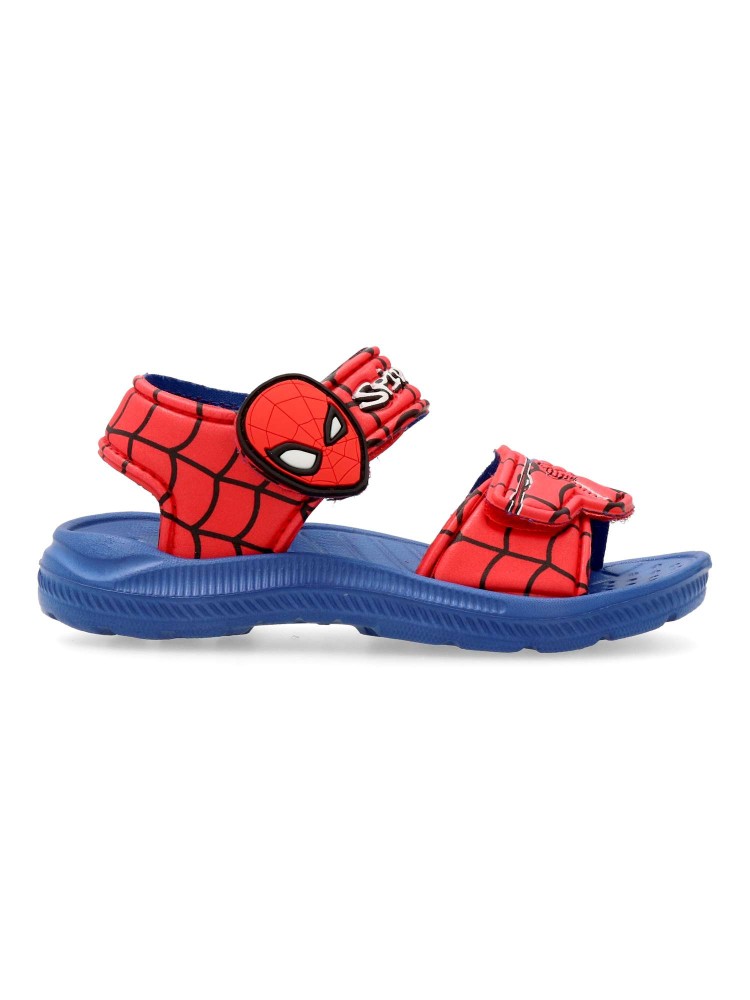 Chancla de playa para niño. Cierre adherente ajustable. Modelo tipo sandalia californiana, ideal para la playa y la piscina. Fabricado en goma eva. Disponible en color rojo-marino. Diseñado para el disfrute y confort de los niños. Dibujo Spiderman.