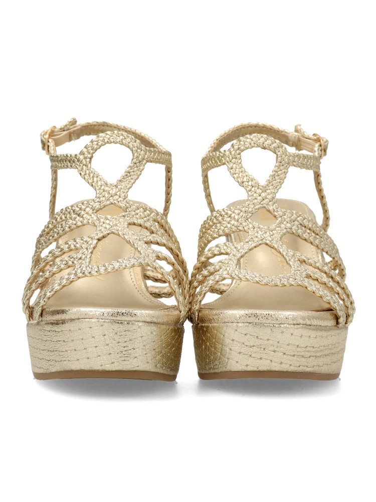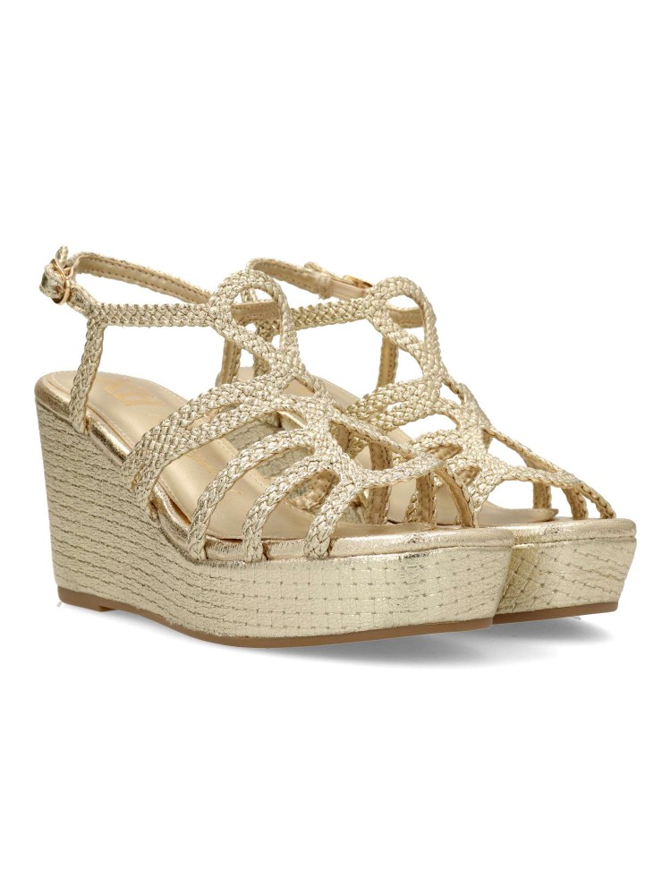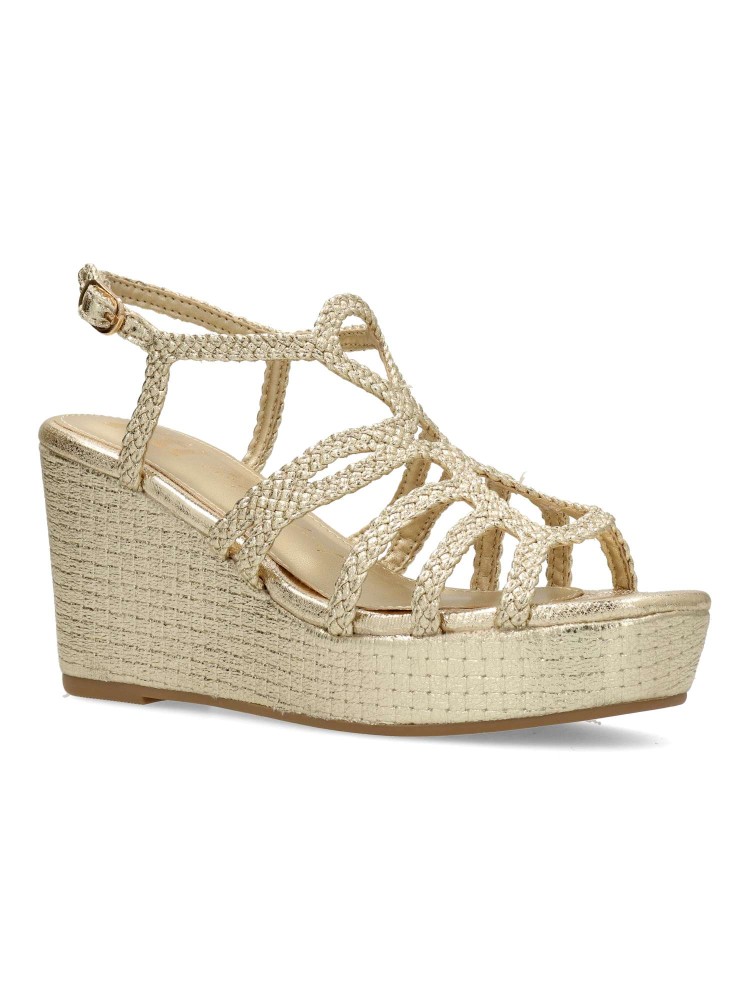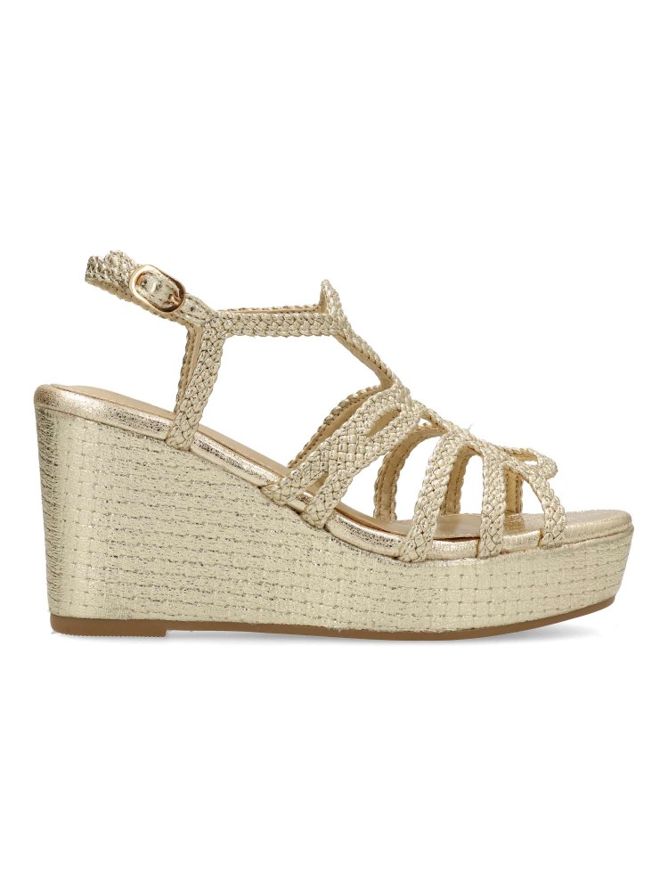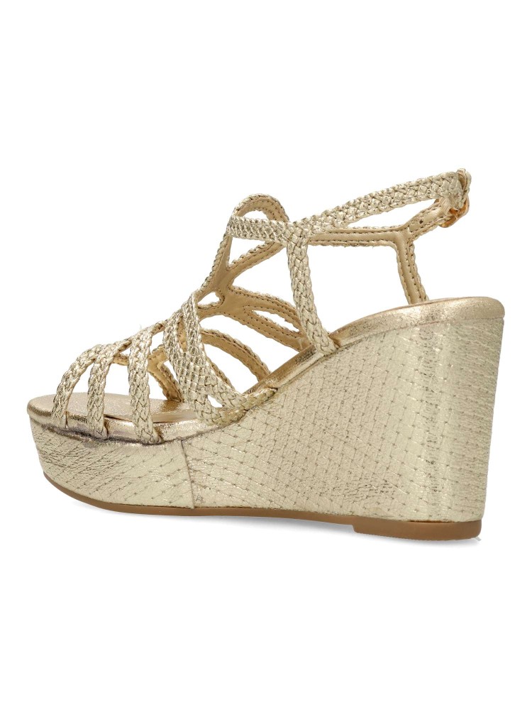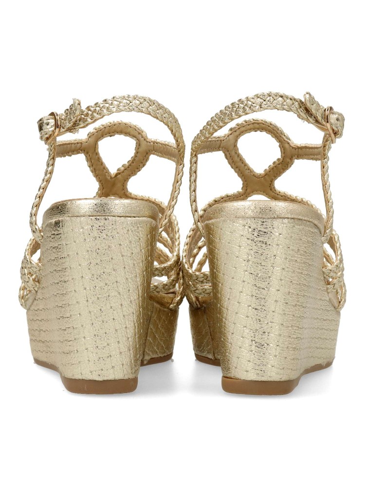 Sandalia de mujer con tiras trenzadas. Fabricado en piel sintética metalizada, con suela de goma antideslizante. Altura cuña 8 cm. Plataforma de 3 cm. Es la combinación perfecta de glamour y confort, ideal para lucir radiante en cualquier ocasión.