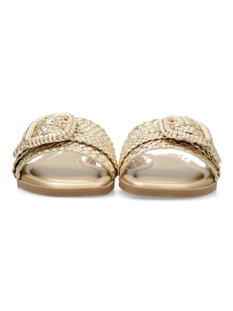 Sandalia de mujer con diseño de pala trenzada y hebilla decorativa. Sandalia plana metalizada, fabricada en piel sintética, con suela de goma antideslizante. Planta acolchada. Un toque moderno y sofisticado para los días calurosos. Certificado vegano.