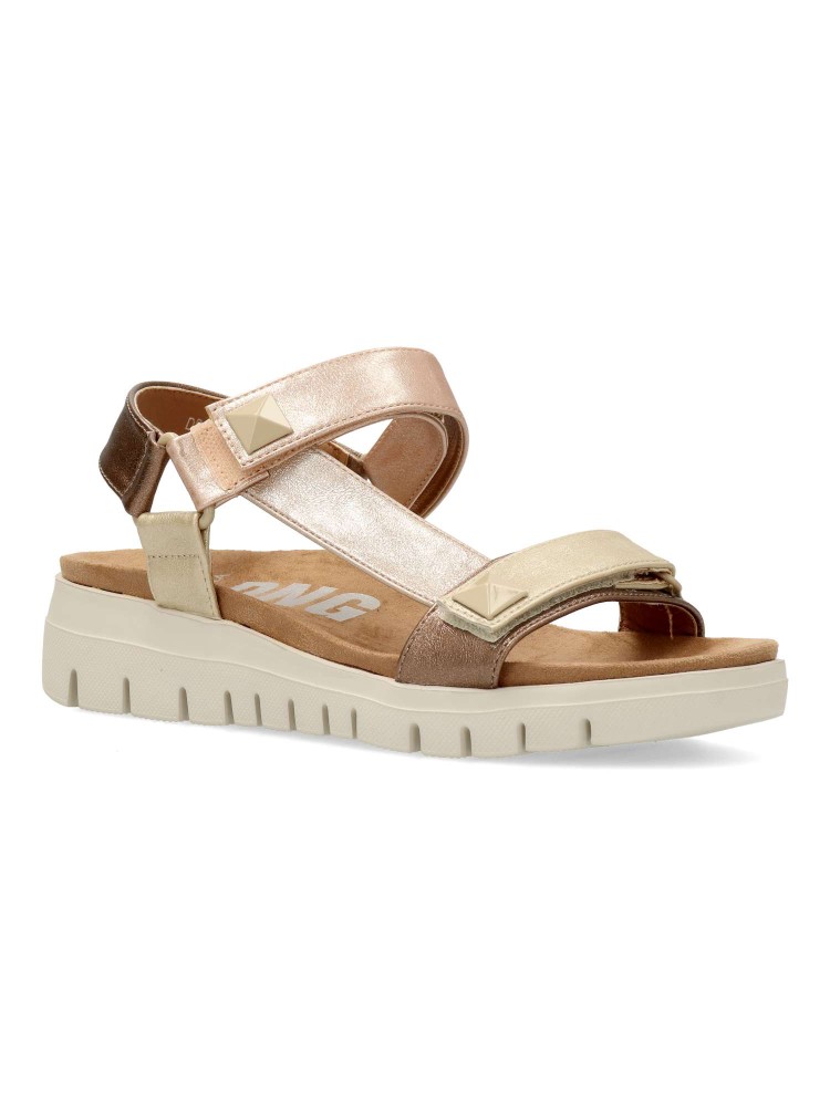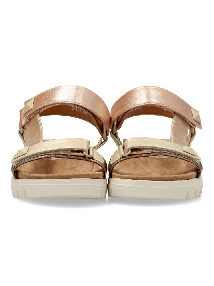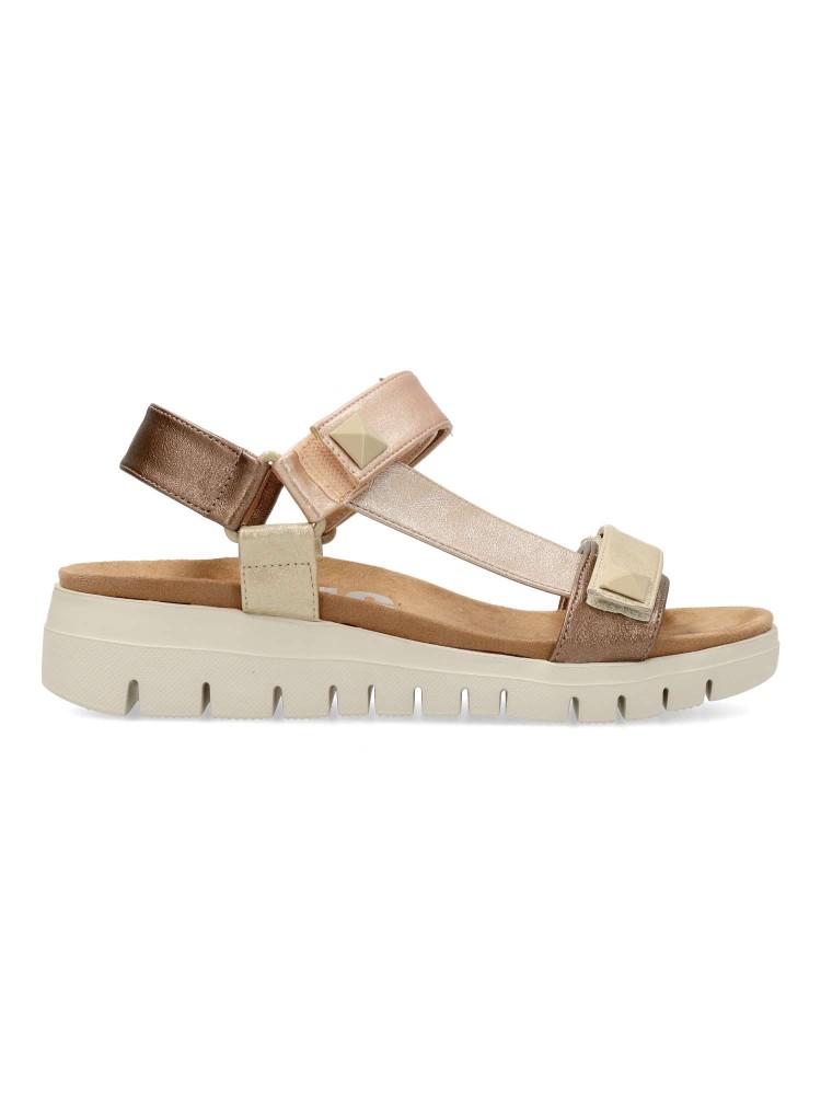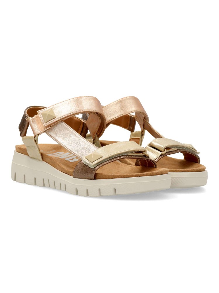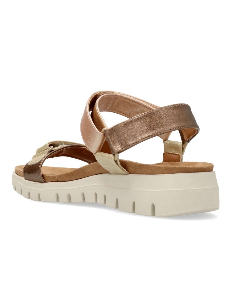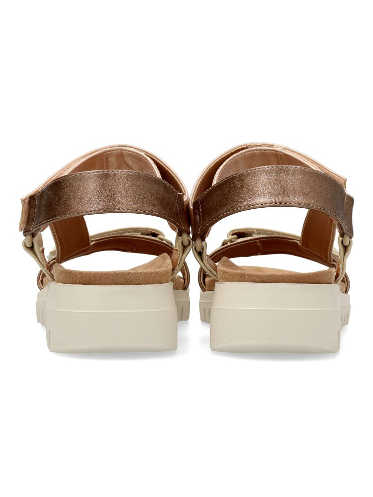 Sandalia de mujer estilo casual. Modelo metalizado con cierre de tiras adherentes. Fabricado en piel sintética, con suela de goma flexible. Planta acolchada. Color platino-bronce. Pequeña cuña de 3,5 cm. Máximo confort con tus outfits de verano.