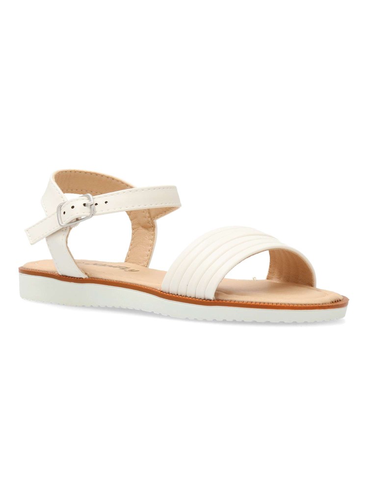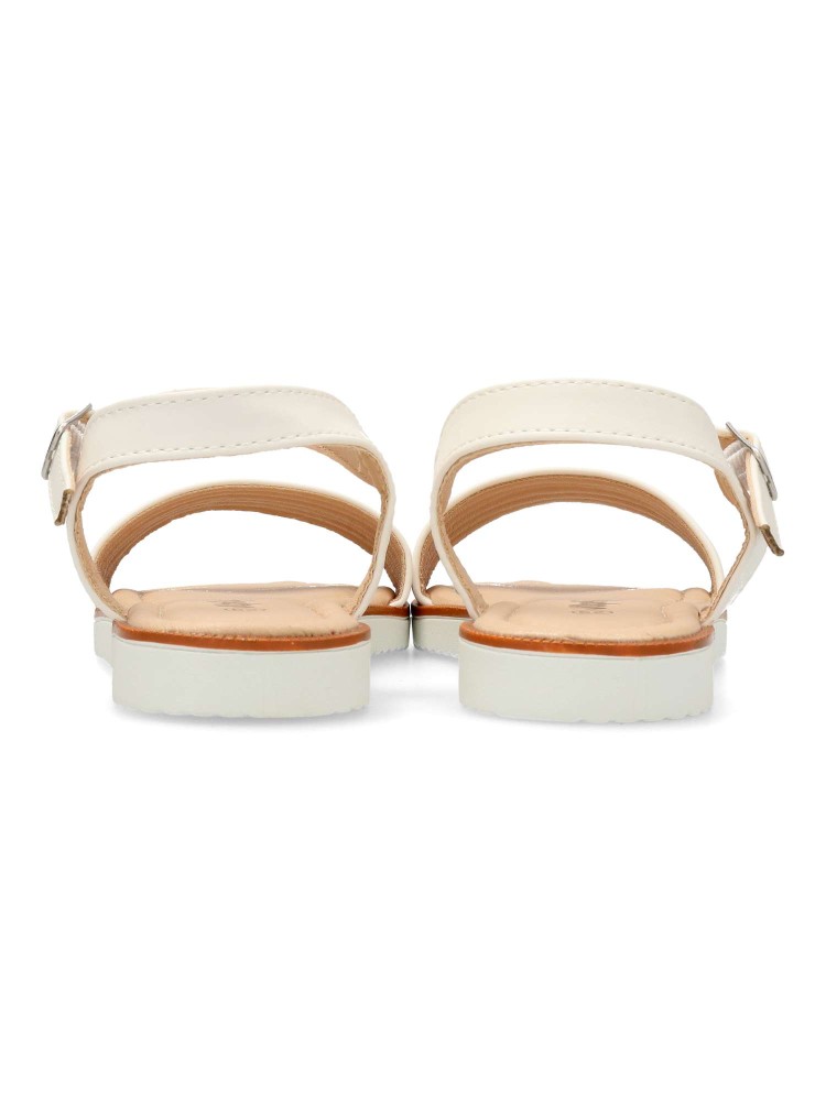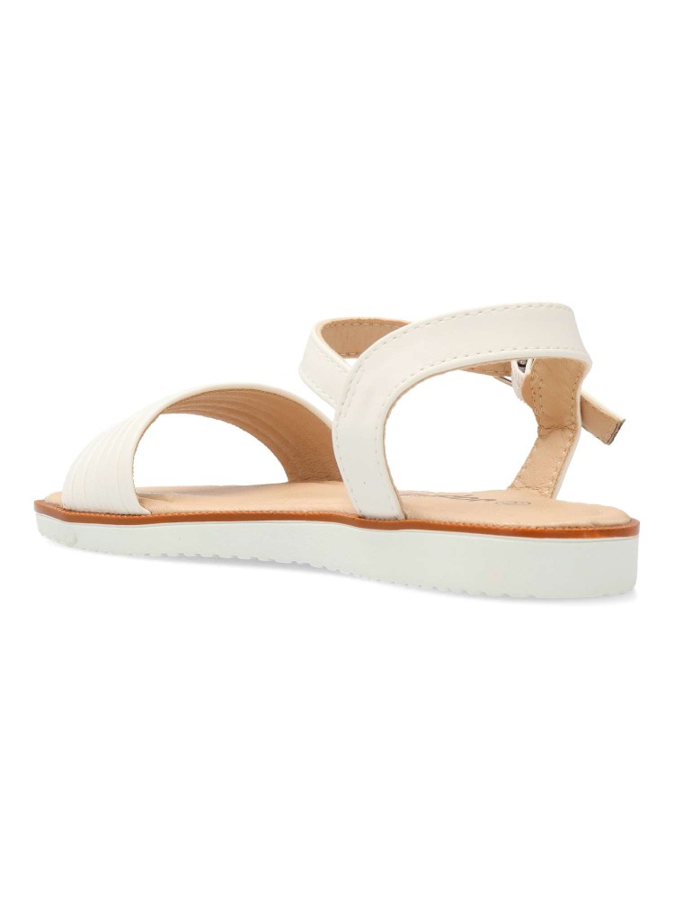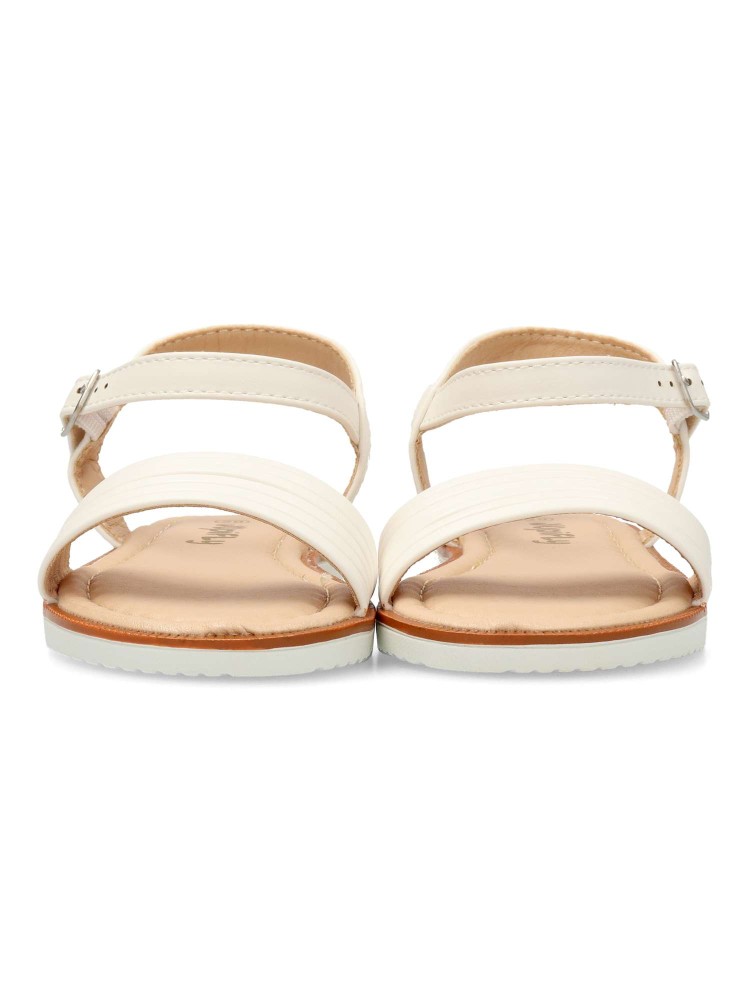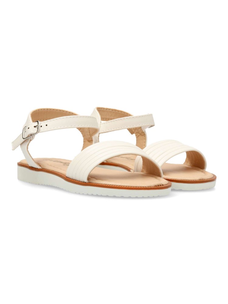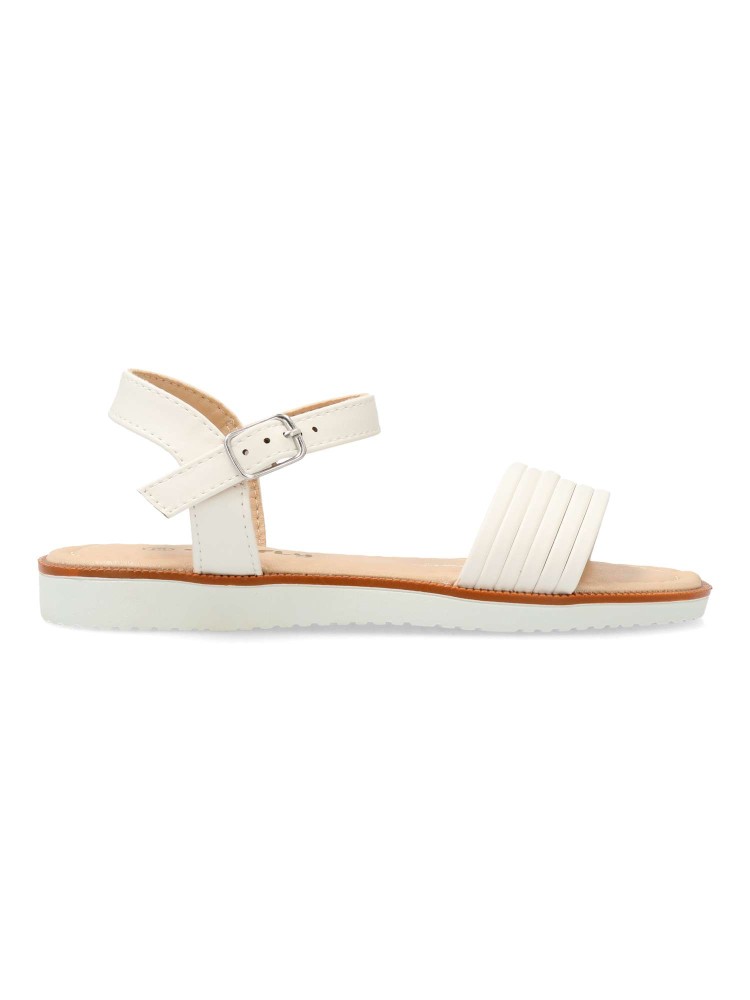 Sandalia vestir de tiras color blanca. Cierre de hebilla al tobillo. Modelo cómodo con planta acolchada. Fabricada en material sintético con suela de goma flexible. Diseñado para poder combinarlos con faldas, vestidos y conjuntos de verano.
