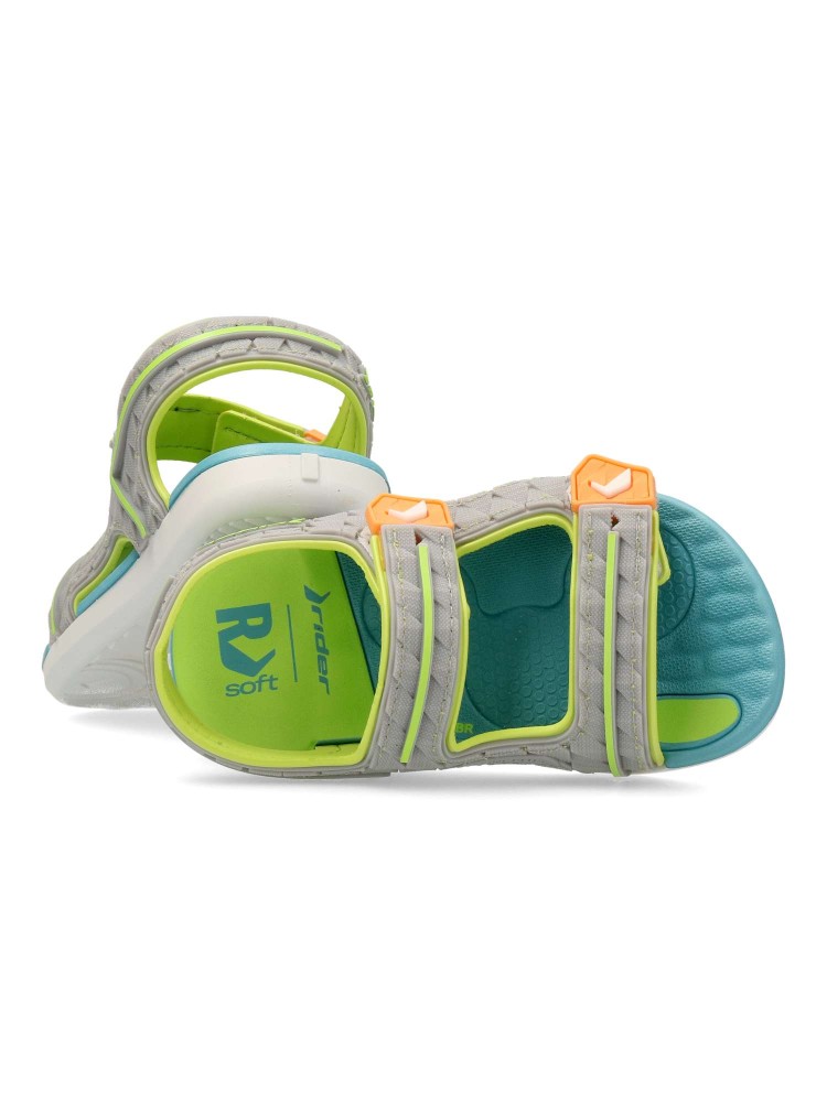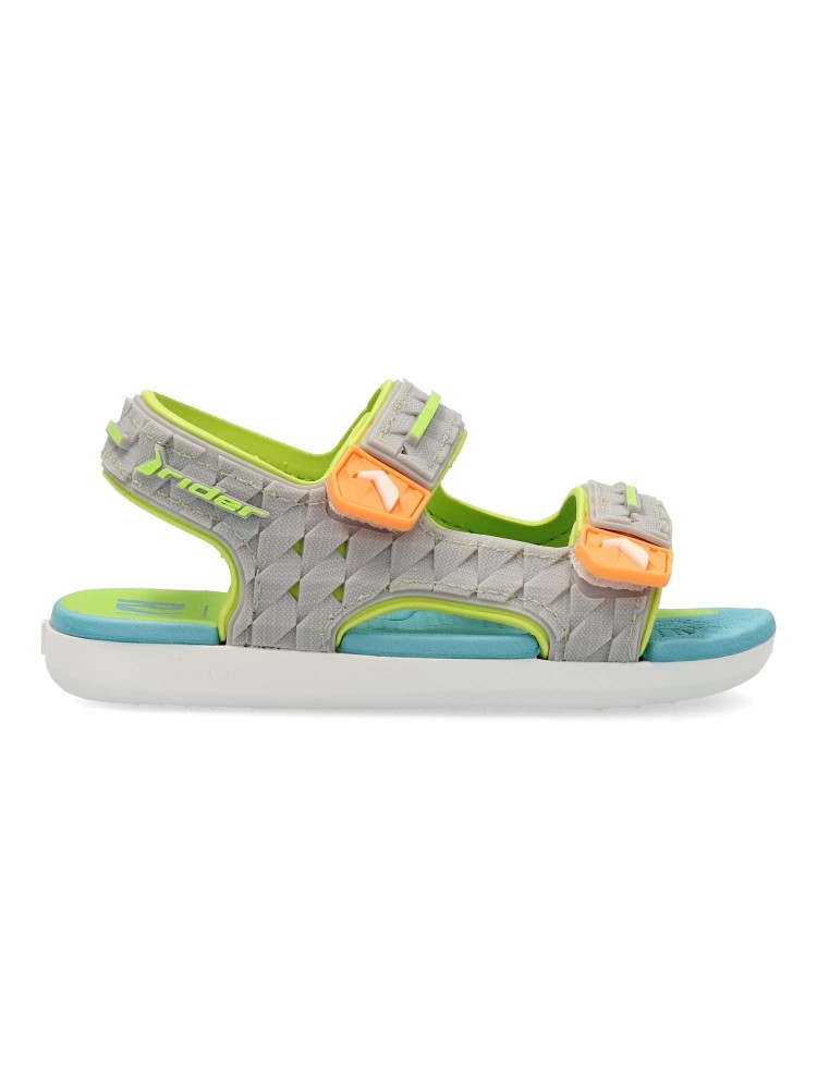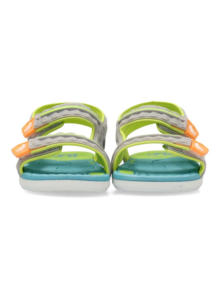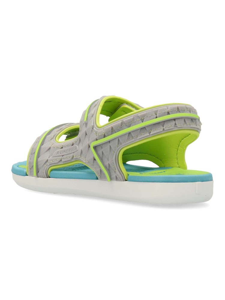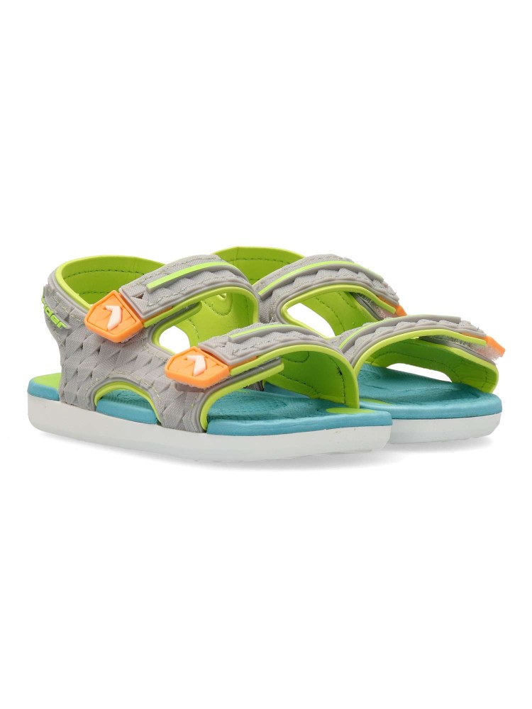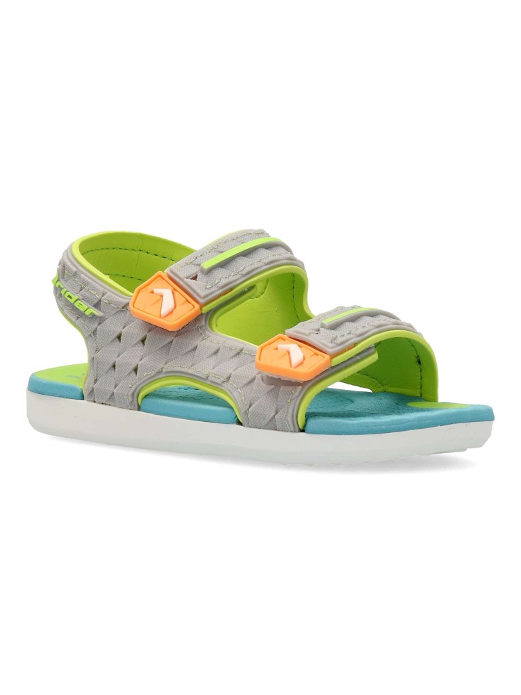 Chancla de playa cómoda para niño. Chanclas tipo sandalia californiana, ideal para la playa o la piscina, suela de goma anatómica, flexible y ligera. Cierre de doble velcro. Chanclas brasileñas innovadoras y elegantes. Disponible en color blanco-verde.