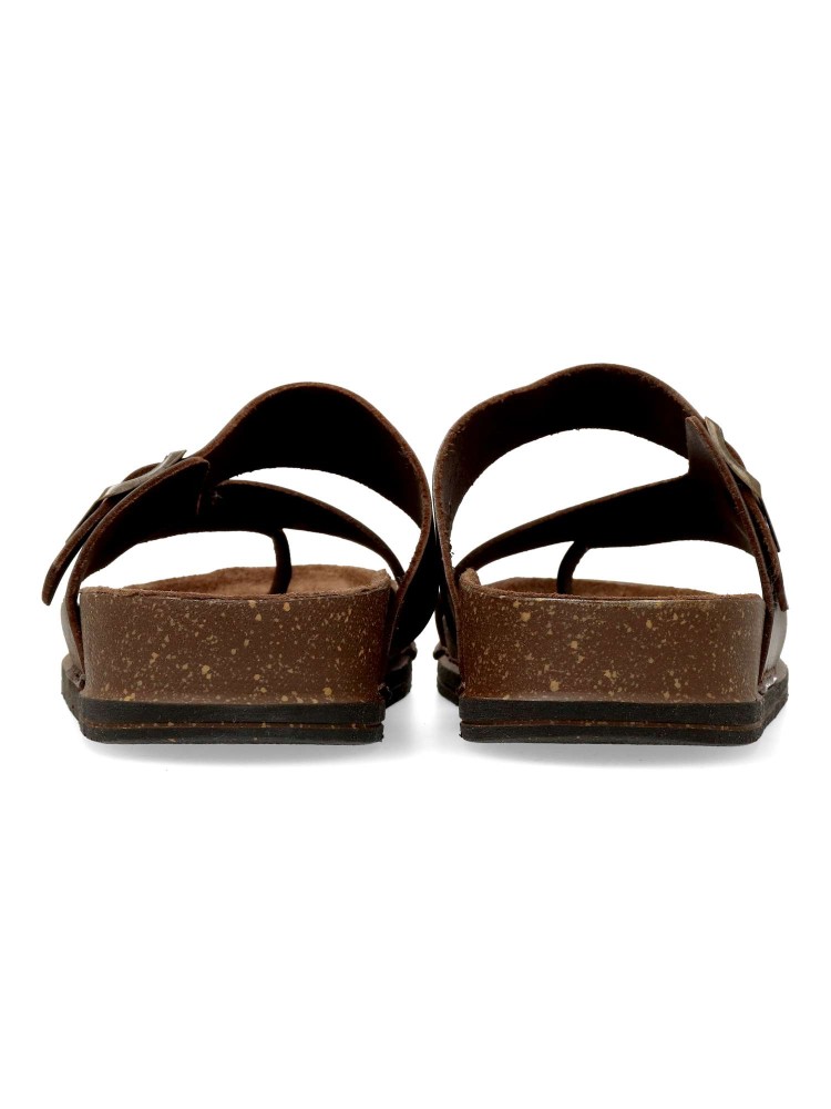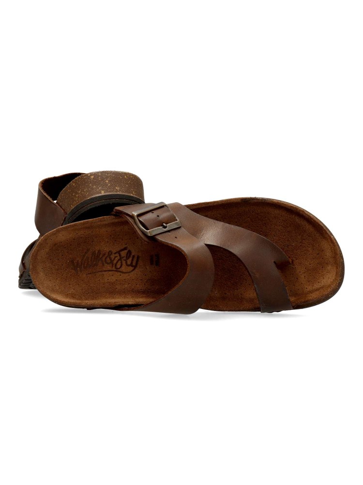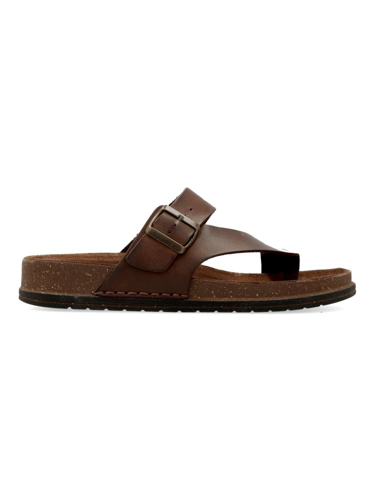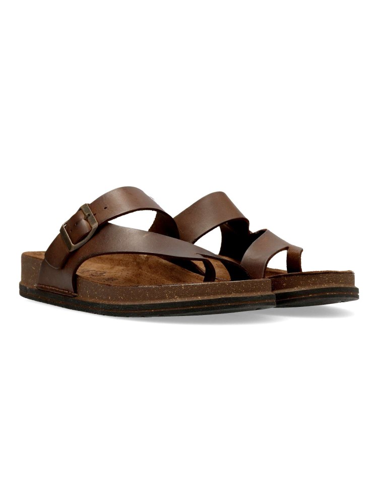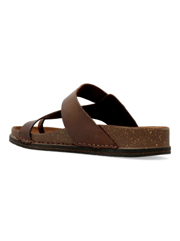 Sandalia cómoda de hombre fabricada en piel de primera calidad, con suela de goma termoplástica. Modelo tipo esclava con ajuste de hebilla. Planta acolchada. Disponible en color marrón. Diseño y confort en tus paseos de verano. Walk & Fly.