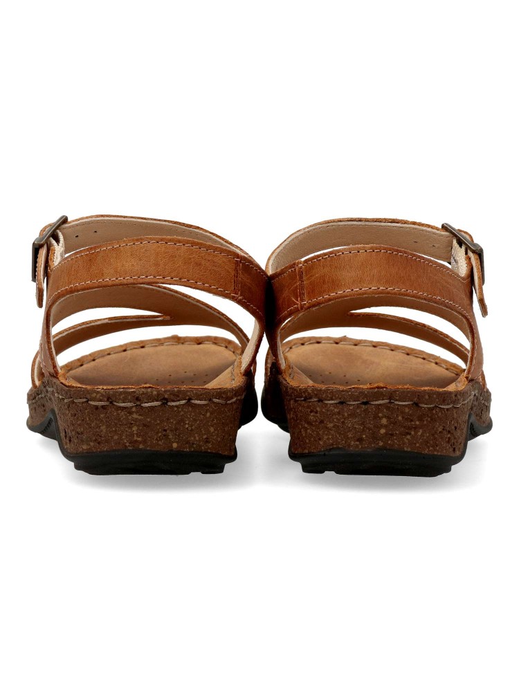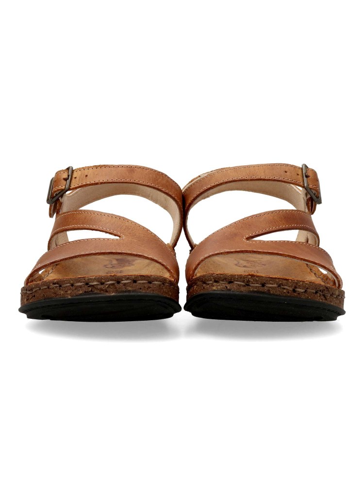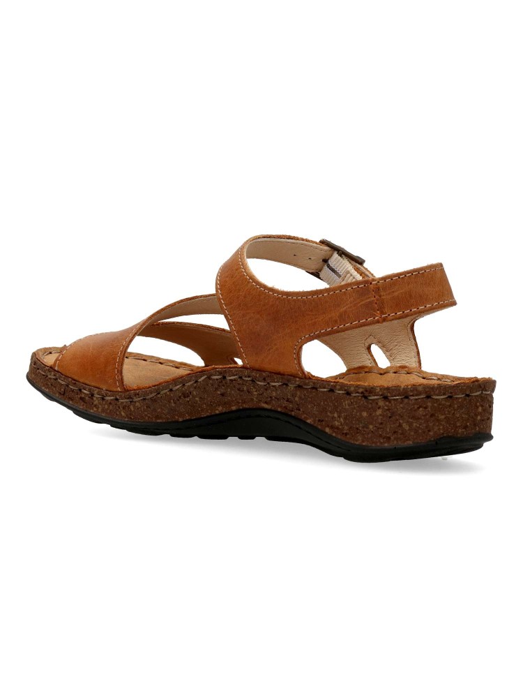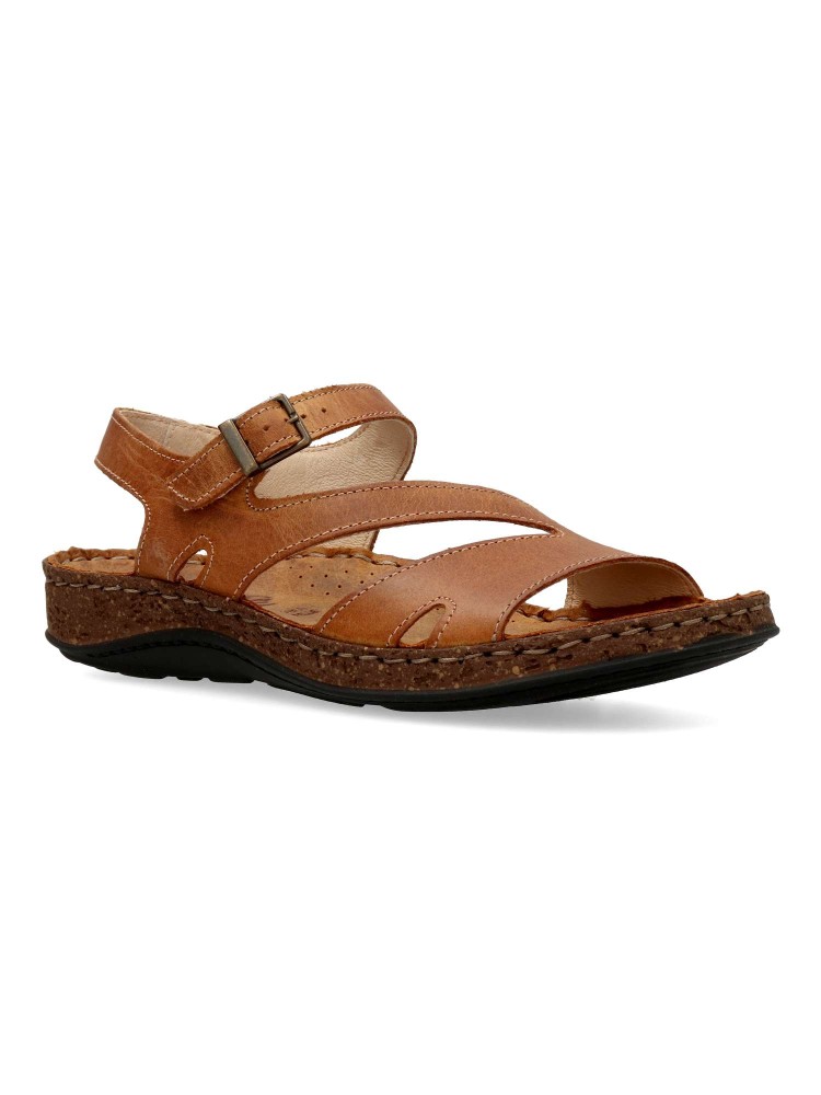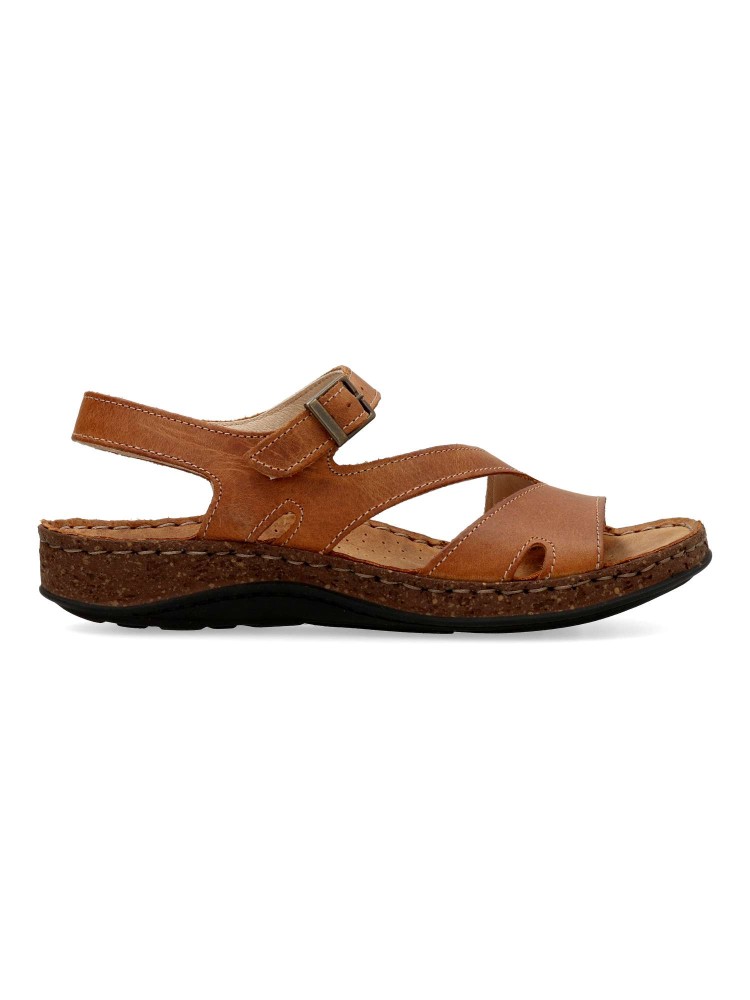 Sandalia cómoda de mujer fabricada en piel de primera calidad, con suela de goma termoplástica. Modelo de tiras con cierre de hebilla. Planta acolchada. Disponible en color cuero. Diseño y confort hechos para ti. Walk & Fly.