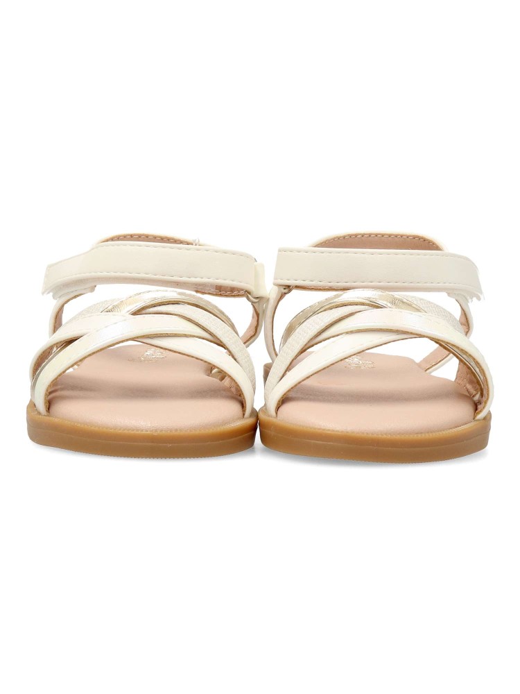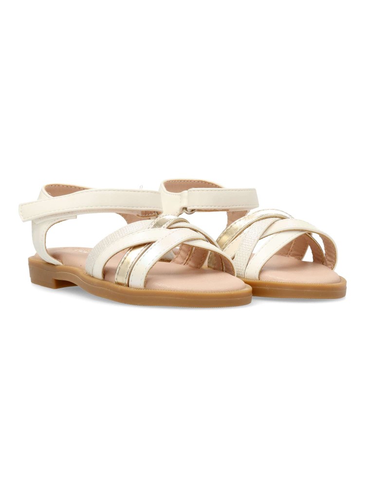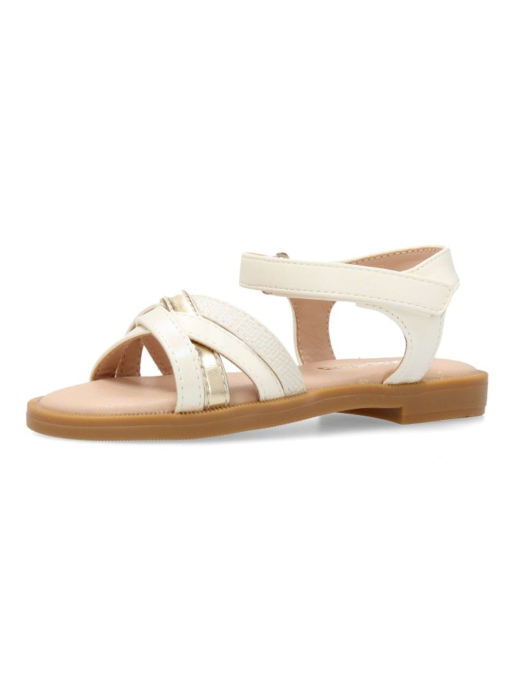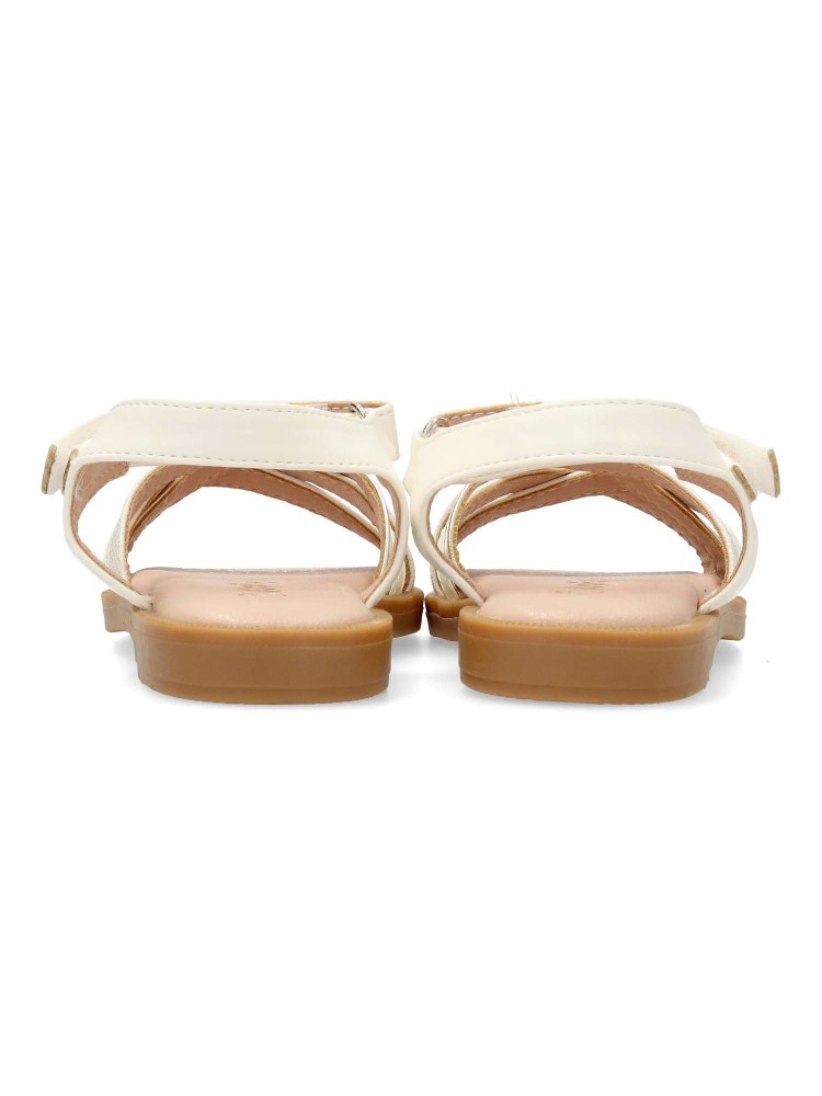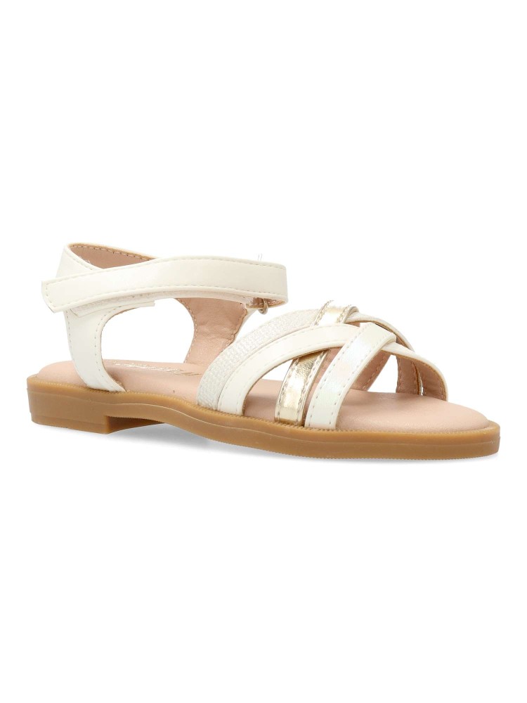 Sandalia vestir de tiras curzadas. Cierre adherente. Modelo cómodo con planta acolchada. Fabricada en material sintético con suela de goma flexible. Color blanco y blanco nacarado. Diseñado para poder combinarlos con faldas, vestidos y conjuntos de verano