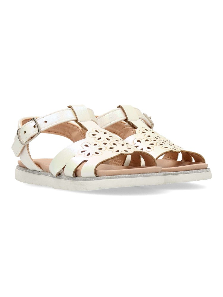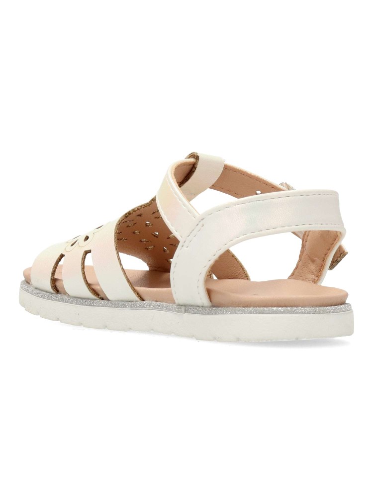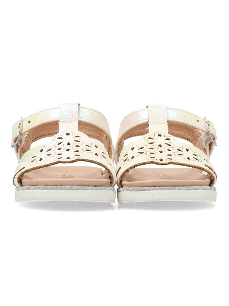 Sandalia de niña con cierre de hebilla. Modelo de vestir cómodo con planta acolchada. Fabricada en material sintético con suela de goma flexible. Color blanco nacarado. Diseño elegante y confort, ideal para conjuntar con faldas y conjuntos de verano.