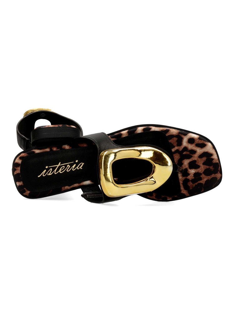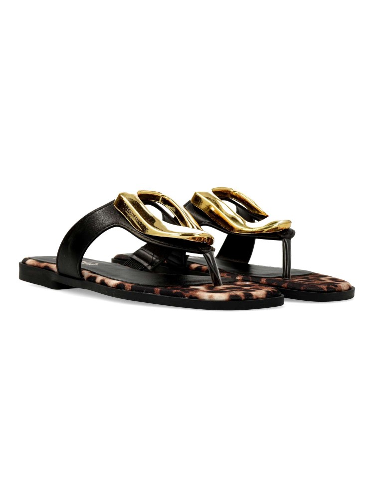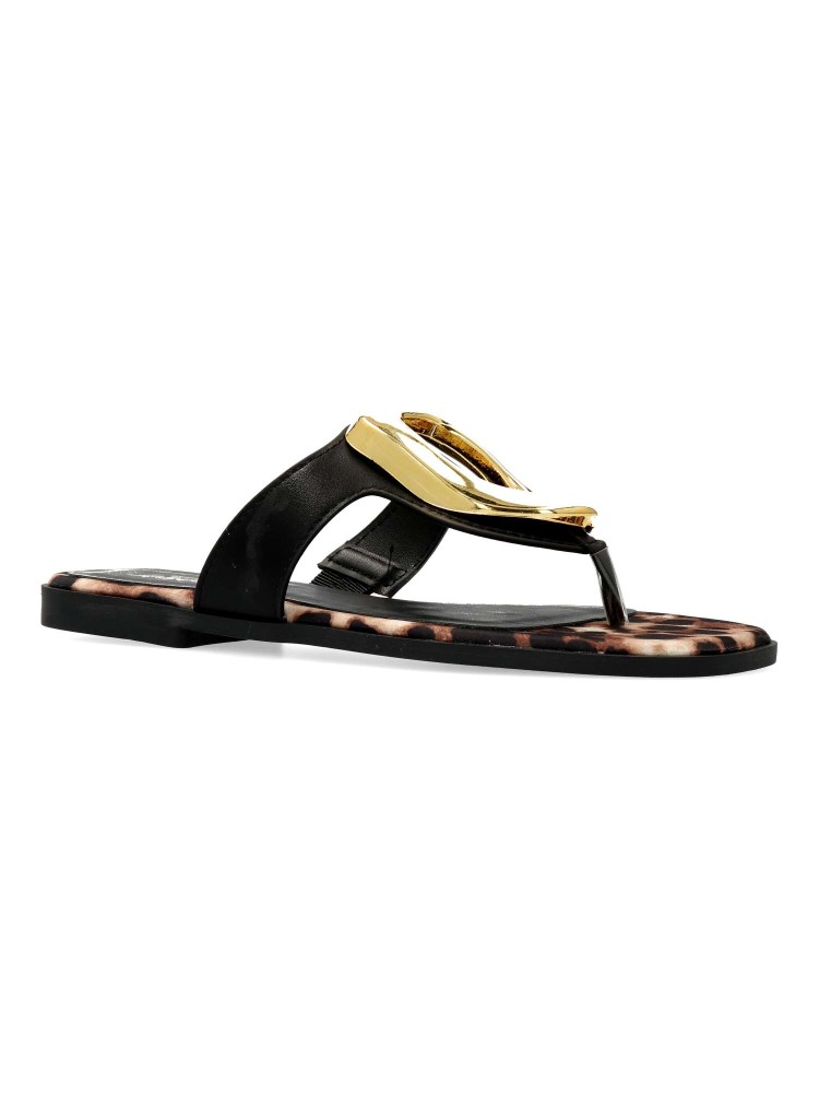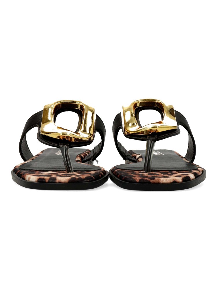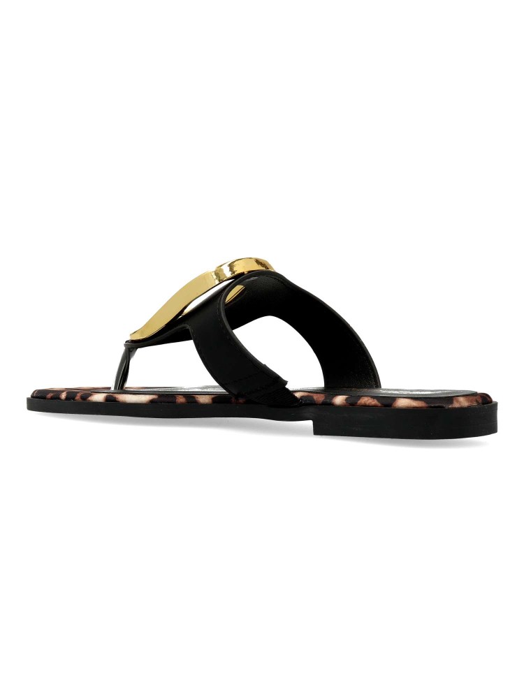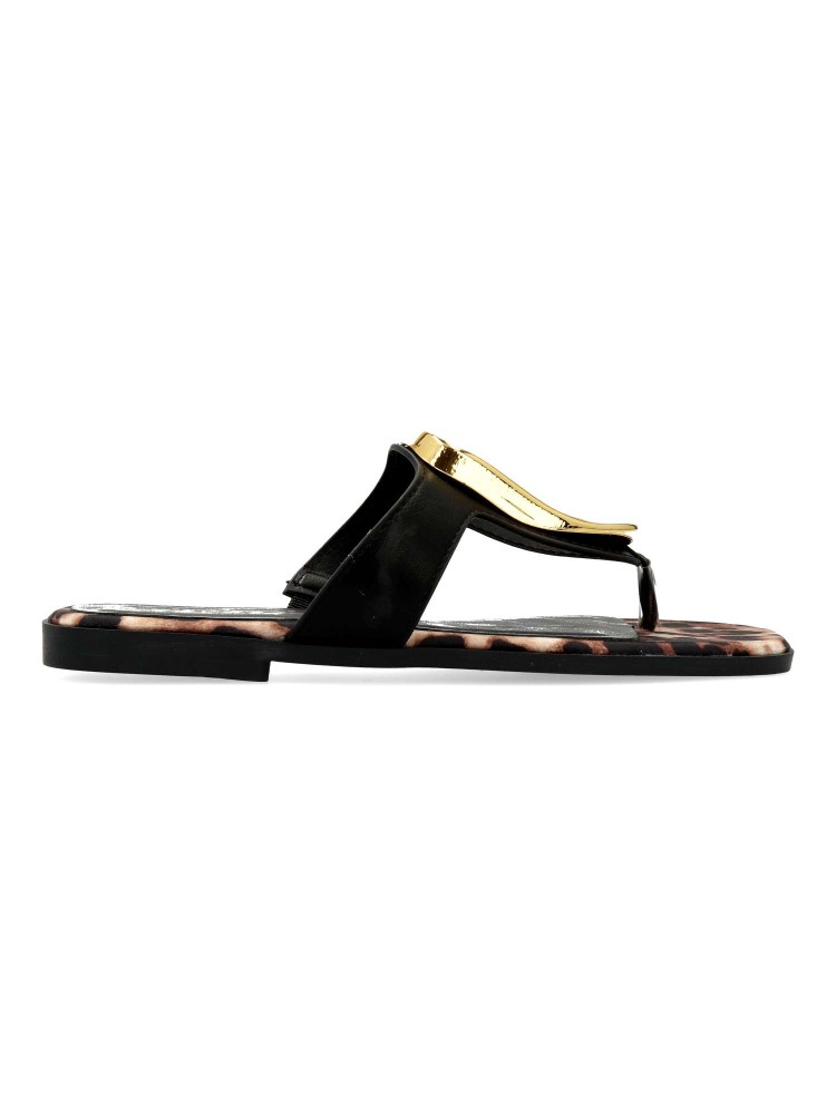 Sandalia plana y cómoda tipo esclava. Fabricada en material sintético, con detalle metalizado. Planta acolchada y suela de goma. Color negro. Diseño versátil, cómodo y elegante, que podrás combinar con todos tus looks de verano. 100% vegano.