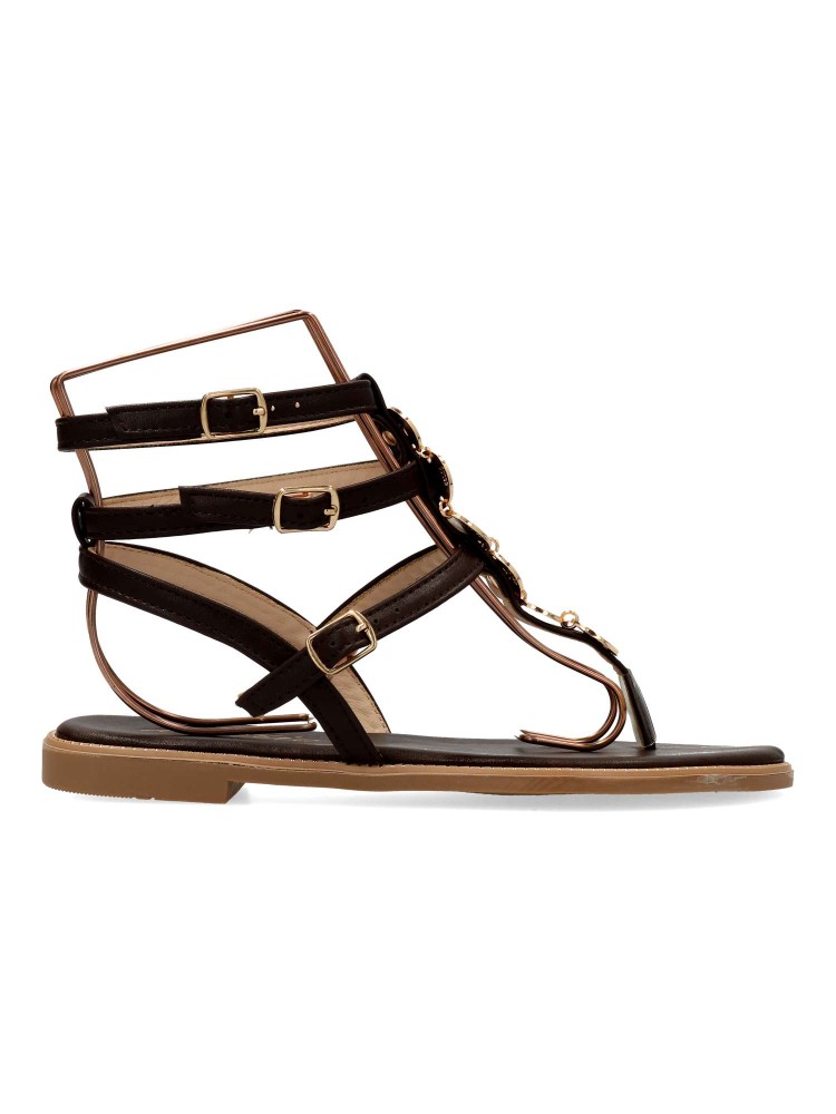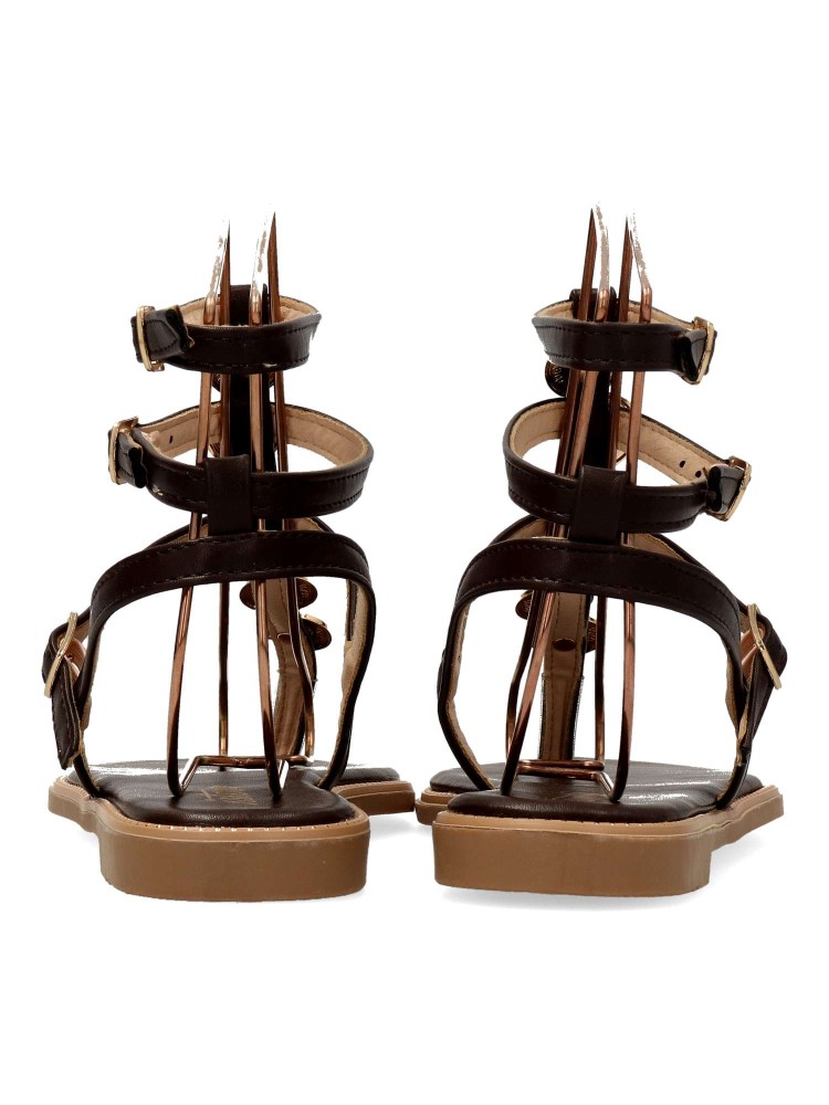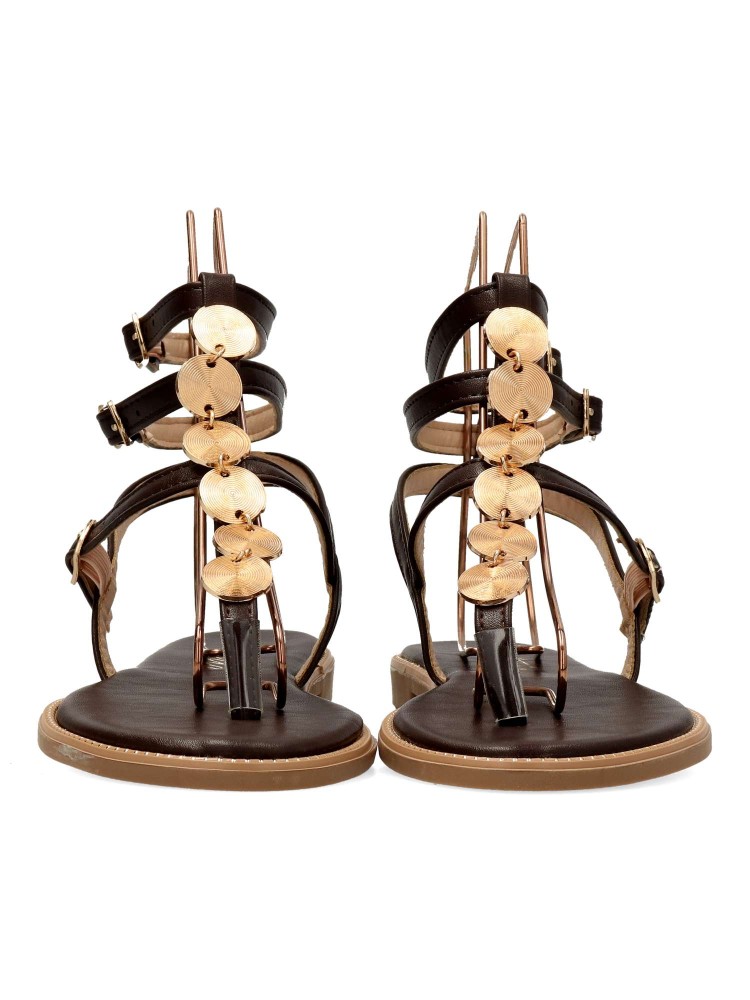 Sandalia de mujer, con ajuste de hebillas. Fabricada en material sintético, con detalles metatilados. Planta acolchada y suela de goma. Color moka. Sandalia versátil, cómoda y elegante, que podrás combinar con todos tus outfits. 100% vegano.