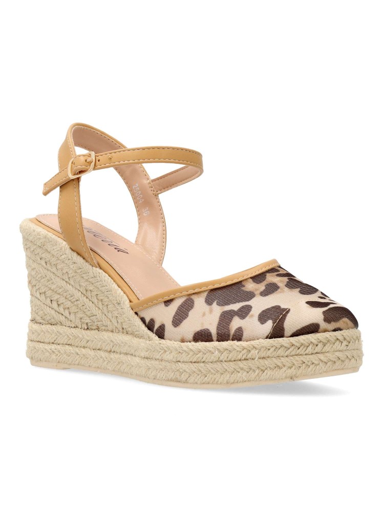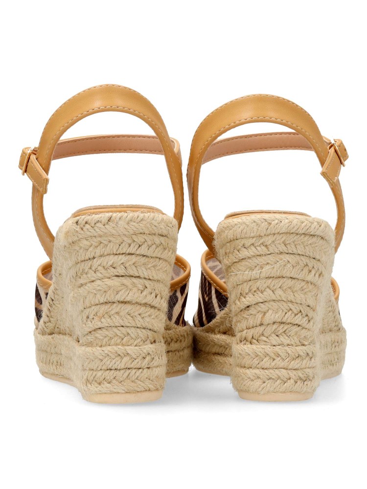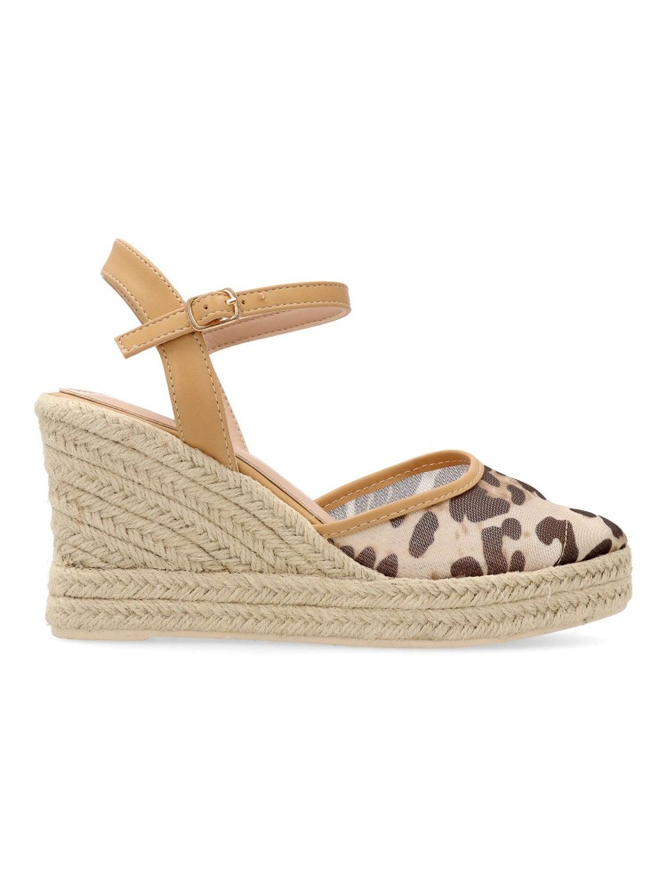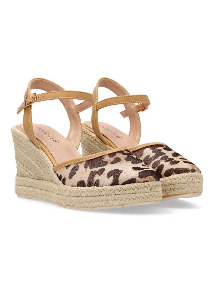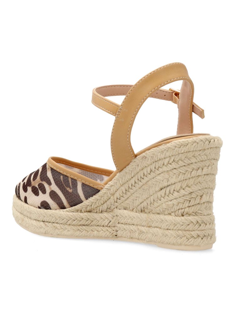 Sandalia esparteña yute de mujer. Cierre de hebilla al tobillo. Alpargata con transparencias y estampado leopardo. Suela de yute sobre goma. Cuña de 8,5 cm. Valenciana muy original para combinar con tus looks de temporada. 100% vegano.