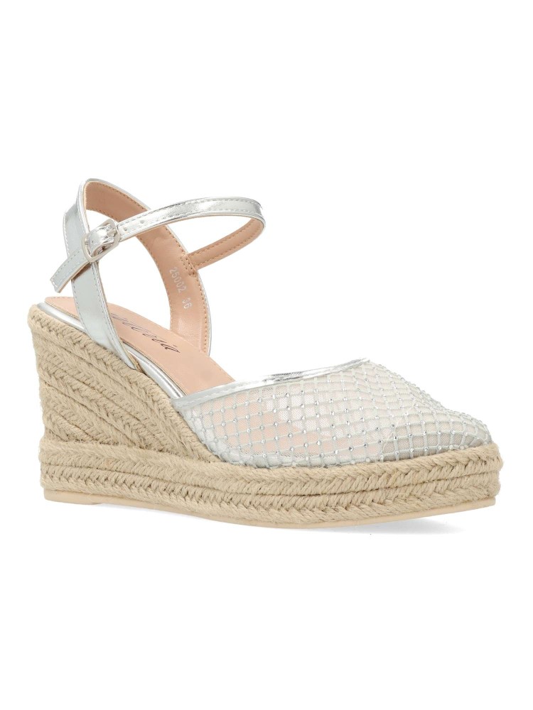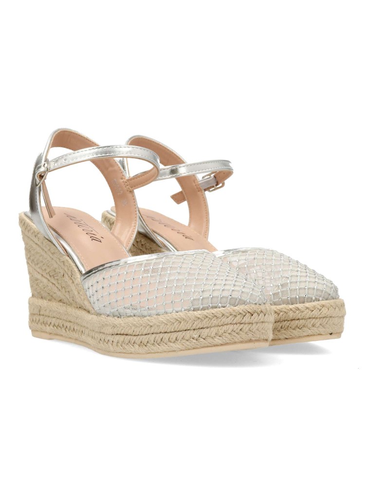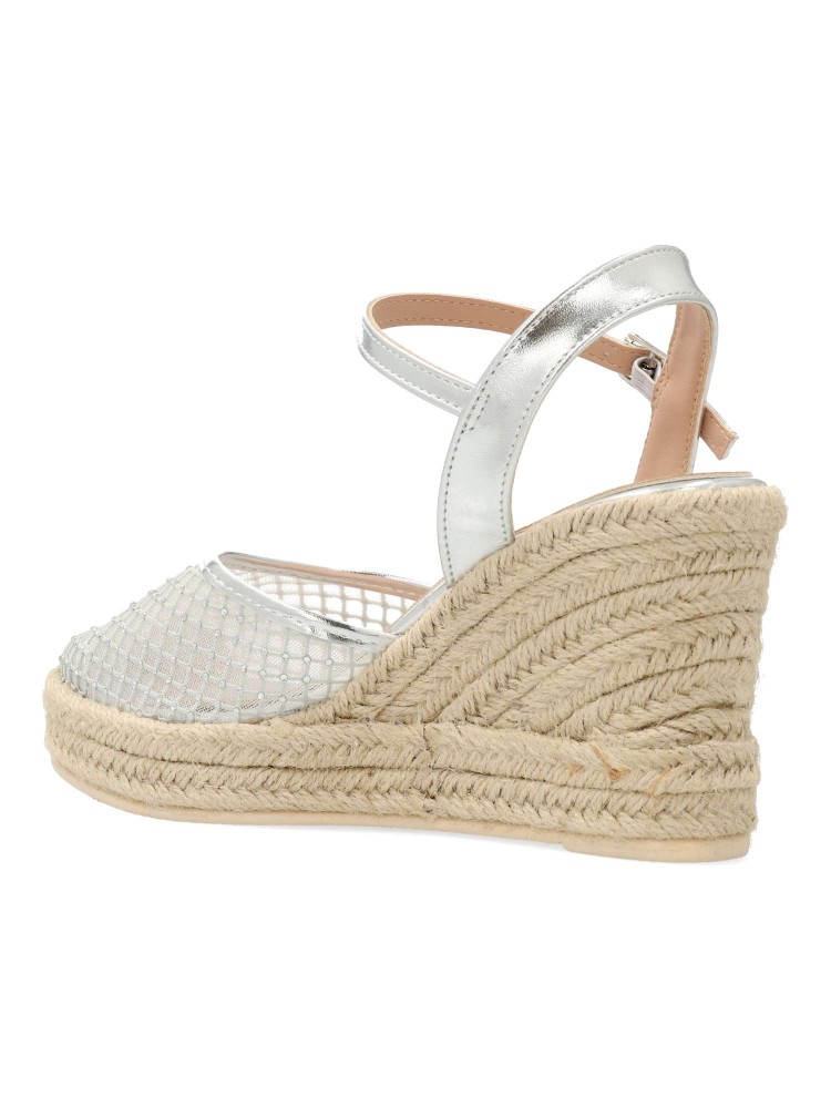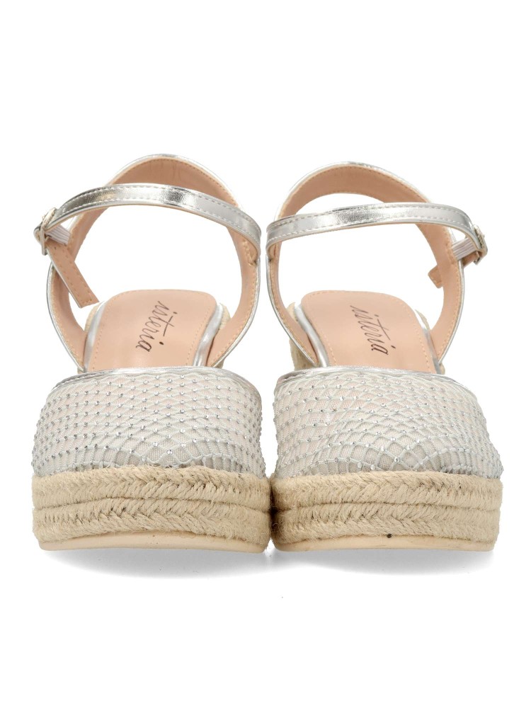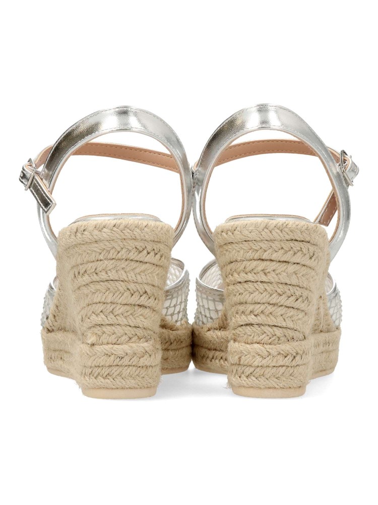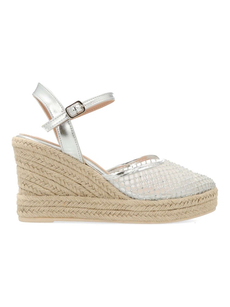 Sandalia esparteña yute de mujer. Cierre de hebilla al tobillo. Alpargata con transparencias en la pala y pedrería de brillo. Suela de yute sobre goma. Color plata. Cuña de 8,5 cm. Valenciana muy original para combinar con tus looks de verano. 100% vegano
