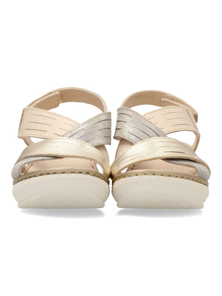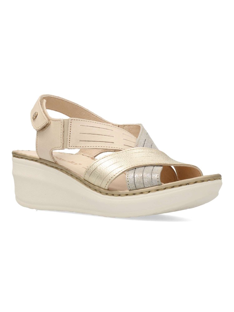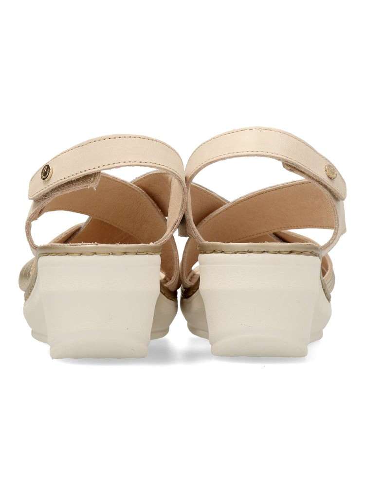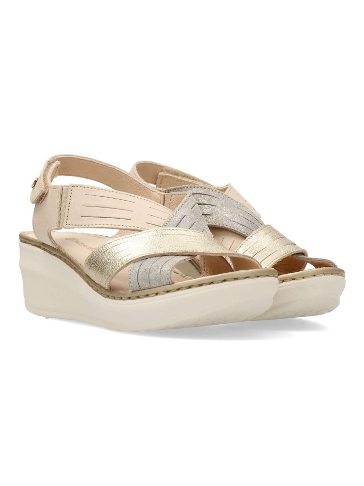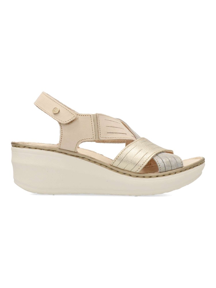 Sandalia cómoda de mujer. Cierre adherente al tobillo. Modelo de tiras cruzadas, fabricado en piel con suela de goma ligera y flexible. Planta acolchada. Forro interior de piel. Color beige. Altura cuña 5,5 cm. Diseño y confort en tus paseos de verano.