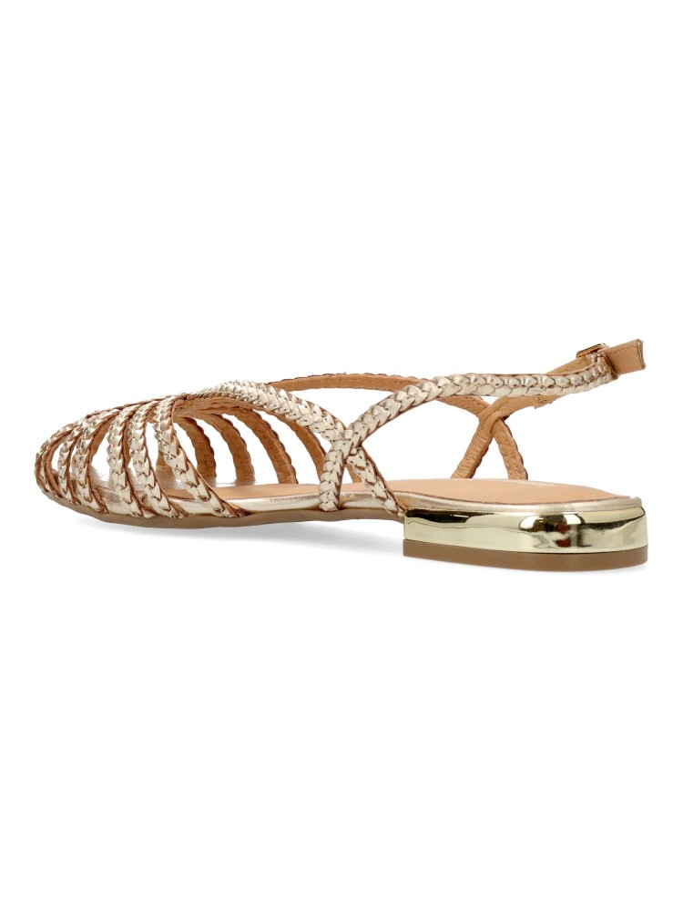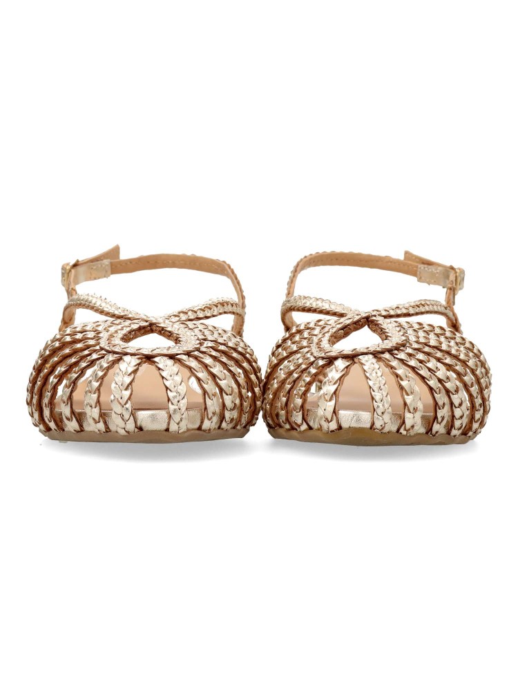 Sandalia mule para mujer. Modelo plano de tiras, fabricada en piel trenzada, con suela de goma. Cierre de hebilla al tobillo. Plantilla de piel suave y acolchada con látex. Diseño elegante, ideal para combinar con tus vestidos y faldas en verano.