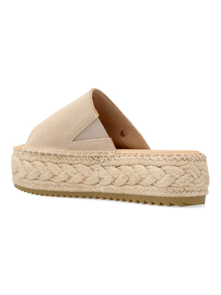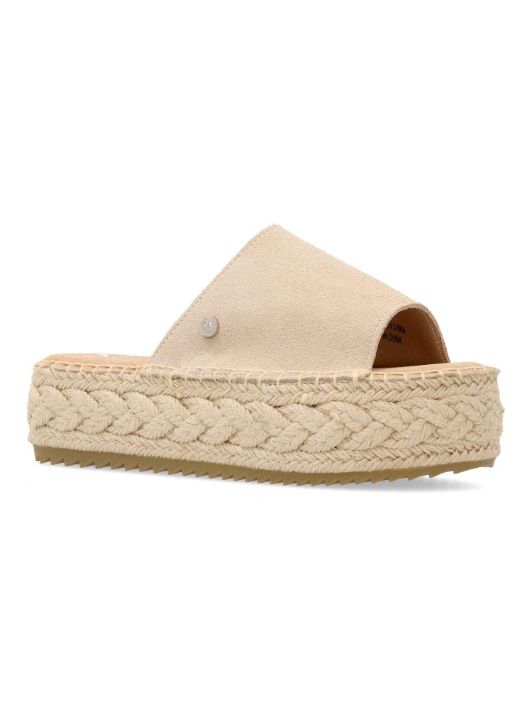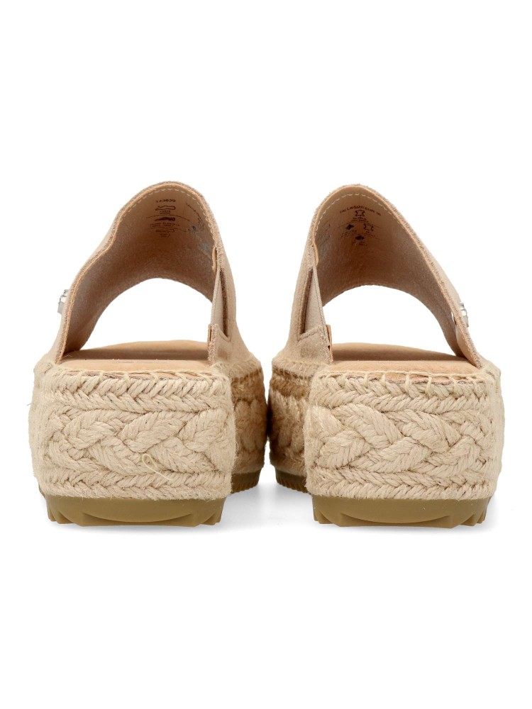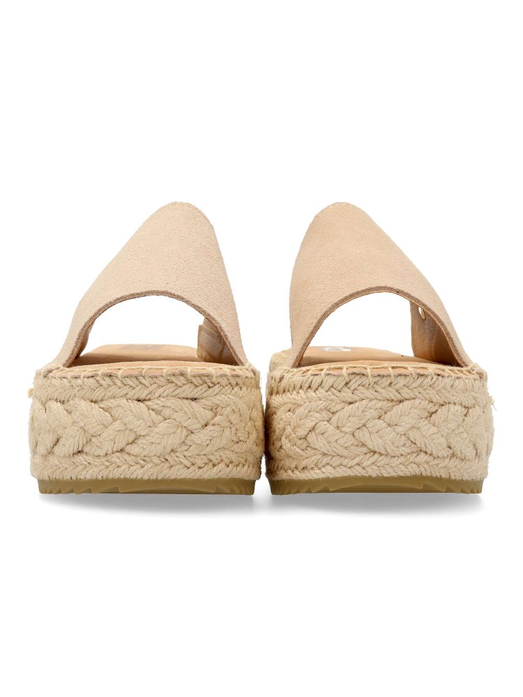 Sandalia de pala para mujer. Fabricado en piel serraje, con plataforma de yute sobre goma antideslizante. Planta acolchada. Color beige. Altura 5 cm. Una sandalia cómoda, original y versátil, ideal para combinar con tus outfits de esta temporada.