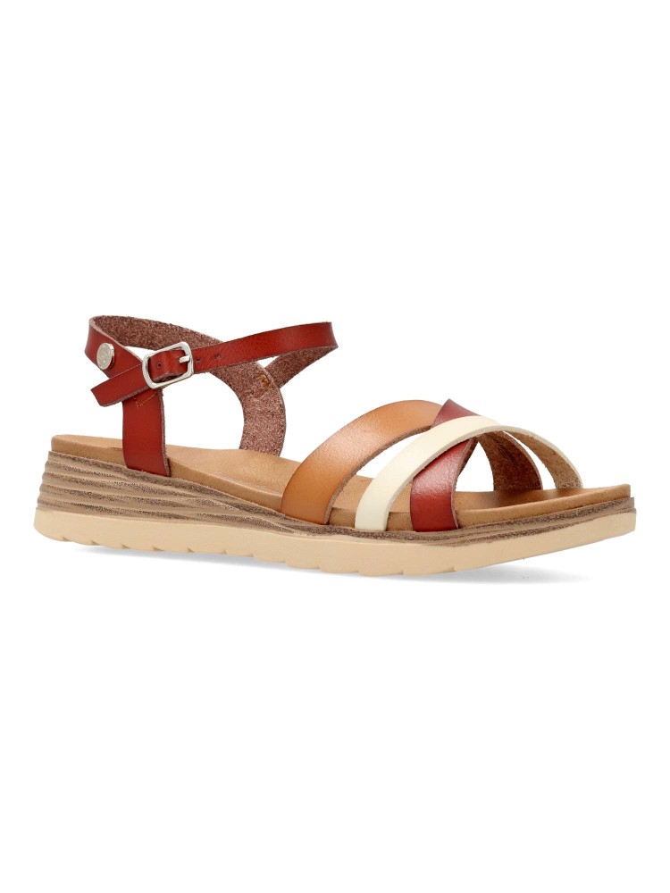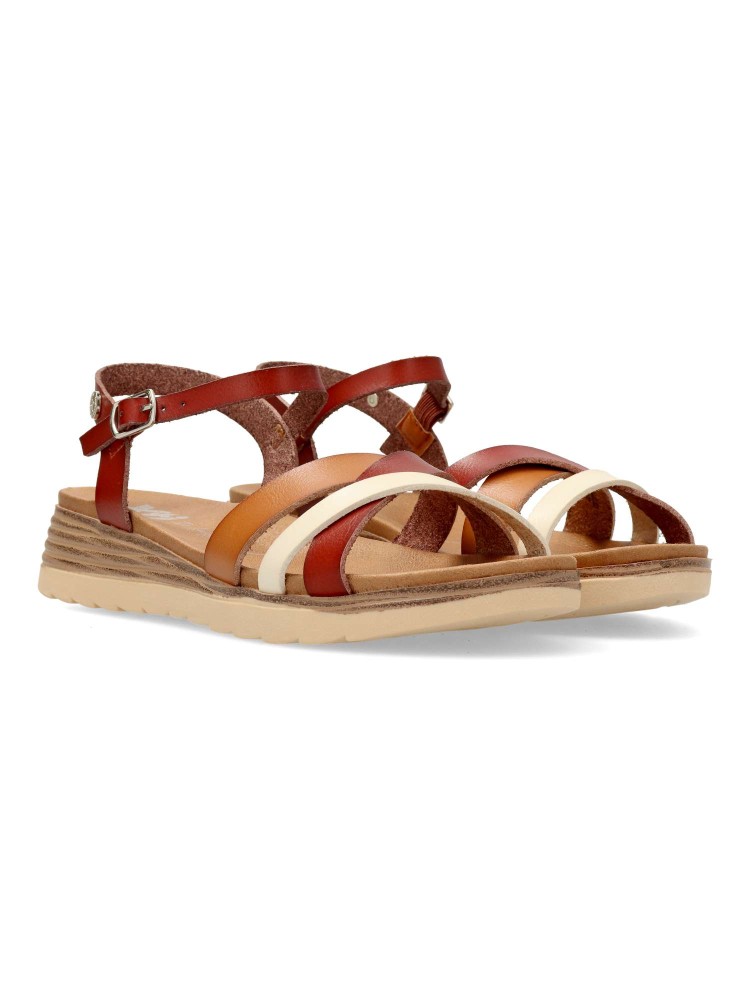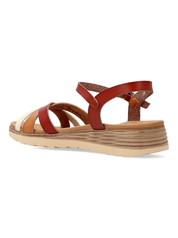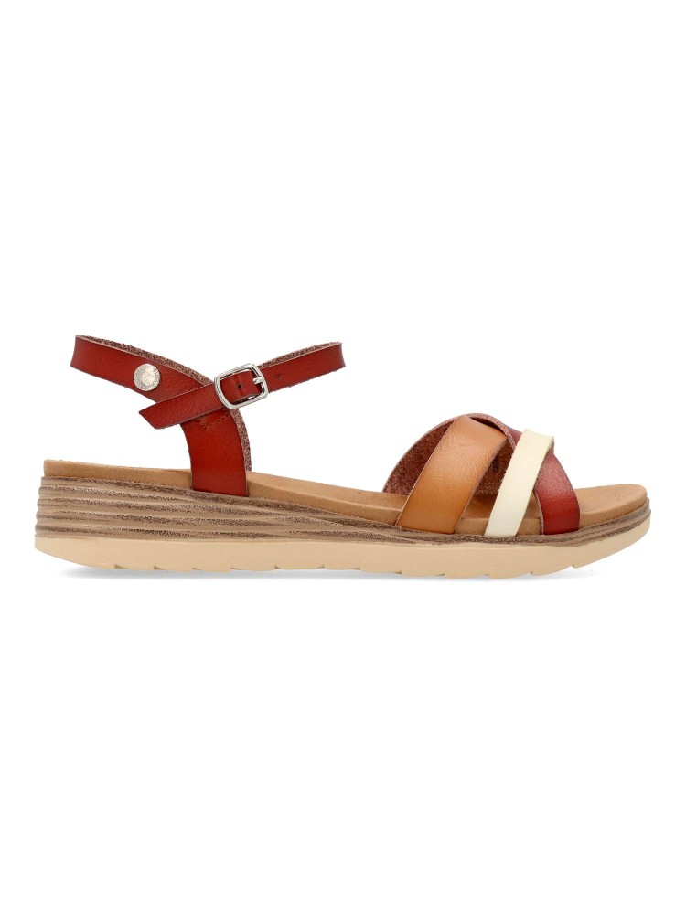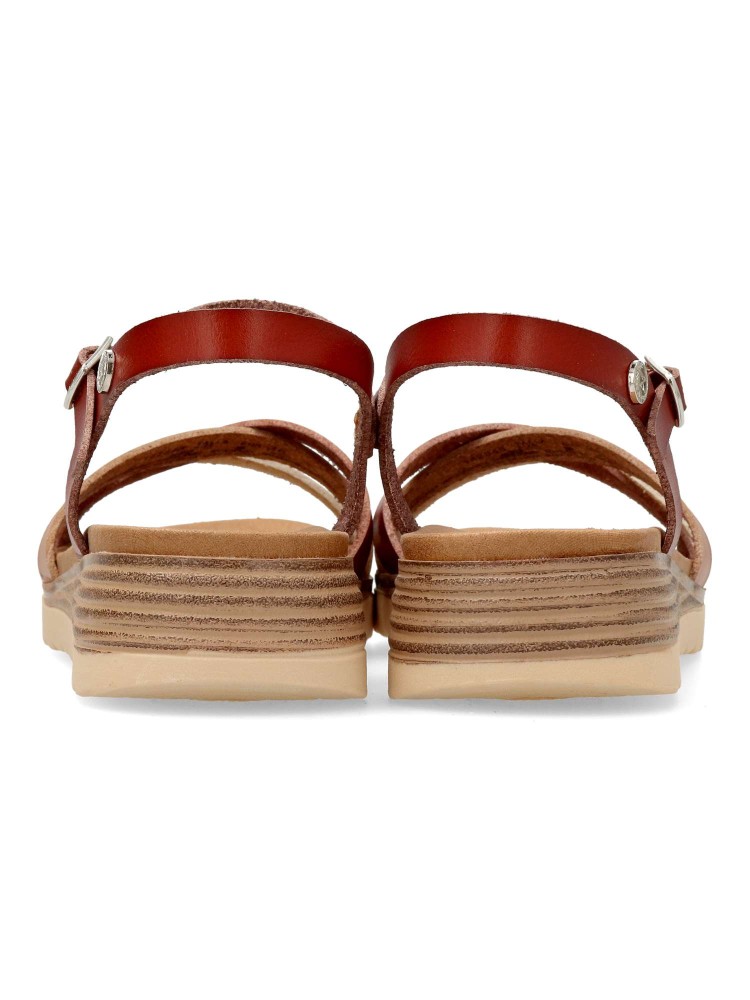 Sandalia con diseño de tiras cruzadas. Cierre de hebilla. Fabricada en material que imita la piel. Suela de goma antideslizante. Planta acolchada. Color camel. Altura cuña 3,5 cm. Diseño cómodo y versátil. Certificado vegano.