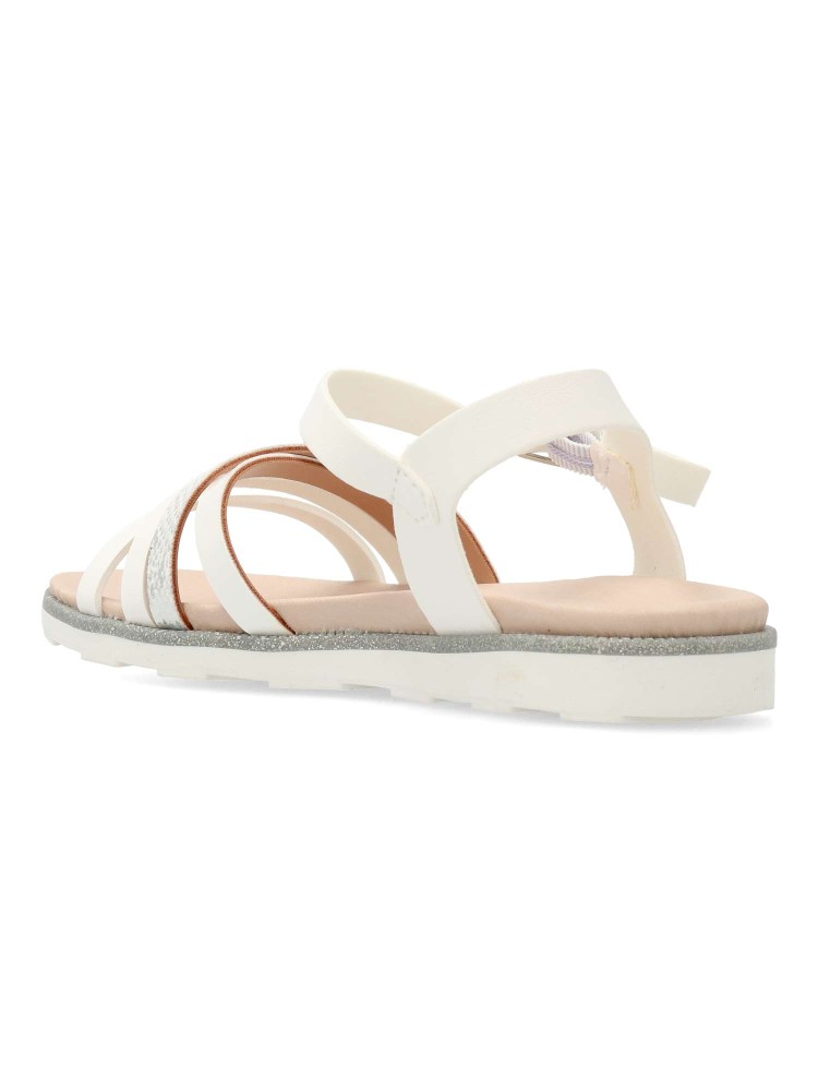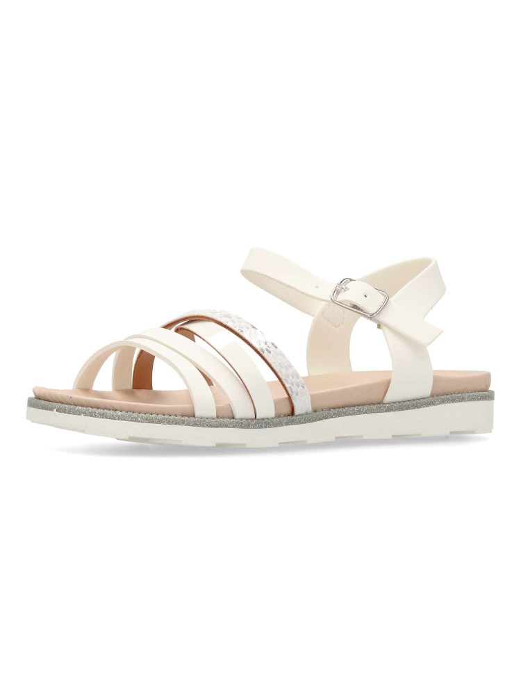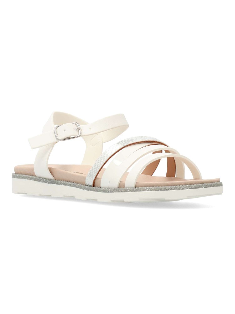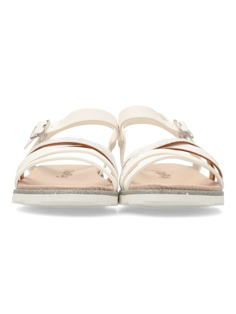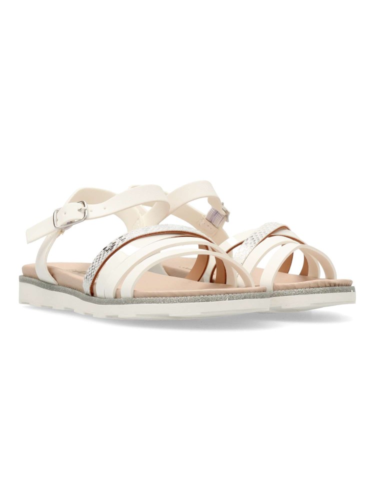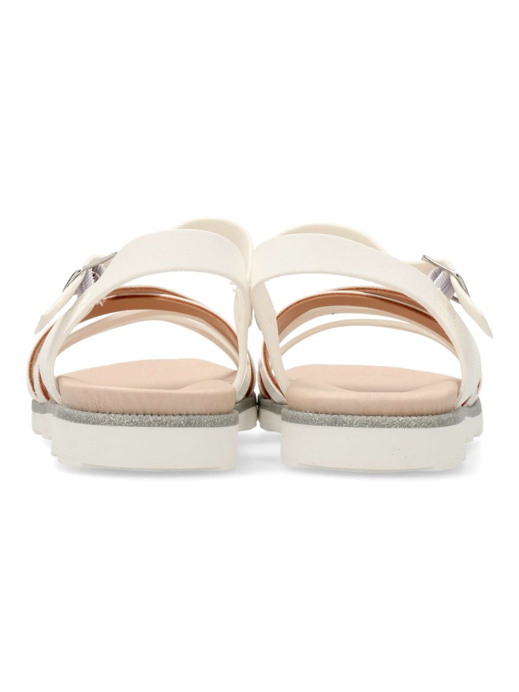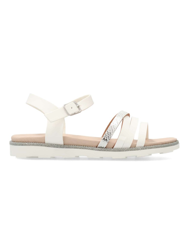 Sandalia de vestir de tiras. Cierre de hebilla. Modelo cómodo con planta acolchada. Fabricada en material sintético con suela de goma flexible. Color blanco. Diseñado para poder combinarlos con faldas, vestidos y conjuntos de verano.