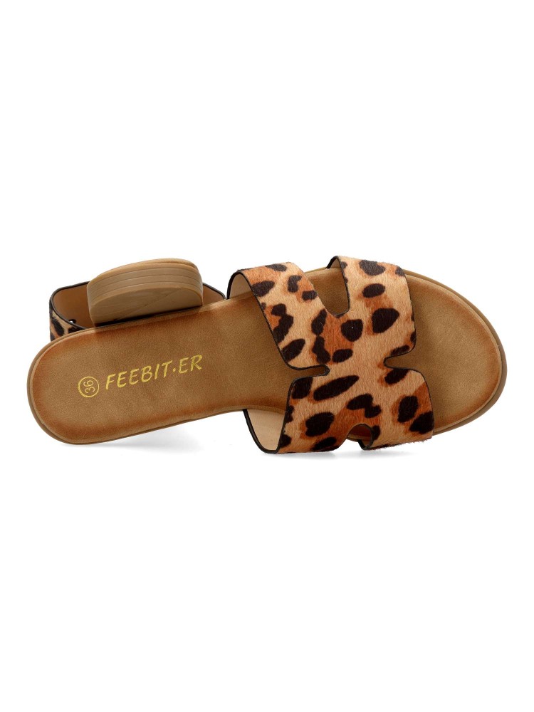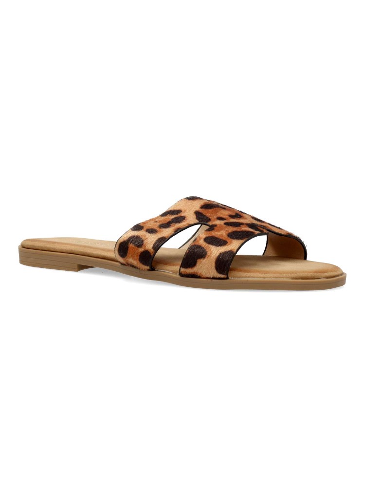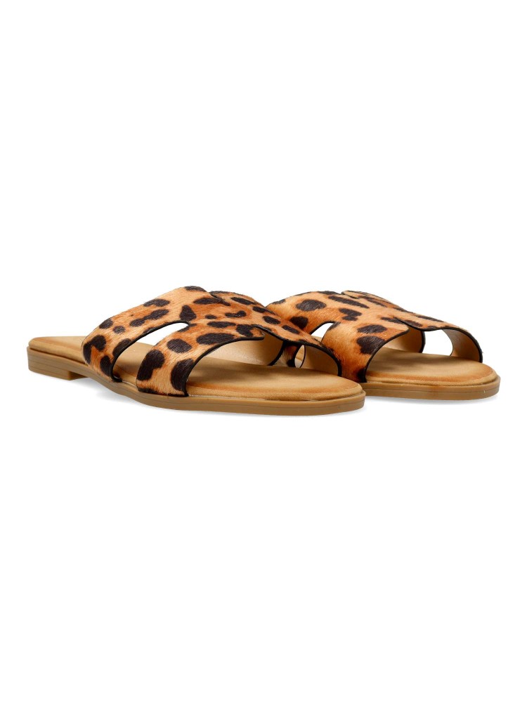 Sandalia plana de mujer. Modelo de pala, fabricada en piel sintética print leopardo, con suela de goma flexible. Planta acolchada. Diseño cómodo, elegante y fresco, fácil de combinar con todos tus looks de verano.
